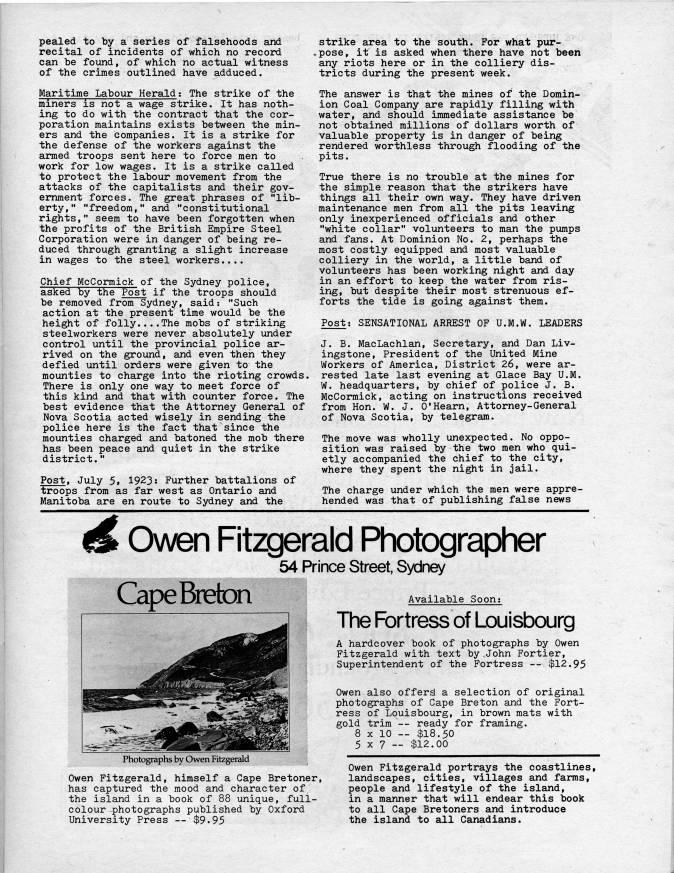 pealed to by a series of falsehoods and recital of incidents of which no record can be found, of which no actual witness of the crimes outlined have adduced. Maritime Labour Herald; The strike of the miners is not a wage strike. It has noth? ing to do with the contract that the cor? poration maintains exists between the min? ers and the companies. It is a strike for the defense of the workers against the armed troops sent here to force men to work for low wages. It is a strike called to protect the labour movement from the attacks of the capitalists and their gov? ernment forces. The great phrases of "lib? erty," "freedom," and "constitutional rights," seem to have been forgotten when the profits of the British Empire Steel Corporation were in danger of being re? duced through granting a slight increase in wages to the steel workers.... Chief McCormick of the Sydney police, asked by the Post if the troops should be removed from Sydney, said: "Such action at the present time would be the height of folly....The mobs of striking steelworkers were never absolutely under control until the provincial police ar? rived on the ground, and even then they defied until orders were given to the moxmties to charge into the rioting crowds. There is only one way to meet force of this kind and that with counter force. The best evidence that the Attorney General of Nova Scotia acted wisely in sending the police here is the fact that"since the mounties charged and batoned the mob there has been peace and quiet in the strike district." Post, July 5, 1923: Further battalions of troops from as far west as Ontario and Manitoba are en route to Sydney and the strike area to the south. For what pur- ,pose, it is asked when there have not been any riots here or in the colliery dis? tricts during the present week. The answer is that the mines of the Domin? ion Coal Company are rapidly filling with water, and should immediate assistance be not obtained millions of dollars worth of valuable property is in danger of being rendered worthless through flooding of the pits. True there is no trouble at the mines for the simple reason that the strikers have things all their own way. They have driven maintenance men from all the pits leaving only inexperienced officials and other "white collar" volunteers to man the pumps and fans. At Dominion No. 2, perhaps the most costly equipped and most valuable colliery in the world, a little band of volunteers has been working night and day in an effort to keep the water from ris? ing, but despite their most strenuous ef? forts the tide is going against them. Post; SENSATIONAL ARREST OF U.M.W, LEADERS J, B, MacLaohlan, Secretary, and Dan Liv? ingstone, President of the United Mine Workers of America, District 26, were ar? rested late last evening at Glace Bay U.M, W, headquarters, by chief of police J. B. McCormick, acting on instructions received from Hon. W. J. O'Hearn, Attorney-General of Nova Scotia, by telegram. The move was wholly unexpected. No oppo? sition was raised by the two men who qui? etly accompanied the chief to the city, where they spent the night in jail. The charge under which the men were appre? hended was that of publishing false news ($ Owen Fitzgerald Photographer 54 Prince Street, Sydney V'3.pC DUGtOri Available Soon: The Fortress of Louisbourg A hardcover book of photographs by Owen Fitzgerald with text by .John Fortier, Superintendent of the Fortress • $12.95 Owen also offers a selection of original photographs of Cape Breton and the Fort? ress of Louisbourg, in brown mats with gold trim • ready for framing. 8 x 10 • $18,50 5 X 7 • $12,00 Owen Fitzgerald portrays the coastlines, landscapes, cities, villages and farms, people and lifestyle of the island, in a manner that will endear this book to all Cape Bretoners and introduce the island to all Canadians. Photographs by Owen Fitzgerald Owen Fitzgerald, himself a Cape Bretoner, has captured the mood and character of. the island in a book of 88 unique, full- colour photographs published by Oxford University Press • $9.95