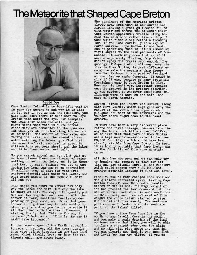 The Meteorite that Shaped Cape Breton Cape Breton Island is so beautiful that it is rare for anyone to ask why it is like it is. But if you do ask the question, you will find that there is much more to Cape Breton than meets the eye. For example, the Bras d'Or Lakes are salt, and you might think that this is quite normal since they are connected to the open sea. But when you start calculating the amount of rainfall, the amount of freshwater en? tering the Lakes, and the amount of sea water entering the Lakes, you find that the amount of salt required is about 2k million tons per year short, and the Lakes should be fresh water • not salt. So you search around and you find that at various places there are streams of brine welling up under the lake, and it is these that keep it .salt. Perhaps you get to won? dering how long you can go on extracting 2k million tons of salt per year from whatever deposit lies under the Lakes, and what would happen if the supply of salt did run out. Then maybe you start to wonder not only why the Lakes are salt, but why the lake is there at all. You may, like myself, put two and two together and come up with the answer of four, sometimes twenty-two de? pending on your mood, and think that your answer is right and may be interesting to other people and so you decide to write it all down, not with the idea, of course, of stating flatly that "This is the way it happened," but rather, "This is the way it might have happened." In the remote ages of the Earth, according to recent theories, all the great contin? ents were joined together in one huge land jnass, which finally broke up into the con? tinents which are known today. The continent of the Americas drifted slowly away from what is now Europe and Africa leaving a great gulf which filled with water and became the Atlantic Ocean. Cape Breton apparently trailed along be? hind the main mass rather like a chip of wood which rides along behind a floating log. If you look carefully at a map of North America, Cape Breton Island looks out of position; that is, it is almost at right singles to the main peninsula of Nova Scotia. It certainly does look as if it were a separately floating chip which didn't apply the brakes soon enough. The geology of Cape Breton, although very sim? ilar to Nova Scotia, is just different e- nough to make the separate chip theory tenable. Perhaps it was part of Scotland at one time or maybe Cornwall. It would be nice if it was, because so many Scots and Cornishmen came to Cape Breton to live. However, it isn't very important because once it arrived in its present position, it was subject to whatever geological in? fluences were at work on the main land mass of North America. Several times the Island was buried, along with Nova Scotia, under huge glaciers, the result of the various ice ages which ploughed off most of the mountains and the yoimger rocks right down to the basal granite. It must have been a very different place before the first ice-age, because from the way the basic rock tilts around Halifax, we believe that that part of Nova Scotia was a huge mountain • estimated to be over 20,000 feet high, which would have been clearly visible from Cape Breton. In fact, it is highly probable that Cape Breton was in the foothills of this huge mountain range. All this has now gone and we can only try to imagine the scenery of that far-off time and the titanic force of the glaciers which could scrape away a 20,000-foot granite mountain leaving it flat and level. Finally, the climate .changed once more and the glaciers retreated again, leaving Cape Breton free of ice. This had a peculiar effect on the Island. The huge weight of ice had pressed the land downward into the sea of molten rock which is underneath the earth's crust, and once relieved of this weight the whole island started to rise. But it did not rise evenly. The northern part rose much faster thain the southern part, so the island tilted. If you draw a line from Capstick in the north to say Capelin Cove in the south, and you make a scale drawing of the land contours under that line, you will be able to place a straight edge over the hills and no hill will rise above it. That is, you can clearly see that it was once flat and level but has now tilted. If you do