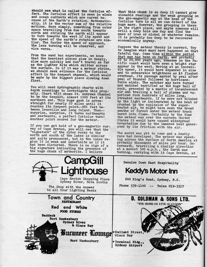 Published by Ronald Caplan on 1979/6/1 (431 reads)should see what is called the Coriolus ef? fect. The Coriolus effect is seen in winds and ocean currents which are curved be? cause of the Earth's rotation. Mathematic? ally, it is the vector sum of the relative motions. More simply, something from outer space travelling from due south towards north and striking the earth will appear to turn towards the west if its speed and the speed of the earth's rotation are sim? ilar. The faster the speed of approach, the less turning will be observed, and vice versa. From the sand box experiments, we know that the heaviest pieces plow in deeply, slow more quickly and don't travel as far as the lighter bits which skitter across the surface. So if it was a meteor strike, we should seek evidence for the Coriolus effect in the deepest channel, which would be made by the biggest piece slowing down first. You will need hydrographic charts with depth soundings to investigate this prop? erly. Chart 4833 shows St. Andrews Channel to be the deepest, almost 1000 feet at its northern end. This huge gash is arrow- straight for nearly 20 miles until it reaches its deepest point • 981 feet be? tween Ironville and Long Island. Then • surprise, surprise, it turns northwards and westwards, a perfect Coriolus turn! Another point scored for the meteor. If you can get hold of a geo-magnetic sur? vey of Cape Breton, you will see that the "signature" of the older rocks to the north and south of the lakes is similar and quite pronounced, but in the lakes re? gion it is weak and indefinite as if it had been disturbed. There is no sign of a big signature indicating the presence of the huge chunk of meteorite. I believe that this chunk is so deep it cannot give sizeable readings and the weak grouping on the geo-magnetic map at the head of the Coriolus turn is all we can detect of the huge mass. However, the grouping is there in the right place, and maybe someone will drill a deep hole one day and find the mass of iron or nickel or whatever remains. It is probably too deep to be recovered economically anyway. Suppose the meteor theory is correct. Try to imagine what must have happened on that fateful day. Some time within the period that man has been on Earth, and probably 10 to 20,000 years ago, someone on the Pa? cific coast would have seen a bright star appear in the west. Moving at an incredi? ble speed, it would have expanded in size and to unbearable brightness as It flashed overhead, its passage marked by peal after peal of thunder followed by hurricane- force winds. The watcher may have turned and watched terrified as the huge ball of rock, preceded by a mantle of incandescent air and trailing a tail of plasma and va? porized rock hundreds of miles long, streaked eastwards. If he were not blinded by the light or incinerated by the heat or crushed by the explosion of the super? heated air, he might have seen the broad swathe of forest under the meteor track burst into flame. Certainly by the time the meteor was over the eastern United States it would have caused widespread devastation due to the immense heat gener? ated by its friction with the air. The worst was yet to come and a deadly race had developed. The meteor was speed? ing across the surface of North America at probably thousands of miles per hour. Un? derneath, travelling a similar direction at a modest 500 m.p.h., the Earth was turning, carrying with it Cape Breton, at CampGill Lighthouse Cape Breton Shopping Plaza Sydney River, Nova Scotia The Shop with the Answer to all Your Lighting Needs Genuine Down East Hospitality Keddy' Motor Irm 600 King's Road, Sydney, N.S. Phone 539-1140 • Telex 019-351? Town and Country RBSTAURANT Red ond White POW STORBS Baddeck Port Hawkesbury Sydney River & Glace Bay 0. GOLDMAN & SONS LTO. "THt HOMKOK UNK .SKAFOOD*' Fort Hawkesbury