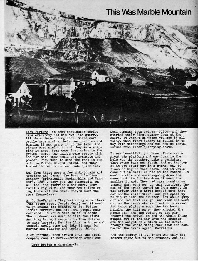 Published by Ronald Caplan on 1979/6/1 (1196 reads)This Vfes Marble Mountain Alex Fortune; At that particular period here everybody had his own lime quarry. All these farms along here, there were people here mining their own quarries and burning it and using it on the land. And others were mining it and they were ship? ping it away. Some were just holes in the ground; some, the cliffs were pretty high. And for this they could use dynamite and powder. They used to send the rock in ves? sels to Prince Edward Island, and they burned it over there and made quicklime. And then there were a few individuals got together and formed the Bras d'Or Lime Company (principally MacLaughlin and Saun? ders, 1884). They got the concession on all the lime quarries along here. They built a big kiln. And they had a fire go? ing there all the time. They'd burn the rock themselves. A. D. MacFadyen; They had a big scow there (the steam scow, Jessie Gray) and it used to go aroimd the country to St. Peters, Little Narrows, and all • and people made cordwood. It would take 30 or 50 cords. The cordwood was used to fire the kilns. And they brought coopers in from Halifax to make barrels. Put the lime in those and vessels would come and take it away for mortar and plaster and various things. Alex Fortune; Then around 1902 the steel company came in here • Dominion Steel and Cape Breton's Magazine/24 Coal Company from Sydney • DOSCO • and they started their first quarry down at the shore. It wasn't up where you see it all today. That first quarry is filled in to? day with screenings and mud and so forth. Refuse from later quarrying above. It was beautiful, you know. There was a great big platform and way down in the hole was the crusher, like a pendulum, that swung back and forth. And at the top of it you could put in a stone, oh, 10 times as big as that stove--and it would come out in small chunks at the bottom. It would rumble and smash • going down the cone • and the further down it went the smaller it got. They had cars running on tracks that went out on this platform. The end of the track turned up in a curve. So the driver with a horse hooked onto that car on the rails there • and got speed up to tip it into the crusher. You would jump off and let that car go. And when she went out on the track she went out on a swivel. And these plates struck the two hooks holding the tail gate • they knocked the hooks off • and the weight of the car brought the swivel up and the whole thing dumped out of the car into the crusher • and the weight of a stick on the swivel brought the whole thing back down and con? nected the track again. Marvelous. And the beauty of it! There was only two ,tracks going out to the crusher. And all
