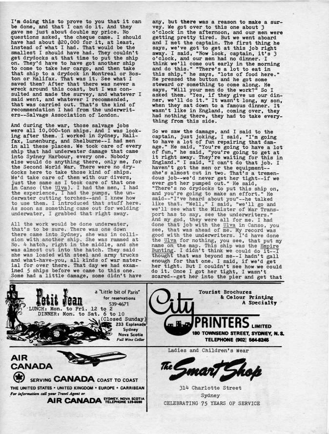 Published by Ronald Caplan on 1979/6/1 (237 reads)I'm doing this to prove to you that it can be done, and that I can do it. And they gave me just about double my price. No questions asked, the cheque came. I should have had about '20,000 for it, at least, instead of what I had. That would be the smallest I should have had. They couldn't get drydocks at that time to put the ship on. They'd have to have got another ship to come to take her cargo, and then take that ship to a drydock in Montreal or Bos? ton or Halifax. That was it. See what I saved them? After that there was never a wreck around this coast, but I was con? sulted and made the survey, and whatever I said ,went, and whatever I recommended, that was carried out. That's the kind of recommendation I had from the underwrit? ers • Salvage Association of London. And during the war, those salvage jobs were all 10,000-ton ships. And I was look? ing after them. I worked in Sydney, Hali? fax, Lunenburg, and Shelburne • I had men in all these places. We took care of every ship that had underwater damage that came into Sydney Harbour, every one. Nobody else would do anything there, only me, for the Second World War. There were no dry- docks here to take those kind of ships. We'd take care of them with our divers, just the same as I took care of that one in Canso (the Ulva). I had the men, I had the experience, I had the pumps, the un? derwater cutting torches • and I knew how to use them. I introduced that stuff here. As soon as something came out for welding underwater, I grabbed that right away. All the work would be done underwater, that's to be sure. There was one down there came into Sydney, she was in colli? sion with another ship. She was rammed at No. k hatch, right in the middle, and she was almost cut into the hatch. They said she was loaded with steel and army trucks and what-have-you, all kinds of war mater? ial for over there. That day we had exam? ined 5 ships before we came to this one. Some had a little damage, some didn't have any, but there was a reason to make a sur? vey. We got over to this one about 3 o'clock in the afternoon, and our men were getting pretty tired. But we went aboard and I met the captain. The first thing he says, we've got to get at this job right away. I said, "Now look, captain, it's 3 o'clock, and our men had no dinner. I think we'll come out early in the morning and do this." "There's a lot to eat in this ship," he says, "lots of food here." He pressed the button and he got some steward or something to come along. He says, "Will your men do the work?" So I asked them. "Yes, if they give us our din? ner, we'll do it." It wasn't long, my son, when they sat down to a famous dinner. It wasn't like in England, coming over, they had nothing there, they had to take every? thing from this side. So we saw the damage, and I said to the captain, just joking, I said, "I'm going to have a lot of fun repairing that dam? age." He said, "You're going to have a lot of fun," he said, "you're going to get at it right away. They're waiting for this in England." I said, "I can't do that job. I haven't got the men or the equipment • she's almost cut in two. That's a tremen? dous job • we'd never get her tight • if we ever got her pumped out." He said, "There's no drydocks to put this ship on, and you're going to make an effort." He said • "I've heard about you" • he talked like that. "Well," I said, "we'll go and we'll see what the Minister of War Trans? port has to say, see the underwriters." And my god, they were all for me. I had done that job with the Ulva in Canso, you see, that was ahead of me. My record was good with the underwriters. I'd have done the Ulva for nothing, you see, that put my name on the map. This ship was the Empire Bunting. I didn't think we could do it • I thought that was beyond me • I hadn't gall enough for that one. I said, if we'd get her tight. But I couldn't see how we could do it. Once I got her tight, I wasn't scared • get her into the pier and get that a ittle bit of Paris" for reservations 539-4671 2 to 10 sed Sunday) 233 Esplanade Sydney Nova Scotia FuU Wine Cellar Tourist Brochures & Colour Printing A Specialty PRINTERS LIMITED 180 TOWNSENO STREET, SYDNEy;N.S. TELEPHONE (902: 56M24S AIR CANADA Ladies and Children's Wear Se ? SERVING CANADA COAST TO COAST CARRIBEAN THE UNITED STATES • UNITED KINGDOM • EUROPE Finr mformation c??ff your Travel Agent or ikID f'A9iiAr??k SYONCY. NOVA SCOTIA MIK V##IM/UM TCLEFHONC S394CM 31' Charlotte Street Sydney CELEBRATING 75 YEARS OF SERVICE