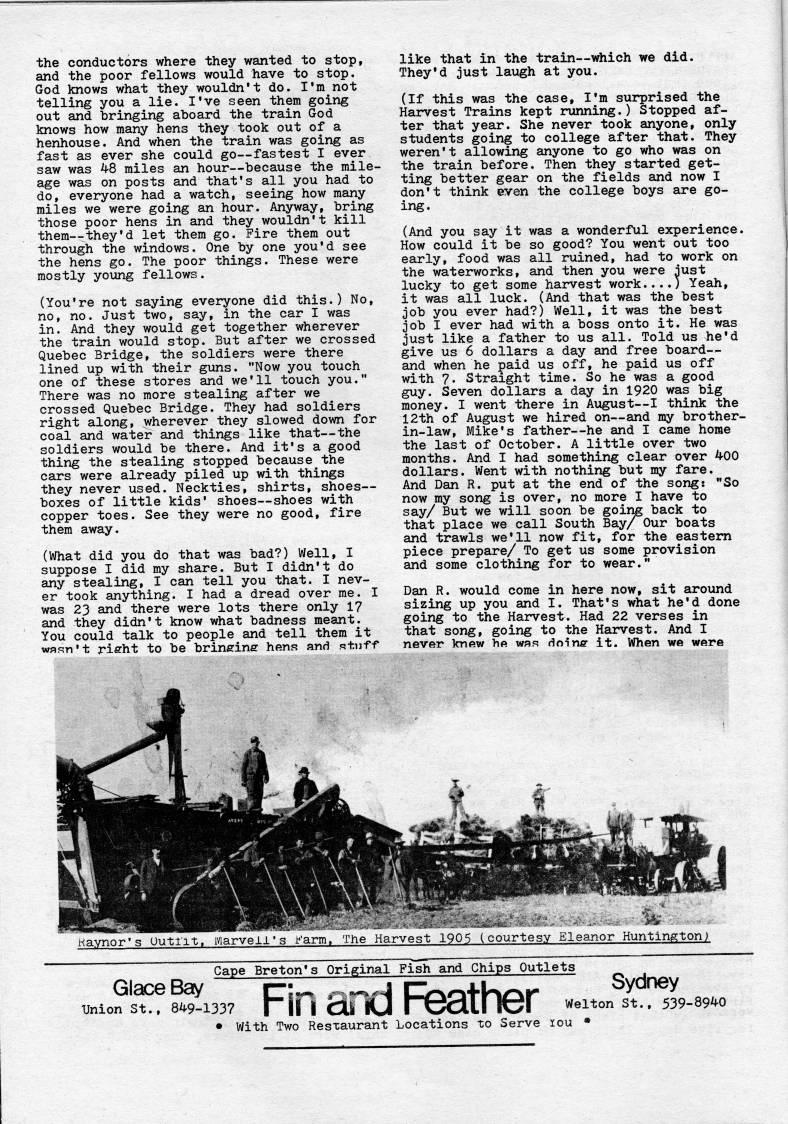 Published by Ronald Caplan on 1979/8/1 (268 reads)the conductors where they wanted to stop, and the poor fellows would have to stop. God knows what they wouldn't do. I'm not telling you a lie. I've seen them going out and bringing aboard the train God knows how many hens they took out of a henhouse. And when the train was going as fast as ever she could go • fastest I ever saw was 48 miles an hour • because the mile? age was on posts and that's all you had to do, everyone had a watch, seeing how many miles we were going an hour. Anyway, bring those poor hens in and they wouldn't kill them • they'd let them go. Pire them out through the windows. One by one you'd see the hens go. The poor things. These were mostly young fellows. (You're not saying everyone did this.) No, no, no. Just two, say, in the car I was in. And they would get together wherever the train would stop. But after we crossed Quebec Bridge, the soldiers were there lined up with their guns. "Now you touch one of these stores and we'll touch you." There was no more stealing after we crossed Quebec Bridge. They had soldiers right along, wherever they slowed down for coal and water and things like that • the soldiers would be there. And it's a good thing the stealing stopped because the cars were already piled up with things they never used. Neckties, shirts, shoes • boxes of little kids' shoes • shoes with copper toes. See they were no good, fire them away. (What did you do that was bad?) Well, I suppose I did my share. But I didn't do any stealing, I can tell you that. I nev? er took anything. I had a dread over me. I was 23 and there were lots there only 17 and they didn't know what badness meant. You could talk to people and tell them it wasn't riffht to be brineine hens and Rtuff like that in the train • which we did. They'd just laugh at you. (If this was the case, I'm surprised the Harvest Trains kept running.) Stopped af? ter that year. She never took anyone, only students going to college after that. They weren't allowing anyone to go who was on the train before. Then they started get? ting better gear on the fields and now I don't think even the college boys are go? ing* (And you say it was a wonderful experience. How could it be so good? You went out too early, food was all ruined, had to work on the waterworks, and then you were just lucky to get some harvest work....) Yeah, it was all luck. (And that was the best job you ever had?) Well, it was the best job I ever had with a boss onto it. He was just like a father to us all. Told us he'd give us 6 dollars a day and free board • and when he paid us off, he paid us off with 7? Straight time. So he was a good guy. Seven dollars a day in 1920 was big money. I went there in Avigust • I think the 12th of August we hired on • and my brother- in-law, Mike's father • he and I came home the last of October. A little over two months. And I had something clear over 400 dollars. Went with nothing but my fare. And Dan R. put at the end of the song: "So now my song is over, no more I have to say/ But we will soon be goir' back to that place we call South Bay/'Our boats and trawls we'll now fit, for the eastern piece prepare/ To get us some provision and some clothing for to wear." Dan R. would come in here now, sit around sizing up you and I. That's what he'd done going to the Harvest. Had 22 verses in that song, going to the Harvest. And I never knew hfi was cinins it. When we were Kaynor's Outlit, ??BBIi''''SM.'C2''!J'5-:i''. ?? Marvell's Farm, The Harvest 1905 (courtesy A lileanor Huntington; Cape Breton's Original Fish and Chips Outlets Glace Bay Union St., 849-1337 Fin and Feather Sydney Welton St., 539-8940 • With Two Resxaurant Locations to Serve lou