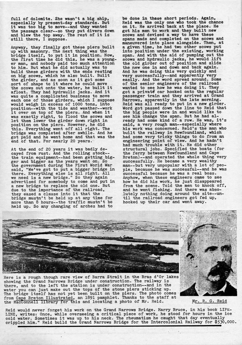 Published by Ronald Caplan on 1979/8/1 (618 reads)full of dolomite. She wasn't a big ship, especially by present-day standards. But it was too big to move • and they wanted the passage clear • so they put divers down and blew the top away. The rest of it is still there, I suppose. Anyway, they finally got these piers built up with masonry. The next thing was the bridge itself, to put it in position. Now, the first time he did this, he was a young? er man, and nobody paid too much attention to him. But what he did actually was to build these girders with the ends resting on big scows, which he also built. Built the girder, and as soon as it got some sort of shape to it where he could move the scows out onto the water, he built it afloat. They had hydraulic jacks. And it was quite a complicated business to move each one of those girders, which I suppose would weigh in excess of 1000 tons, into position • with the tide and weather • work it over on top of the piers. And when it was exactly right, to flood the scows and let them lower the girder down right in position on the piers. However, he did this. Everything went off all right. The bridge was completed after awhile. And he got paid and he went home and that was the end of that. For nearly 20 years. At the end of 20 years it was badly de? cayed from rust. And the rolling stock • the train equipment • had been getting big? ger and bigger as the years went on. So the government during the First World War said, "We've got to put a bigger bridge in there. Everything else is all right. All we need is a new bridge." So they again advertised for somebody to come and put in a new bridge to replace the old one. But due to the importance of the railroad, they eased a clause into it that the bridge mustn't be held up at any time for more than 8 hours • the traffic mustn't be held up. So any changing of arches had to be done in these short periods. Again, Reid was the only one who took the chance on it. He arrived back at the place. He got his men to work and they built new scows and devised a way to have these spans made and completed on the scows and maneuvered into place alongside. Then, at a given time, he had two other scows put into position under the existing, working span. And with the aid of pumping out the scows and hydraulic jacks, he would lift the old girder out of position and slide the new one in and down and back again. And he was doing this very quickly and very successfully • and apparently very easily. And the word spread around. Some of the senior engineers of the railroad wanted to see how he was doing it. They got a private car hooked onto the regular passenger train and they arrived at Grand Narrows, apparently in the late morning. Reid was all ready to put in a new girder. Word got passed down the line to Reid that the big people were in and would like to see him change the span. But he had al? ready had some kind of a row. He was, it's said, a very rough man • especially where his work was concerned. Reid's the man who built the railway in Newfoundland, which had some very tricky things to do from an engineering point of view. And he hadn't had much trouble with it. He did other structural jobs. Specified the boats (for the ferry between Newfoundland and Cape Breton) • and operated the whole thing very successfully. He became a very wealthy man • but very unpopular with a lot of peo? ple, because he was successful • and he was successful because he was a real boss. Anyhow, when these engineers came to see how he did his work, he just disappeared from the scene. Told the men to knock off, and he went fishing. And there was abso? lutely nothing doing around the site • un? til the railroad engineers got fed up, hooked up their car and went away. Here is a rough though rare view of Barra Strait in the Bras d'Or lakes showing the Grand Narrows Bridge under construction. The railway is there, and to the left the station is under construction • and in the water you can just make out the tops of the stone piers sticking up. The bridge itself has not yet been built on the piers. The photo comes ?? from Cape Breton Illustrated, an 1891 pamphlet. Thanks to the staff at the MacConnell library for this and locating a photo of Mr. Reid. Reid would never forget his work on the Grand Narrows Bridge. Harry Bruce, in his book LIFE? LINE, v/rites: Once, while overseeing a critical piece of work, he stood for hours in the ice cold water. Sometimes it was up to his neck. The rheumatism he caught that day eventually crippled him." Reid build the Grand Narrows Bridge for the Intercolonial Railway for $530,000.
