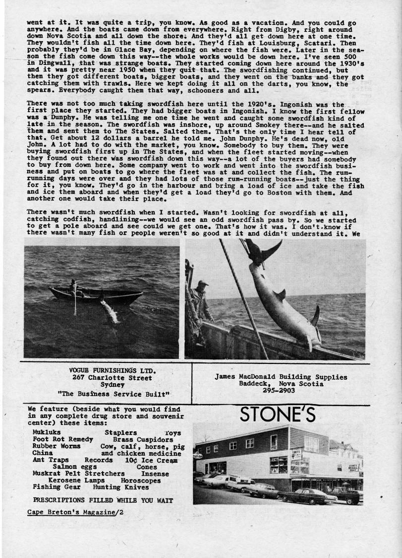 Published by Ronald Caplan on 1973/5/1 (1082 reads)went at it. It was quite a trip, you know. As good as a vacation. And you could go anywhere. And the boats came down from everywhere. Right from Digby, right around down Nova Scotia and all down the shore. And they'd all get down here at one time. They wouldn't fish all the time down here. They'd fish at Louisburg, Scatari. Then probably they'd be in Glace Bay, depending on where the fish were. Later in the sea? son the fish come down this way • the whole works would be down here. I've seen 500 in Dingwall, that was strange boats. They started coming down here around the 1930's and it was pretty near 1950 when they quit that. The swordfishing continued, but then they got different boats, bigger boats, and they went on the banks and they got catching them with trawls. Here we kept doing it all on the darts, you know, the spears. Everybody caught them that way, schooners and all. There was not too much taking swordfish here until the 1920's. Ingonish was the first place they started. They had bigger boats in Ingonish. I know the first fellow was a Dunphy. He was telling me one time he went and caught some swordfish kind of late in the season. The swordfish was inshore, up around Smokey there • and he salted fhem and sent them to The States. Salted them. That's the only time I hear tell of that. Get about 12 dollars a barrel he told me. John Dunphy. He's dead now, old John. A lot had to do with the market, you know. Somebody to buy them. They were buying swordfish first up in The States, and when the fleet started moving • when they found out there was swordfish down this way • a lot of the buyers had somebody to buy from down here. Some company went to work and went into the swordfish busi? ness and put on boats to go where the fleet was at and collect the fish. The rum- running days were over and they had lots of those rum-running boats • just the thing for it, you know. They'd go in the harbour and bring a load of ice and take the fish and ice them aboard and when they'd get a load they'd go to Boston with them. And another one would take their place. There wasn't much swordfish when I started. Wasn't looking for swordfish at all, catching codfish, handlining • we would see an odd swordfish pass by. So we started to get a pole aboard and see could we get one. That's how it was. I don't.know if there wasn't many fish or people weren't so good at it and didn't understand it. We VOGUE FURNISHINGS LTD. 267 Charlotte Street Sydney "The Busihess Service Built" James MacDonald Building Supplies Baddeck, Nova Scotia 295-2903 STONE'S We feature (beside what you would find in any complete drug store and souvenir center) these items: Mukluks Staplers Toys Foot Rot Remedy Brass Cuspidors Rubber Worms Cow, calf, horse, pig China and chicken medicine Ant Traps Records 10' Ice Cream Salmon eggs Cones Muskrat Pelt Stretchers Insense Kerosene Lamps Horoscopes Fishing Gear Hunting Knives PRESCRIPTIONS FILLED WHILE YOU WAIT Cape Breton's Magazine/2