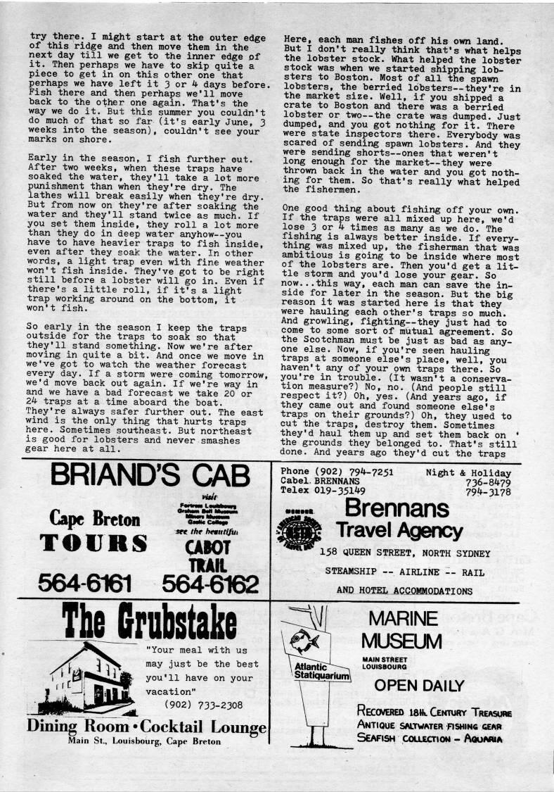 Published by Ronald Caplan on 1979/8/1 (260 reads)try there. I might start at the outer edge of this ridge and then move them in the next day till we get to the inner edge pf it. Then perhaps we have to skip quite a piece to get in on this other one that perhaps we have left it 3 or 4 days before. Fish there and then perhaps we'll move back to the other one again. That's the way we do it. But this summer you couldn't do much of that so far (it's early June, 3 weeks into the season), couldn't see your marks on shore. Early in the season, I fish further out. After two weeks, when these traps have soaked the water, they'll take a lot more punishment than when they're dry. The lathes will break easily when they're dry. But from now on they're after soaking the water and they'll stand twice as much. If you set them inside, they roll a lot more than they do in deep water anyhow • you have to have heavier traps to fish inside, even after they soak the water. In other words, a light trap even with fine weather won't fish inside. They've got to be right still before a lobster will go in. Even if there's a little roll, if it's a light trap working around on the bottom, it won't fish. So early in the season I keep the traps outside for the traps to soak so that they'll stand something. Now we're after moving in quite a bit. And once we move in we've got to watch the weather forecast every day. If a storm were coming tomorrow, we'd move back out again. If we're way in and we have a bad forecast we take 20 or 24 traps at a time aboard the boat. They're always safer further out. The east wind is the only thing that hurts traps here. Sometimes southeast. But northeast is good for lobsters and never smashes gear here at all. Here, each man fishes off his own land. But I don't really think that's what helps the lobster stock. What helped the lobster stock was when we started shipping lob? sters to Boston. Most of all the spawn lobsters, the berried lobsters • they're in the market size. Well, if you shipped a crate to Boston and there was a berried lobster or two • the crate was dumped. Just dumped, and you got nothing for it. There were state inspectors there. Everybody was scared of sending spawn lobsters. And they were sending shorts • ones that weren't long enough for the market • they were thrown back in the water and you got noth? ing for them. So that's really what helped the fishermen. One good thing about fishing off your own. If the traps were all mixed up here, we'd lose 3 or 4 times as many as we do. The fishing is always better inside. If every? thing was mixed up, the fisherman that was ambitious is going to be inside where most of the lobsters are. Then you'd get a lit? tle storm and you'd lose your gear. So now...this way, each man can save the in? side for later in the season. But the big reason it was started here is that they were hauling each other's traps so much. And growling, fighting • they just had to come to some sort of mutual agreement. So the Scotchman must be just as bad as any? one else. Now, if you're seen hauling traps at someone else's place, well, you haven't any of your own traps there. So you're in trouble, (it wasn't a conserva? tion measure?) No, no. (And people still respect it?) Oh, yes. (And years ago, if they came out and found someone else's traps on their grounds?) Oh, they used to cut the traps, destroy them. Sometimes they'd haul them up and set them back on * the grounds they belonged to. That's still done. And years ago they'd cut the traps BRIAND'S GAB Cape Breton TOVRS QaiMcC set the heauttfuk aioT TRAH. 664-6161 564-6162 Phone (902) 794-7251 Cabel. BRENNANS Telex 019-35149 Night & Holiday 736-8479 794-3178 Brennans Travel Agency 158 QUEEN STREET, NORTH SYDNEY STEAMSHIP • AIRLINE • RAIL AND HOTEL ACCOMODATIONS ihejrubstake "Your meal with us may just be the best you'll have on your vacation" (902) 733-2308 Dining Room • Cocktail Lounge Main St., Louisbourg, Cape Breton '' MARINE MUSEUM MAIN STJ'EET Atlantic'--, louisbourg ''''"'"' OPEN DAILY Recovered latK. Century Treasure Antique saltwater fishing gear Seafish coixEcrioN - Aquaria