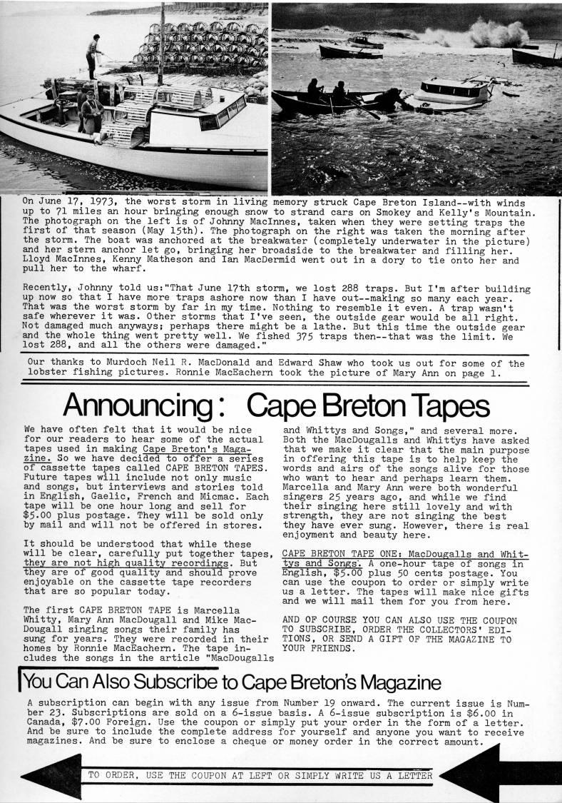 On June 17, 1973i the worst storm in living memory struck Cape Breton Islsmd • with winds up to 71 miles an hour bringing enough snow to strand cars on Smokey and Kelly's Mountain. The photograph on the left is of Johnny Maclnnes, taken when they were setting traps the first of that season (May 15th). The photograph on the right was taken the morning after the storm. The boat was anchored at the breakwater (completely underwater in the picture) and her stern anchor let go, bringing her broadside to the breakwater and filling her. Lloyd Maclnnes, Kenny Matheson and Ian MacDermid went out in a dory to tie onto her and pull her to the wharf. Recently, Johnny told us:"That June 17th storm, we lost 288 traps. But I'm after building up now so that I have more traps ashore now than I have out--making so many each year. That was the worst storm by far in my time. Nothing to resemble it even. A trap wasn't safe wherever it was. Other storms that I've seen, the outside gear would be all right. Not damaged much anyways; perhaps there might be a lathe. But this time the outside gear and the whole thing went pretty well. We fished 375 traps then • that was the limit. We lost 288, and all the others were damaged." Our thanks to Murdoch Neil R. MacDonald and Edward Shaw who took us out for some of the lobster fishing pictures. Ronnie MacEachern took the picture of Mary Ann on page 1. Announcing: Cape Breton Tapes We have often felt that it would be nice for our readers to hear some of the actual tapes used in making Cape Breton's Maga? zine. So we have decided to offer a series of cassette tapes called CAPE BRETON TAPES. Future tapes will include not only music and songs, but interviews and stories told in English, Gaelic, French and Micmac. Each tape will be one hour long and sell for $5.00 plus postage. They will be sold only by mail and will not be offered in stores. It should be understood that while these will be clear, carefully put together tapes, they are not high quality recordings. But they are of good quality and should prove enjoyable on the cassette tape recorders that are so popular today. The first CAPE BRETON TAPE is Marcella Whitty, Mary Ann MacDougall and Mike Mac? Dougall singing songs their family has sung for years. They were recorded in their homes by Ronnie MacEachern. The tape in? cludes the songs in the article "MacDougalls |You Can Also Subscribe to Cape Breton's Magazine A subscription can begin with any issue from Number 19 onward. The current issue is Num? ber 23. Subscriptions are sold on a 6-issue basis. A 6-issue subscription is $6.00 in Canada, $7.00 Foreign. Use the coupon or simply put your order in the form of a letter. And be sure to include the complete address for yourself and anyone you want to receive magazines. And be sure to enclose a cheque or money order in the correct amount. and Whittys and Songs," and several more. Both the MacDougalls and Whittys have asked that we make it clear that the main purpose in offering this tape is to help keep the words and airs of the songs alive for those who want to hear and perhaps learn them. Marcella and Mary Ann were both wonderful singers 25 years ago, and while we find their singing here still lovely and with strength, they are not singing the best they have ever sung. However, there is real enjoyment and beauty here. CAPE BRETON TAPE ONE; MacDougalls and Whit? tys and Songs". A one-hour tape of songs in English, $5'00 plus 50 cents postage. You can use the coupon to order or simply write us a letter. The tapes will make nice gifts and we will mail them for you from here. AND OF COURSE YOU CAN ALSO USE THE COUPON TO SUBSCRIBE, ORDER THE COLLECTORS' EDI? TIONS, OR SEND A GIFT OF THE MAGAZINE TO YOUR FRIENDS. TO ORDER, USE THE COUPON AT LEFT OR SIMPLY WRITE US A LETTER