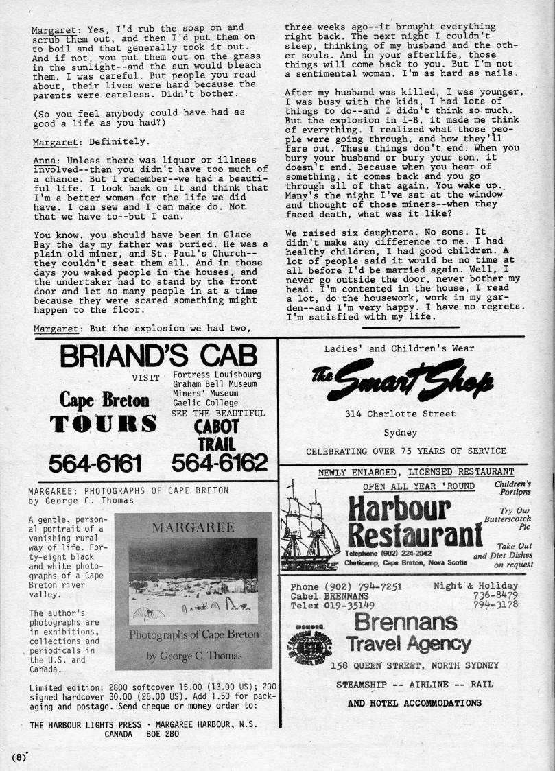 Published by Ronald Caplan on 1980/6/1 (583 reads)Margaret: Yes, I'd rub the soap on and scrub them out, and then I'd put them on to boil and that generally took it out. And if not, you put them out on the grass in the sunlight--and the sun would bleach them. I was careful. But people you read about, their lives were hard because the parents were careless. Didn't bother. (So you feel anybody could have had as good a life as you had?) Margaret; Definitely. Anna: Unless there was liquor or illness involved--then you didn't have too much of a chance. But I remember--we had a beauti? ful life. I look back on it and think that I'm a better woman for the life we did have. I can sew and I can make do. Not that we have to--but I can. You know, you should have been in Glace Bay the day my father was buried. He was a plain old miner, and St. Paul's Church-- they couldn't seat them all. And in those days you waked people in the houses, and the undertaker had to stand by the front door and let so many people in at a time because they were scared something might happen to the floor. Margaret: But the explosion we had two. three weeks ago--it brought everything right back. The next night I couldn't sleep, thinking of my husband and the oth? er souls. And in your afterlife, those things will come back to you. But I'm not a sentimental woman. I'm as hard as nails. After my husband was killed, I was younger, I was busy with the kids, I had lots of things to do--and I didn't think so much. But the explosion in 1-B, it made me think of everything. I realized what those peo? ple were going through, and how they'll fare out. These things don't end. When you bury your husband or bury your son, it doesn't end. Because when you hear of something, it comes back and you go through all of that again. You wake up. Many's the night I've sat at the window and thought of those miners • when they faced death, what was it like? We raised six daughters. No sons. It didn't make any difference to me. I had healthy children, I had good children. A lot of people said it would be no time at all before I'd be married again. Well?? I never go outside the door, never bother my head. I'm contented in the house, I read a lot, do the housework, work in my gar? den • and I'm very happy. I have no regrets. I'm satisfied with my life. BRIAND'S CAB VISIT C' Breton 564-6161 Fortress Louisbourg Graham Bell Museum Miners' Museum Gaelic College SEE THE BEAUTIFUL aBOT TRAIL 664-6162 MARGAREE: PHOTOGRAPHS OF CAPE BRETON by George C. Thomas A gentle, person? al portrait of a vanishing rural way of life. For? ty-eight black and white photo? graphs of a Cape Breton river valley. The author's photographs are in exhibitions, collections and , periodicals in the U.S. and Canada. 'h 1' ,r' ' fW' ? !s of Cape Breton Ijy George C. Thomas Limited edition: 2800 softcover 15.00 (13.00 US); 200 signed hardcover 30.00 (25.00 US). Add 1.50 for pack? aging and postage. Send cheque or money order to: THE HARBOUR LIGHTS PRESS • MARGAREE HARBOUR, N.S. CANADA BOE 2B0 Ladies' and Children's Wear 314 Charlotte Street Sydney CELEBRATING OVER 75 YEARS OF SERVICE NEWLY ENLARGED, LICENSED RESTAURANT OPEN ALL YEAR 'ROUND Harbour Restaurant • • . Telephone (902) 224-2042 ' • ' 'Jjef Dishes Cheticamp, Cape Breton, Nova Scotia '' request OiUdren's Portions Try Our Butterscotch Pie Phone (902) 79'-7251 Cabel. BRENNANS Teleac 019-351'9 Night & Holiday 736-8479 79'-3178 Brennans Travel Agency 158 QUEEN' STREET, NORTH SYDNEY STEAMSHIP • AIRLINE • RAIL AND. JiO'L_AG5QlQtOI)ATIONS (8)