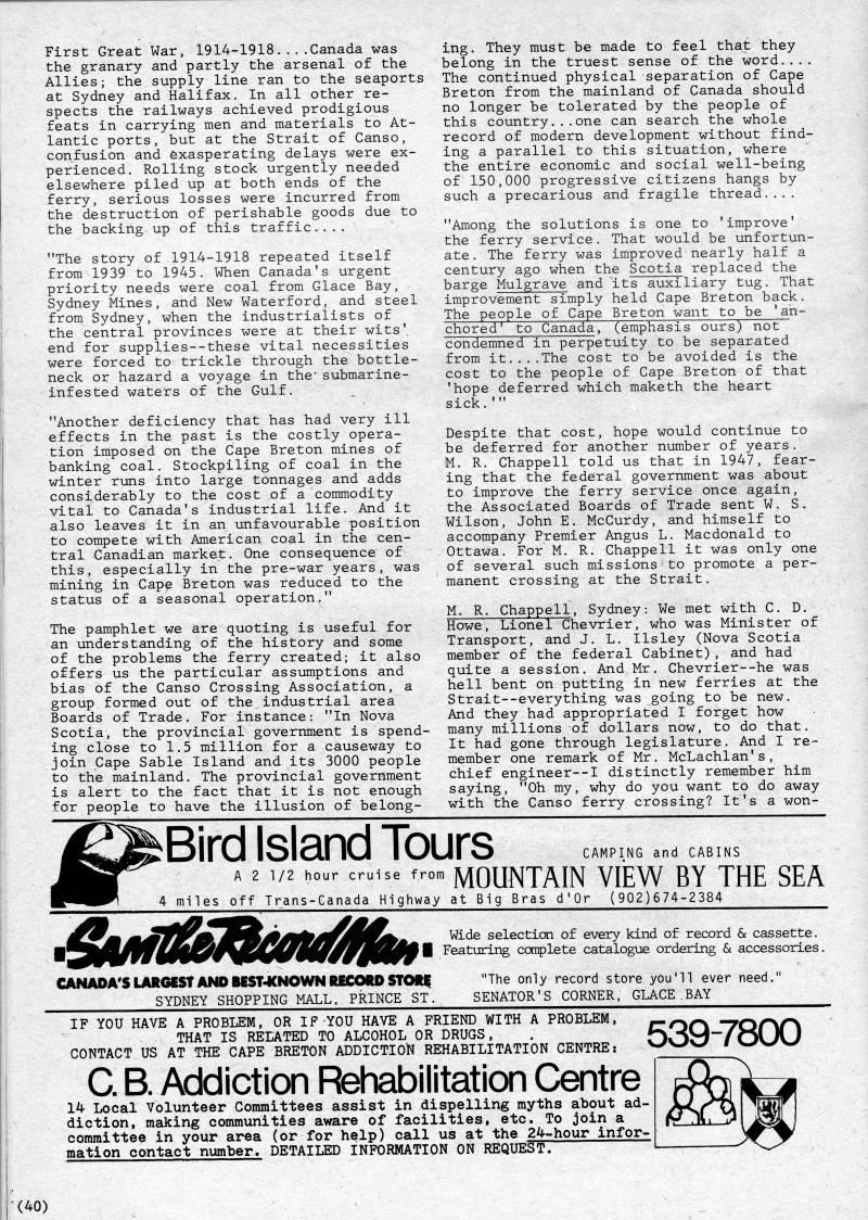 Published by Ronald Caplan on 1980/6/1 (561 reads)First Great War, 1914-1918....Canada was the granary and partly the arsenal of the Allies; the supply line ran to the seaports at Sydney and Halifax, In all other re? spects the railways achieved prodigious feats in carrying men and materials to At? lantic ports, but at the Strait of Canso, confusion and Exasperating delays were ex? perienced. Rolling stock urgently needed elsewhere piled up at both ends of the ferry, serious losses were incurred from the destruction of perishable goods due to the backing.up of this traffic.... "The story of 1914-1918 repeated itself from 1939 to 1945. When Canada's urgent priority needs were coal from Glace Bay, Sydney Mines, and New Waterford, and steel from Sydney, when the industrialists of the central provinces were at their wits', end for supplies--these vital necessities were forced to trickle through the bottle? neck or hazard a voyage in the* submarine- infested waters of the Gulf. "Another deficiency that has had very ill effects in the past is the costly opera? tion imposed on the Cape Breton mines of banking coal. Stockpiling of coal in the winter runs into large tonnages and adds considerably to the cost of a commodity vital to Canada's industrial life. And it also leaves it in an unfavourable position to compete with American coal in the cen? tral Canadian market. One consequence of this, especially in the pre-war years, was mining in Cape Breton was reduced to the status of a seasonal operation." The pamphlet we are quoting is useful for an understanding of the history and some of the problems the ferry created; it also offers us the particular assumptions and bias of the Canso Crossing Association, a group formed out of the industrial area Boards of Trade. For instance: "In Nova Scotia, the provincial government is spend? ing close to 1.5 million for a causeway to join Cape Sable Island and its 3000 people to the mainland. The provincial government is alert to the fact that it is not enough for people to have the illusion of belong? ing. They must be made to feel that they belong in the truest sense of the word.,,, The continued physical separation of Cape Breton from the mainland of Canada should no longer be tolerated by the people of this country... one can search the whole record of modern development without find? ing a parallel to this situation, where the entire economic and social well-being of 150,000 progressive citizens hangs by such a precarious and fragile thread,... "Among the solutions is one to 'improve' the ferry service. That would be unfortun? ate. The ferry was improved nearly half a century ago when the Scotia replaced the barge Mulgrave and its auxiliary tug. That improvement simply held Cape Breton back. The people of Cape Breton want to be 'an? chored' to Canada, (emphasis ours) not condemned in perpetuity to be separated from it....The cost to be avoided is the cost to the people of Cape Breton of that 'hope deferred which maketh the heart sick.'" Despite that cost, hope would continue to be deferred for another number of years. M. R. Chappell told us that in 1947, fear? ing that the federal government was about to improve the ferry service once again, the Associated Boards of Trade sent W. S. Wilson, John E. McCurdy, and himself to accompany Premier Angus L. Macdonald to Ottawa. For M. R. Chappell it was only one of several such missions to promote a per? manent crossing at the Strait. M. R. Chappell, Sydney: We met with C. D. Howe, Lionel Chevrier, who was Minister of Transport, and J. L. Ilsley (Nova Scotia member of the federal Cabinet), and had quite a session. And Mr, Chevrier--he was hell bent on putting in new ferries at the Strait--everything was going to be new. And they had appropriated I forget how many millions of dollars now, to do that. It had gone through legislature. And I re? member one remark of Mr. McLachlan's, chief engineer--I distinctly remember him saying, "Oh my, why do you want to do away with the Canso ferry crossing? It's a won- Bird Island Tours CAMPING and CABINS A 2 1/2 hour cruise fro • MOUNTAIN VIEW BY THE SEA 4 miles off Trans-Canada Highway at Big Bras d'Or (902)674-2384 CANADA'S UUtGEST AND BEST-KNOWN RECORD STORf SYDNEY SHOPPING MALL, PRINCE ST. Wide selection of every kind of record & cassette. Featuring complete catalogue ordering & accessories, "The only record store you'll ever need." SENATOR'S CORNER, GLACE.BAY IF YOU HAVE A PROBLEM, OR IF YOU HAVE A FRIEND WITH A PROBLEM, THAT IS RELATED TO ALCOHOL OR DRUGS, CONTACT US AT THE CAPE BRETON ADDICTION REHABILITATION CENTRE: C. B. Addiction Rehabilitation Centre 14 Local Volunteer Committees assist in dispelling myths about ad? diction, making communities aware of facilities, etc. To join a committee in your area (or for help) call us at the 24-hour infor? mation contact number. DETAILED INFORMATION ON REQUEST. 539-7800 (40)