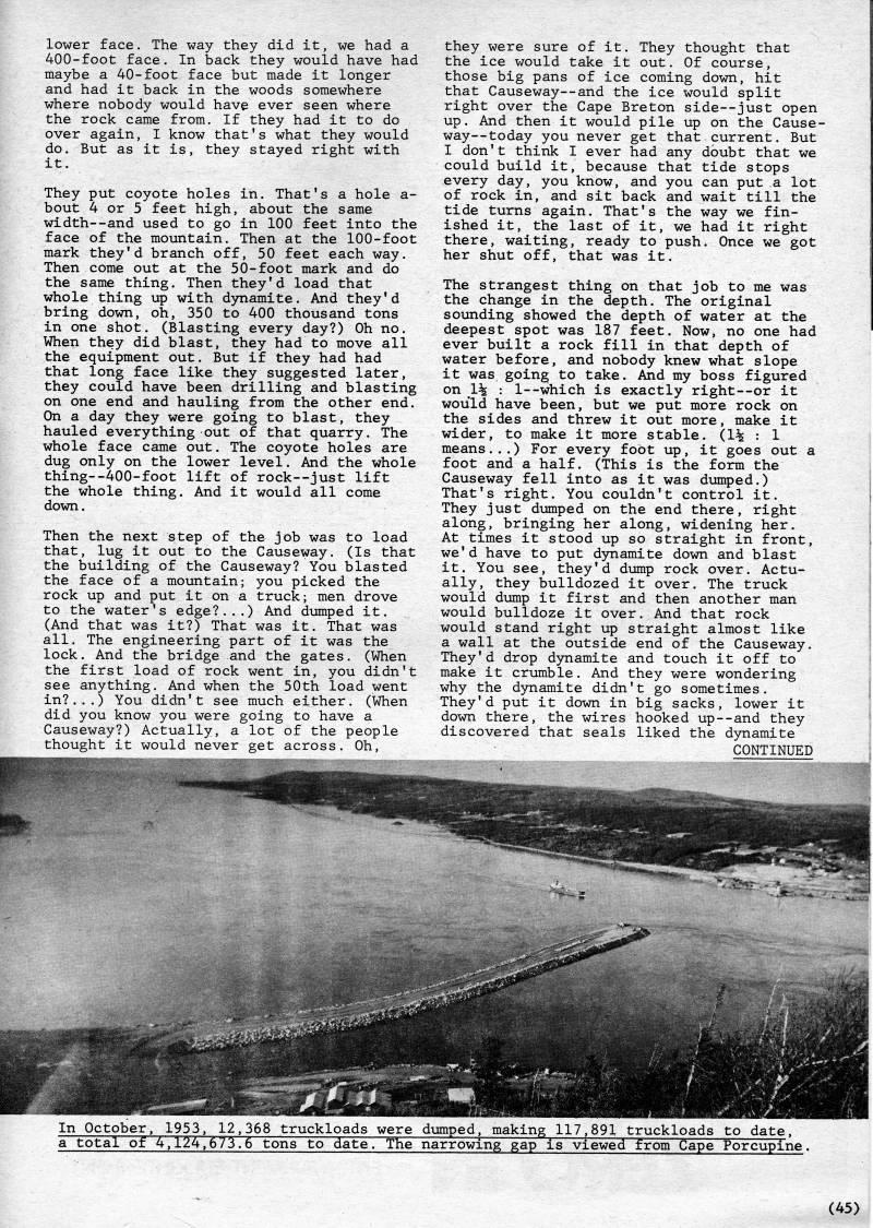 Published by Ronald Caplan on 1980/6/1 (420 reads)lower face. The way they did it, we had a 400-foot face. In back they would have had maybe a 40-foot face but made it longer and had it back in the woods somewhere where nobody would have ever seen where the rock came from. If they had it to do over again, I know that's what they would do. But as it is, they stayed right with it. They put coyote holes in. That's a hole a- bout 4 or 5 feet high, about the same width--and used to go in 100 feet into the face of the mountain. Then at the 100-foot mark they'd branch off, 50 feet each way. Then come out at the 50-foot mark and do the same thing. Then they'd load that whole thing up with d5mamite. And they'd bring down, oh, 350 to 400 thousand tons in one shot. (Blasting every day?) Oh no. When they did blast, they had to move all the equipment out. But if they had had that long face like they suggested later, they could have been drilling and blasting on one end and hauling from the other end. On a day they were going to blast, they hauled everything out of that quarry. The whole face came out. The coyote holes are dug only on the lower level. And the whole thing • 400-foot lift of rock--just lift the whole thing. And it would all come down. Then the next step of the job was to load that, lug it out to the Causeway. (Is that the building of the Causeway? You blasted the face of a mountain; you picked the rock up and put it on a truck; men drove to the water's edge?...) And dumped it. (And that was it?) That was it. That was all. The engineering part of it was the lock. And the bridge and the gates. (When the first load of rock went in, you didn't see anything. And when the 50th load went in?.,,) You didn't see much either. (When did you know you were going to have a Causeway?) Actually, a lot of the people thought it would never get across. Oh, they were sure of it. They thought that the ice would take it out. Of course, those big pans of ice coming down, hit that Causeway--and the ice would split right over the Cape Breton side • just open up. And then it would pile up on the Cause? way • today you never get that current. But I don't think I ever had any doubt that we could build it, because that tide stops every day, you know, and you can put a lot of rock in, and sit back and wait till the tide turns again. That's the way we fin? ished it, the last of it, we had it right there, waiting, ready to push. Once we got her shut off, that was it. The strangest thing on that job to me was the change in the depth. The original sounding showed the depth of water at the deepest spot was 187 feet. Now, no one had ever built a rock fill in that depth of water before, and nobody knew what slope it was going to take. And my boss figured on 1% : l--which is exactly right--or it would have been, but we put more rock on the sides and threw it out more, make it wider, to make it more stable. (1% : 1 means...) For every foot up, it goes out a foot and a half. (This is the form the Causeway fell into as it was dumped.) That's right. You couldn't control it. They just dumped on the end there, right along, bringing her along, widening her. At times it stood up so straight in front, we'd have to put dynamite down and blast it. You see, they'd dump rock over. Actu? ally, they bulldozed it over. The truck would dump it first and then another man would bulldoze it over. And that rock would stand right up straight almost like a wall at the outside end of the Causeway. They'd drop dynamite and touch it off to make it crumble. And they were wondering why the dynamite didn't go sometimes. They'd put it down in big sacks, lower it down there, the wires hooked up--and they discovered that seals liked the dynamite CONTINUED In October, 1953, 12,368 truckloads were dumped, making 117,891 truckloads to date, a total of 4,124,673.6 tons to date. The narrowing gap is viewed from Cape Porcupine.