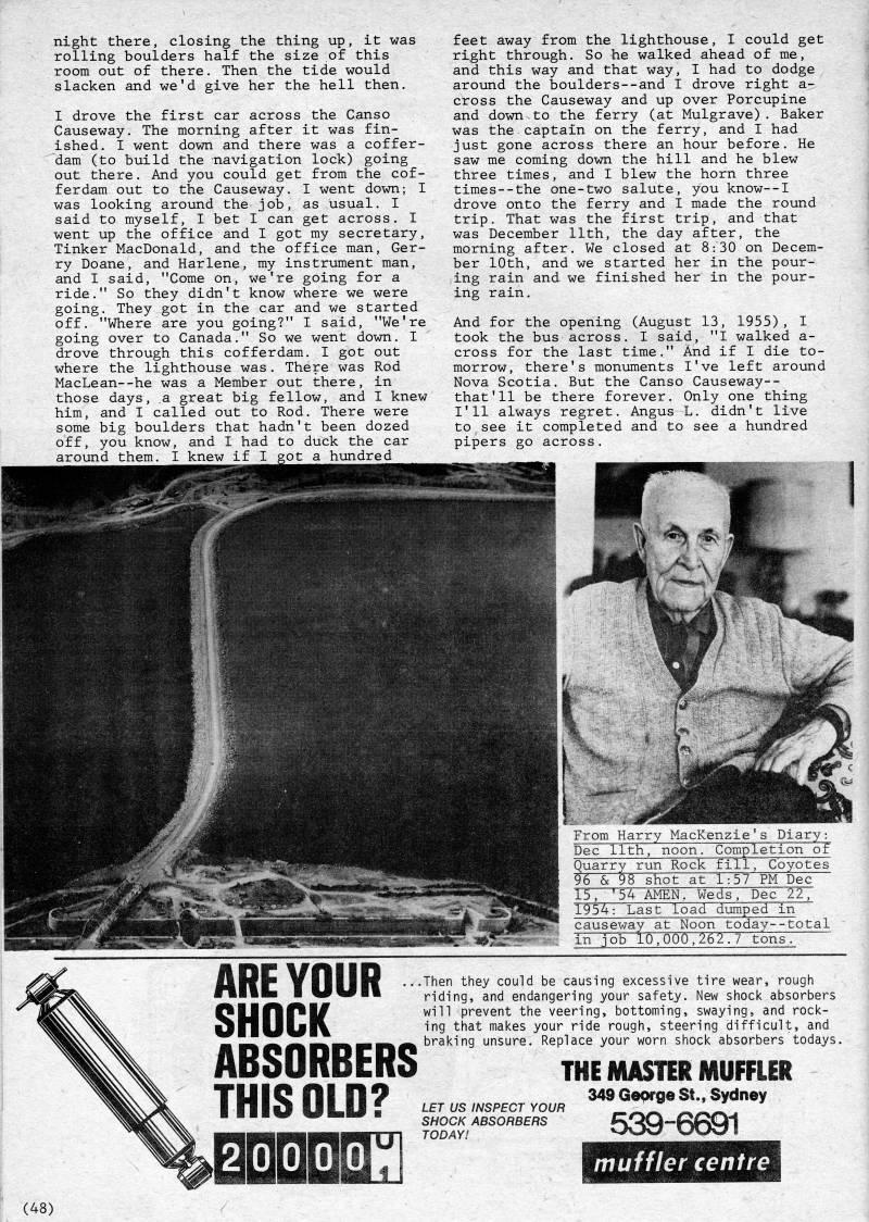 Published by Ronald Caplan on 1980/6/1 (430 reads)night there, closing the thing up, it was rolling boulders half the size of this room out of there. Then the tide would slacken and we'd give her the hell then. I drove the first car across the Canso Causeway. The morning after it was fin? ished. I went down and there was a coffer? dam (to build the navigation lock) going out there. And you could get from the cof? ferdam out to the Causeway, I went down; I was looking around the job, as usual, I said to myself, I bet I can get across, I went up the office and I got my secretary. Tinker MacDonald, and the office man, Ger? ry Doane, and Harlene, my instrument man, and I said, "Come on, we're going for a ride." So they didn't know where we were going. They got in the car and we started off, "Where are you going?" I said, "We're going over to Canada," So we went down, I drove through this cofferdam, I got out where the lighthouse was. There was Rod MacLean--he was a Member out there, in those days, a great big fellow, and I knew him, and I called out to Rod, There were some big boulders that hadn't been dozed off, you know, and I had to duck the car feet away from the lighthouse, I could get right through. So he walked ahead of me, and this way and that way, I had to dodge around the boulders--and I drove right a- cross the Causeway and up over Porcupine and down to the ferry (at Mulgrave), Baker was the captain on the ferry, and I had just gone across there an hour before. He saw me coming down the hill and he blew three times, and I blew the horn three times--the one-two salute, you know--I drove onto the ferry and I made the round trip. That was the first trip, and that was December 11th, the day after, the morning after. We closed at 8:30 on Decem? ber 10th, and we started her in the pour? ing rain and we finished her in the pour? ing rain. And for the opening (August 13, 1955), I took the bus across. I said, "I walked a- cross for the last time," And if I die to? morrow, there's monuments I've left around Nova Scotia. But the Canso Causeway-- that'll be there forever. Only one thing I'll always regret, Angus L, didn't live to see it completed and to see a hundred pipers go across. y at Noon today in job 10,000,262.7 tons total AREYOUR SHOCK ABSORBERS THIS OLD? mm Then they could be causing excessive tire wear, rough riding, and endangering your safety. New shock absorbers will prevent the veering, bottoming, swaying, and rock? ing that inakes your ride rough, steering difficult, and braking unsure. Replace your worn shock absorbers todays. LET US INSPECT YOUR SHOCK ABSORBERS TODAY! THE MASTER MUFFLER 349 Geprge St., Sydney 539-6691 mutflercentre (48)