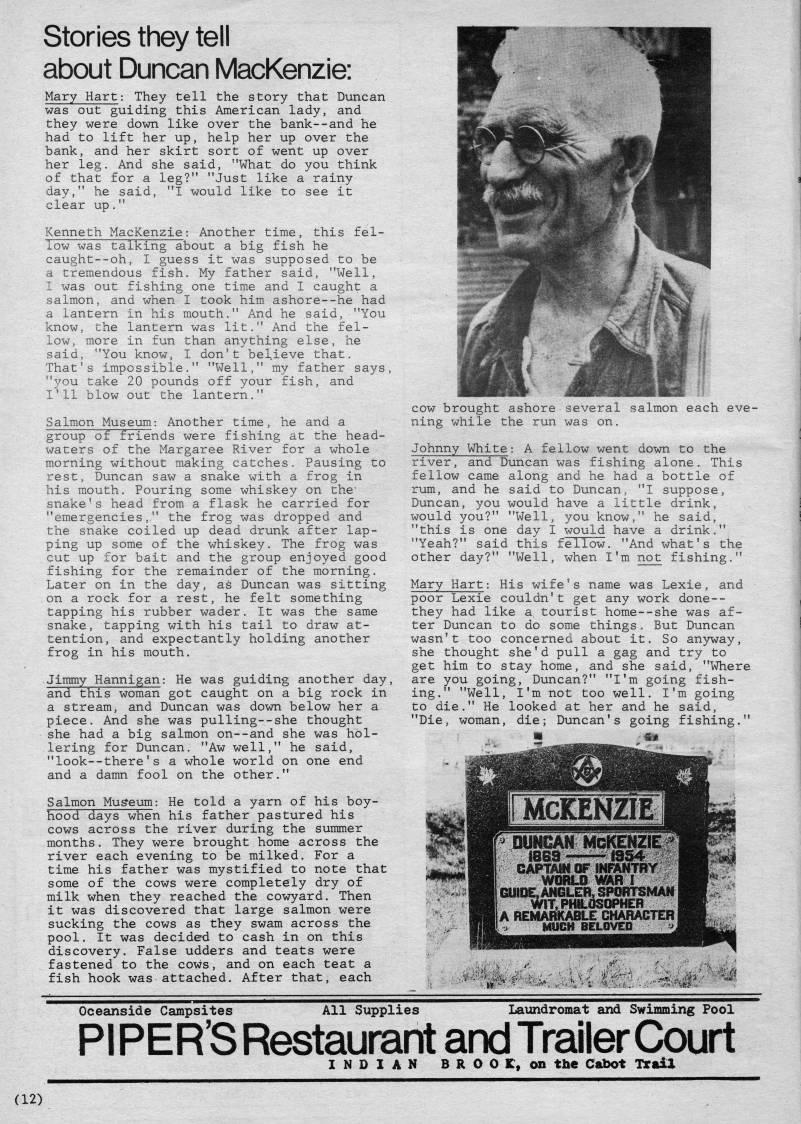 Published by Ronald Caplan on 1980/8/1 (404 reads)stories they tell about Duncan IVIacKenzie: Mary Hart: They tell the story that Duncan was out guiding this American lady, and they were down like over the bank--and he had to lift her up, help her up over the bank, and her skirt sort of went up over her leg. And she said, "What do you think of that for a leg?" "Just like a rainy day," he said, "I would like to see it clear up," Kenneth MacKenzie: Another time, this fel- low was talking about a big fish he caught--oh, I guess it was supposed to be a tremendous fish. My father said, "Well, I was out fishing one time and I caught a salmon, and when I took him ashore--he had a lantern in his mouth." And he said, "You know, the lantern was lit." And the fel? low, more in fun than anything else, he said, "You know, I don't believe that. That's impossible." "Well," my father says, "you take 20 pounds off your fish, and I'll blow out the lantern." Salmon Museum: Another time, he and a group of friends were fishing at the head? waters of the Margaree River for a whole morning without making catches. Pausing to rest, Duncan saw a snake with a frog in his mouth. Pouring some whiskey on the' snake's head from a flask he carried for "emergencies," the frog was dropped and the snake coiled up dead drunk after lap? ping up some of the whiskey. The frog was cut up for bait and the group enjoyed good fishing for the remainder of the morning. Later on in the day, as Duncan was sitting on a rock for a rest, he felt something tapping his rubber wader. It was the same snake, tapping with his tail to draw at? tention, and expectantly holding another frog in his mouth. Jimmy Hannigan: He was guiding another day, and this woman got caught on a big rock in a stream, and Duncan was down below her a piece. And she was pulling--she thought she had a big salmon on--and she was hol? lering for Duncan. "Aw well," he said, "look--there's a whole world on one end and a damn fool on the other." SalmoTi Mugeum: He told a yarn of his boy- hood days when his father pastured his cows across the river during the summer months. They were brought home across the river each evening to be milked. For a time his father was mystified to note that some of the cows were completely dry of milk when they reached the cowyard. Then it was discovered that large salmon were sucking the cows as they swam across the pool. It was decided to cash in on this discovery. False udders and teats were fastened to the cows, and on each teat a fish hook was attached. After that, each cow brought ashore several salmon each eve? ning while the run was on. Johnny White: A fellow went down to the river, and Duncan was fishing alone. This fellow came along and he had a bottle of rum, and he said to Duncan, "I suppose, Duncan, you would have a little drink, would you?" "Well, you know," he said, "this is one day I would have a drink." "Yeah?" said this fellow. "And what's the other day?" "Well, when I'm not fishing." Mary Hart: His wife's name was Lexie, and poor Lexie couldn't get any work done-- they had like a tourist home--she was af? ter Duncan to do some things. But Duncan wasn't too concerned about it. So anyway, she thought she'd pull a gag and try to get him to stay home, and she said, "Where are you going, Duncan?" "I'm going fish? ing." "Well, I'm not too well. I'm going to die." He looked at her and he said, "Die, woman, die; Duncan's going fishing." Oceanside Campsites All Supplies Latindromat and Swimming Pool PIPER'S Restaurant andTrailer Court INDIAN B R O 0 K, on the Cabot TraiJ. (12)