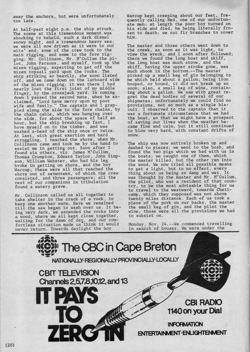 Published by Ronald Caplan on 1980/8/1 (350 reads)away the anchors, too late. but were unfortunately At half-past eight p.m. the ship struck. The scene at this tremendous moment was shocking to behold; such a dark dismal snowy night, and a tremendous heavy sea; we were all now driven as it were to our wits' end; some of the crew took to the main rigging, and some to the fore rig? ging; Mr. Collinson, Mr. M'Cullum the pi? lot, John Parsons, and myself, took up the mizen rigging, expecting to get off the mizen topsail yard upon the rocks. The ship striking so heavily, she soon listed off, and we came down on the larboard side of the mizen rigging; it was there I had nearly lost the first joint of my middle finger, by the crossjack yard. In coming down I passed the second mate, when he ex? claimed, "Lord have mercy upon my poor wife and family." The captain and I grap? pled along the side to the fore chains, by the chain cable, which was hanging over the side, for about the space of half an hour, but the ship breaking up fast, I hove myself on to the timber, and was washed a-head of the ship once or twice. At last, with great exertion and hard struggling, I reached the shore, when Mr. Collinson came and took me by the hand to assist me in getting out. Soon after I found six others, viz. James M'Cullum, Thomas Crompton, Edward Taylor, John Simp? son, William Webster, who had his leg broke in getting on shore, and the boy Warcup; these were all that reached the shore out of seventeen, of which the crew consisted, and three passengers; all the rest of our companions in tribulation found a watery grave. Mr. Collinson called us all together to take shelter in the crack of a rock, to keep one another warm. Here we remained till the sea began to wash over us. It be? ing very dark, we ascended the rocks into a wood, where we all kept close together, waiting for the dawn of da', and our com? fortless situation made us think it would never return. Towards daylight the boy Warcup kept creeping about our feet, fre? quently calling Ned, one of our unfortun? ate men; at length the poor boy turned on his side and died, he being literally fro? zen to death; we cut fir branches to cover him. The master and three others went down to the creek, as soon as it was light, to view the wreck, and I soon after followed; there we found the long boat and skiff, the long boat was much stove, and the skiff, having the upper stroke gone, was much shook in the bottom. • The master picked up a small keg of gin belonging to me which held about a gallon; being iron hooped, or bound, it did not break up so soon; also, a small keg of wine, contain? ing about a gallon. We saw with great re? gret the dead bodies of several of our shipmates; unfortunately we could find no provisions, not so much as a single bis? cuit. I observed to the captain that it was a fortunate circumstance that we had the boat, so that we might have a prospect of saving our lives when the weather be? came fine and calm, but it still continued to blow very hard, with constant drifts of snow. The ship was now entirely broken up and dashed to pieces; we went to the bush, and found the two pigs which we had with us in the boats; we caught one of them, which the master killed, but the other ran into the wood. We now tried all possible means to get a light, but to no effect, every thing about us being so damp and wet. It was thought by the master and Mr. M'Cullum, the pilot, who was a resident of that coun? try, to be the most advisable thing for us to travel to the westward, towards Cheti? camp, which they supposed was not above twenty miles distance. Each of us took a piece of the pork on our backs, the master the small keg of gin, and the pilot the wine; those were all the provisions we had to subsist on. Monday, Nov. 24.--We commenced travelling in search of houses. We were under the J#'%k USS' The CBC in Cape Breton ' NATIONALLYREGIONALLYPROVINCIALLY-L'' CBTT TELEVISION Chamels2.5'73,10,12,and13 (20) rrnfirs TO ZE CBI RADIO 1140 on your Dial INFORMAnON EMTERTAINMENTENLIGHTENMBfT
