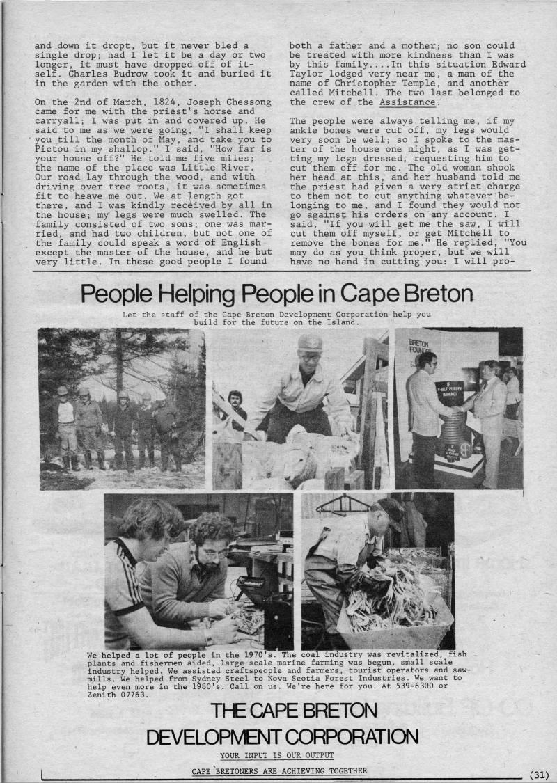 Published by Ronald Caplan on 1980/8/1 (277 reads)and down it dropt, but it never bled a single drop; had I let it be a day or two longer, it must have dropped off of it? self. Charles Budrow took it and buried it in the garden with the other. On the 2nd of March, 1824, Joseph Chessong came for me with the priest's horse and carryall; I was put in and covered up. He said to me as we were going, "I shall keep ' you till the month of May, and take you to Pictou in my shallop." I said, "How far is your house off?" He told me five miles; the name of the place was Little River. Our road lay through the wood, and with driving over tree roots, it was sometimes fit to heave me out. We at length got there, and I was kindly received by all in the house; my legs were much swelled. The family consisted of two sons; one was mar? ried, and had two children, but not one of the family could speak a word of English except the master of the house, and he but very little. In these good people I found both a father and a mother; no son could be treated with more kindness than I was by this family....In this situation Edward Taylor lodged very near me, a man of the name of Christopher Temple, and another called Mitchell. The two last belonged to the crew of the Assistance. The people were always telling me, if my ankle bones were cut off, my legs would very soon be well; so I spoke to the mas? ter of the house one night, as I was get? ting my legs dressed, requesting him to cut them off for me. The old woman shook her head at this, and her husband told me the priest had given a very strict charge to them not to cut anything whatever be? longing to me, and I found they would not go against his orders on any account. I said, "If you will get me the saw, I will cut them off myself, or get Mitchell to remove the bones for me." He replied, "You may do as you think proper, but we will have no hand in cutting you: I will pro- People Helping People in Cape Breton tion 1 4 Let the staff of the Cape Breton Development Corporation help you build for the future on the Island. We helped a lot of people in the 1970's. The coal industry was revitalized, fish plants and fishermen aided, large scale marine farming was begun, small scale industry helped. We assisted craftspeople and farmers, tourist operators and saw? mills. We helped from Sydney Steel to Nova Scotia Forest Industries. We want to help even more in the 1980's. Call on us. We're here for you. At 539-6300 or Zenith 07763. THE CAPE BRETON DEVELOPMENT CORPORATION YOUR INPUT IS OUR OUTPUT CAPE 'bretoners ARE ACHIEVING TOGETHER (31)