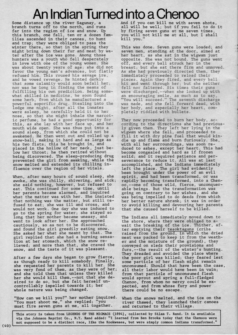 Published by Ronald Caplan on 1980/8/1 (596 reads)An Indian Turned into a Chenoo Some distance up the river Sagunay, a branch turns off to the north, and runs far into the region of ice and snow. Up this branch, one fall, ten or a dozen fam? ilies ascended in their canoes, to hunt and trap; they were obliged to pass the winter there, so that in the spring they might bring down their fur and meat by wa? ter after the ice was gone. Among those hunters was a youth who fell desperately in love with one of the young women. She was about twenty years of age; she did not favor the young man's advances, but flatly refused him. This roused his savage ire, and he vowed revenge. He hinted darkly that .some calamity would soon befall her; nor was he long in finding the means of fulfilling his own prediction. Being some? what skilled in medicine, he soon found some herb, from which he manufactured a powerful soporific drug. Stealing into the lodge one night, after all the inmates were asleep, he carefully held it to her nose, so that she might inhale the narcot? ic perfume; he had a good opportunity for this, as she lay with her face up, and her mouth wide open. She was thus put into a sound sleep, from which she could not be awakened. He then went out and rolled up a snow-ball, making it hard and as large as his two fists; this he brought in, and placed in the hollow of her neck, just be? low her throat; he then retired without being discovered. The sleep-producing drug prevented the girl from awaking, while the snow melted and extended its chilling in? fluence over the region of her vitals. When, after many hours of sound sleep, she awoke, she was chilly, shivering, and sick; she said nothing, however, but refused to eat. This continued for some time, until her parents became alarmed, and inquired what the matter was with her. She insisted that nothing was the matter, but still re? fused to eat; she was ill and cross, and would not work. One day she was induced to go to the spring for water; she stayed so long that her mother became uneasy, and went to look after her. She approached cautiously, so as not to be discovered, and found the girl greedily eating snow. She asked her what she meant by that. The girl replied that she had a burning sensa? tion at her stomach, which the snow re? lieved; and more than that, she craved the snow, and the taste of it was pleasant. After a few days she began to grow fierce, as though ready to kill somebody. Finally, she requested her parents to kill her. She was very fond of them, as they were of her; and she told them that unless they killed her she would kill them, • not that she de? sired to do so, but she felt herself un? controllably impelled towards it; her whole nature was being changed. "How can we kill you?" her mother inquired. "You must shoot me," she replied; "you must fire seven guns at me, all together. And if you can kill me with seven shots, all will be well; but if you fail to do it by firing seven guns at me seven times, you will not kill me at all, but I shall kill you." This was done. Seven guns were loaded; and seven men, standing at the door, aimed at her heart, as she sat in the wigwam just opposite. She was not bound. The guns went off, and every ball struck her in the breast; but she sat there firm and unmoved. As she had previously directed them, they immediately proceeded to reload their pieces. Again they fired, and every ball hit and went through her; but she neither fell nor faltered. Six times their guns were discharged,--when she looked up with an encouraging smile, as much as to say, "You will succeed." The seventh discharge was made, and she fell forward dead, with her body, and especially her heart, com? pletely riddled with bullets. They now proceeded to burn her body, ac? cording to the directions she had previous? ly given them. They left her lying in the wigwam where she fell, and proceeded to fill it with dry pine fuel that would kin? dle up and flame and burn furiously. She, with all her surroundings, was soon re? duced to ashes, except her heart. This had become congealed and hard as if frozen solid; and it required patience and per? severance to reduce it. All was at last accomplished, and the Indians immediately left the place. The girl had evidently been brought londer the power of an evil spirit, and had been transformed, or was rapidly becoming transformed, into a Chen? oo, • one of those wild, fierce, unconquer? able beings. But the transformation was going on contrary to her wishes, and she was being impelled to do deeds from which her better nature shrank; it was in order to avoid killing and devouring her parents that she caused herself to be kij-led. The Indians all immediately moved down to the shore, where they were obliged to a- wait the breaking of the ice. Thither, af? ter emptying their tesoktaguns (cribs raised from the ground, in which the dried meat was packed to keep it from the weath? er and the moisture of the ground), they conveyed on sleds their provisions and furs,--the result of the winter's hunting. They dreaded and avoided the place where the poor girl was killed; they feared lest some particle of her flesh might remain unconsumed. Should that have been the case, all their labor would have been in vain; from that particle of unconsumed flesh would sprout and spring a full-fledged Chenoo, from whom no mercy could be ex? pected, and from whose fury and power there could be no escape. When the snows melted, and the ice on the river thawed, they launched their canoes and returned to their village. This story is taken from LEGENDS OF THE MICMACS C1894), collected by Silas T. Rand. It is available via the Johnson Reprint Co., N.Y. Rand added: "I learned from Ben Brooks today tha,t the Chenoos were not supposed to be a distinct race, like the Kookweses, but were simply common Indians transformed."