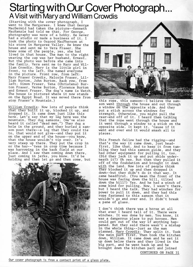 Published by Ronald Caplan on 1981/12/1 (505 reads)starting with Our Cover Photograph... A Visit with Mary and William Crowdis (Starting with the cover photograph, I went to the Margarees. I knew that George MacDermid had taken the picture--Kenneth MacKenzie had told me that. For George, photography was more of a hobby. He never had a studio or made a business of it. I took the photo to Osgood MacPherson at his store in Margaree Valley. He knew the house and sent me to Vera Fraser. She knew some of the people, yes, she had lived in that house. The man to the right wearing the cap was her husband, Ernest. But the photo was before she came into the family. Vera sent me to Mary and Wil? liam Crowdis. Mary is the little girl in front, to the left. She named everyone in the picture. Front row, from left: Mary Fraser Crowdis, Malcolm Fraser, Lil? lian Burton, John Burton. Back row, from left: Simon Fraser, Tena (Christena) Bur? ton Fraser, Verne Burton, Florence Burton and Ernest Fraser. The dog's name is Watch. The house is pictured where it now stands on the Egypt Road. It was moved there from atop Eraser's Mountain.) William Crowdis: Now lots of people think that they built it up, blocked it up, and dropped it. It came down just like this here. Let's say that my leg here was the mountain. They dug samsons. (We've also heard it called "dead men.") They dug a hole in the ground, and they buried a sam- son post there--a log that they could tie to, that would not give--and they put it on the upper end of the house--you know, that the house wouldn't tip over. It's very steep up there. They put the crop in or the hay--'twas in crop time because I was harrowing in the back field at our place. And I saw them coming down there, just coming in jerks, you know. It'd be holding and then let go and then come, but this rope, this samson--I believe the sam- son went through the house and out through a window on the opposite side. And they put a stick across the windows for strength. Otherwise, you might pull the rear-end off of it. I heard them talking that the rope went through the house and it went through a window to a stick on the opposite side. It kept it. 'Cause if it went end over end it would smash all to pieces. This French fellow had the rigging--and that's the way it came down, just head? first, like that. And to keep it from tum? bling they had this samson guide, and they had other equipment for pulling it, too. (Did they jack it up and put skids under? neath it?) Oh yes. But then they pulled it off of the foundation and brought it down with the land. Now lots of people think they blocked it up and then dropped it down--but they didn't do it that way. It came headfirst. (You mean the front of the house was facing down the hill, tilted down the hill?) Yes. And he had a winch of some kind for pulling. Now, I wasn't there, but I heard the talk. They had winches for power to pull it down, and they had this rope fastened to this samson that it wouldn't go end over end. It didn't break a pane of glass. I don't think there was a horse at all that ever I heard tell of it. There were winches. It was done by men. You know, it was a dangerous place to put horses. Men could get out of the way if anything hap? pened. But they said there wasn't a mishap in the whole thing--just as the man planned. Mary Crowdis: They split it. Took the main part first. Then took the kitchen down, William. It came down and he set it up down below there and they lived in the big part, and he went back up and he brought down the kitchen part and joined