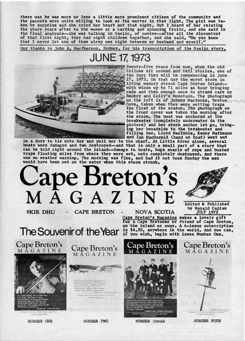 Published by Ronald Caplan on 1973/7/1 (874 reads)there was he was more or less a little more prominent citizen of the community and the parents were quite willing to look at the matter in that light. The girl was ta? ken by surprise and she cried her heart out that night. But I heard of her relating the story years after to the women at a carding and spinning frolic, and she said in the final analysis • she was talking in Gaelic, of course • after all the discontent of that first night, they had eight children together, and she said, **Do you know that I never let one of them sleep one night between my husband and myself," Our thanks to John A, MacPherson, Sydney, for his transcription of the Gaelic story. JUNE 171973 * Twenty-five years from now, when the old fellows sit around and tell stories, one of I the days they will be remembering is June 5 17, 1973, On that day the worst storm in jliving memory struck Cape Breton Island • * with winds up to 71 miles an hour bringing * rain and then enough snow to strand cars on , Smokey and Kelly's Mountain, The photograph on the left as of Johnny Maclnnis, Breton • - rCove, taken when they were setting traps the first of the season. The photograph on the front cover was taken the morning after the storm. The boat was anchored at the breakwater (completely underwater in the ??picture) and her stern anchor let go, bring? ing her broadside to the breakwater and filling her, Lloyd Maclnnis, Kenny Matheson i and Ian MacDermid (hand on boat) went out in a dory to tie onto her and pull her to the wharf. At Little River alone, several boats were damaged and two destroyed • and that is only a small part of a story that can be told right around the island • damage to boats, huge snarls of rope and busted traps floating miles from where they were set, nets completely destroyed. And there was no weather warning. The morning was fine, and had it not been Sunday the men would have been out on the water when this storm struck. Cape Breton's MAGAZINE SKIR DHU CAPE BRETON NOVA SCOTIA Edited & Published by Ronald Capian J"LY 1973. The Souvenir of the Year Cape Breton's Magazine makes a lovely gift for a Cape Bretoner or Friend of Cape Breton, on the island or away, A 6-issue subscription is $4,50j anywhere in the world. And you can, if you wish, begin with issue Number One, Cape Breton's MAGAZINE Cape Breton's M A G A Z 1 N E Cape Breton's Cape Breton's MAGAZINE / NUMBER am NUMBER TWO NUMBER THKJbiJbi NUMBER FOUR