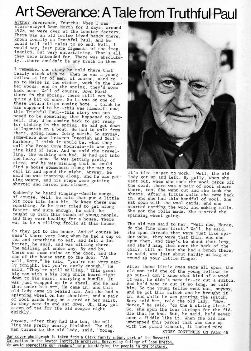 Published by Ronald Caplan on 1983/6/1 (790 reads)Art Severance: A Tale from Truthful Paul Arthur Severance, Fourchu: When I was storm-stayed Down North for 3 days, around 1928, we were over at the lobster factory. There was an old fellow lived handy there, known locally as Truthful Paul. And he could tell tall tales to no end. Well, I would say, just pure figments of the imag? ination. But very entertaining. That's all they were intended for. There was absolute? ly...there couldn't be any truth in them, I remember one story he told there that really stuck with me. When he was a young fellow--a lot of men, of course, used to go to Maine in the winter, work in the lum? ber woods. And in the spring, they'd come back home. Well of course, Down North there in the spring, there still can be quite a bit of snow. So it was on one of these return trips coming home, I think he was supposed to be--this was himself, now, this Truthful Paul--this story was sup? posed to be something that happened to him? self. They'd be coming back to get ready for fishing in the spring. He had got down to Ingonish on a boat. He had to walk from there, going home. Going north. So anyway, somewhere down between Ingonish and Neil's Harbour, I think it would be, what they call the Broad Cove Mountain--it was get? ting kind of late. And he said the travel? ling, the walking was bad. He had got into the heavy snow. He was getting pretty tired, and he was wishing that he could find a house somewhere along the way to call in and spend the night. Anyway, he said he was tramping along, and he was get? ting weary, and his steps were getting shorter and harder and slower. Suddenly he heard singing--Gaelic songs, of course. Well, he said that put a little bit more life into him. He knew there was something. So he just tried to get along faster. And sure enough, he said, he caught up with this bunch of young people, and they were heading for a house. There was to be a milling frolic at this house. So they got to the house. And of course he wasn't there very long when he had a cup of tea and something to eat, and felt a lot better, he said, and was sitting there. The milling got under way. By and by, there was some noise at the door, and the man of the house went to the door, "Ah well, Rory," he said, "you're not very ear? ly tonight, but you're early enough." He said, "They're still milling," This great big man with a big long white beard right down to his waist, carrying a bundle. It was just wrapped up in a shawl, and he had that under his arm. He came in, and this old lady came in behind him. And she had a spinning wheel on her shoulder, and a pair of wool cards hung on a cord at her waist. So they came in and sat down. Oh, they got a cup of tea for the old couple right quickly. Anyway, after they had the tea, the mil? ling was pretty nearly finished. The old man turned to the old lady, said, "Morag, it's time to-get to work," Well, the old lady got up and left. By golly, when she went out, when she took the wool cards off the cord, there was a pair of wool shears there, too. She went out and she took the shears. After a little while she came back in, and she had this handful of wool. She sat down with the wool cards, and she started carding the wool and making rolls. She got the rolls made. She started the spinning wheel going. The old man said to her, "Well now, Morag, do the fine ones first," Well, he said, she spun threads that were just like spi? der webs, they were that thin. And she spun them, and they'd be about that long, and she'd hang them over the back of the chair, till at last she had a bunch there, he said, was just about hardly as big a- round as your little finger. After these little ones were all spun, the old man told one of the young fellows to go out--I don't know what kind of a wood it was, he didn't name it--to cut a switch. And he'd have to cut it so long, he told him. So the young fellow went out, anyvay, and he got this switch and he brought it in. And while he was getting the switch, Rory told her, told the old lady, "Now, Morag," he said, "do the E string first." So, she spun the four strings for the fid? dle that he had. But, he said, he'd never seen a fiddle like it. When the old man unwrapped this parcel that was done up with the plaid blanket, it looked more STORY CONTINUES ON PAGE 48 Our cover photograph is taken from a Clark family album, part of the Rossetti Collection in the Beaton Institute archives. University College of Cape Breton. We would appreciate our readers' help identifying the people in the picture.