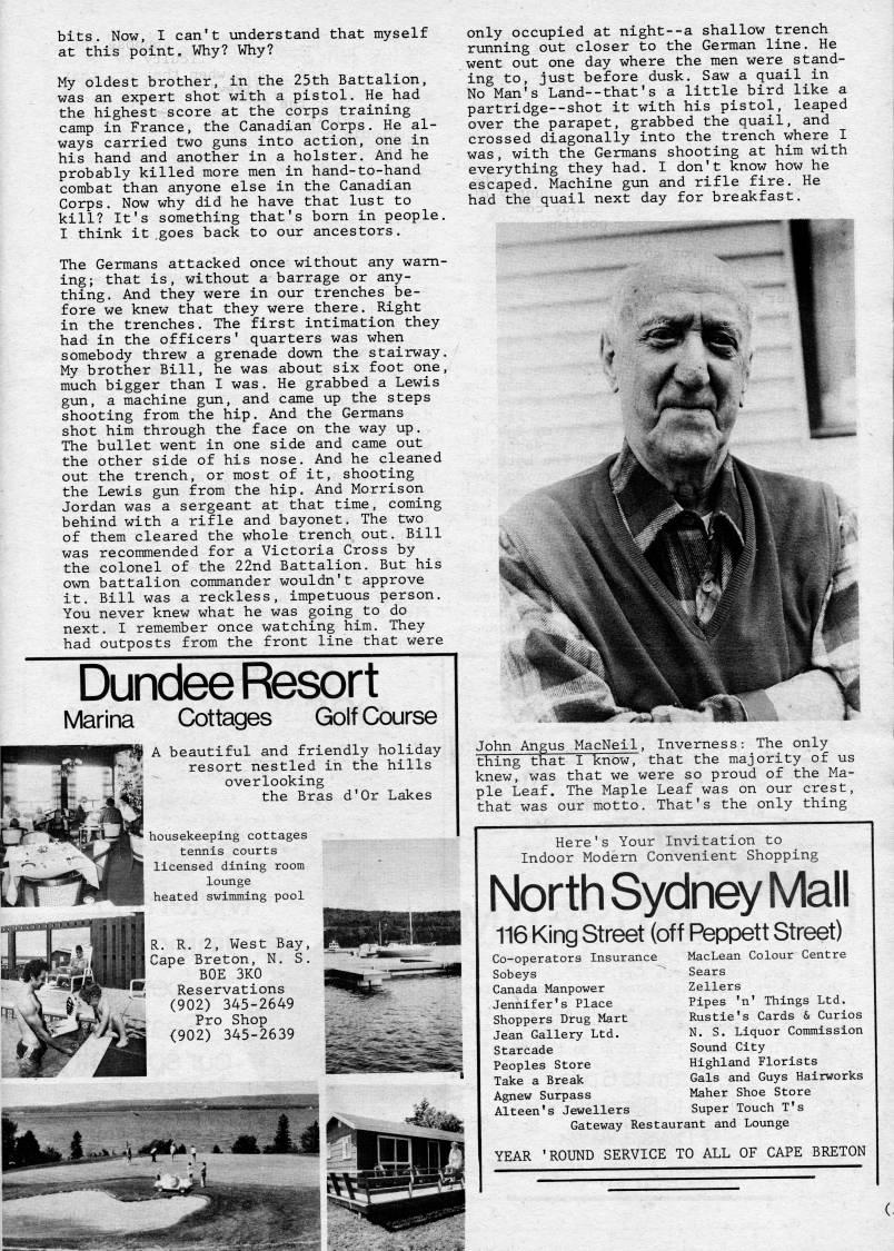 Published by Ronald Caplan on 1983/6/1 (537 reads)bits. Now, I can't understand that myself at this point. Why? Why? My oldest brother, in the 25th Battalion, was an expert shot with a pistol. He had the highest score at the corps training camp in France, the Canadian Corps. He al? ways carried two guns into action, one in his hand and another in a holster. And he probably killed more men in hand-to-hand combat than anyone else in the Canadian Corps. Now why did he have that lust to kill? It's something that's bom in people. I think it goes back to our ancestors. The Germans attacked once without any warn? ing; that is, without a barrage or any? thing. And they were in our trenches be? fore we knew that they were there. Right in the trenches. The first intimation they had in the officers' quarters was when somebody threw a grenade down the stairway. My brother Bill, he was about six foot one, much bigger than I was. He grabbed a Lewis gun, a machine gun, and came up the steps shooting from the hip. And the Germans shot him through the face on the way up. The bullet went in one side and came out the other side of his nose. And he cleaned out the trench, or most of it, shooting the Lewis gun from the hip. And Morrison Jordan was a sergeant at that time, coming behind with a rifle and bayonet. The two of them cleared the whole trench out. Bill was recommended for a Victoria Cross by the colonel of the 22nd Battalion. But his own battalion commander wouldn't approve it. Bill was a reckless, impetuous person. You never knew what he was going to do next. I remember once watching him. They had outposts from the front line that were Dundee Resort Marina Cottages Golf Course A beautiful and friendly holiday resort nestled in the hills overlooking the Bras d'Or Lakes housekeeping cottages tennis courts licensed dining room lounge heated swimming pool R. R. 2, West Bay, Cape Breton, N. S. BOE 3K0 Reservations (902) 345-2649 jt.' Pro Shop '? <902) 345-2639 only occupied at night--a shallow trench running out closer to the German line. He went out one day where the men were stand? ing to, just before dusk. Saw a quail in No Man's Land--that's a little bird like a partridge--shot it with his pistol, leaped over the parapet, grabbed the quail, and crossed diagonally into the trench where I was, with the Germans shooting at him with everything they had. I don't know how he escaped. Machine gun and rifle fire. He had the quail next day for breakfast. John Angus MacNeil, Inverness: The only thing that I know, that the majority of us knew, was that we were so proud of the Ma? ple Leaf. The Maple Leaf was on our crest, that was our motto. That's the only thing Here's Your Invitation to Indoor Modern Convenient Shopping North Sydney Mall 116 King Street (off Peppett Street) Co-operators Insurance MacLean Colour Centre Sobeys Canada Manpower Jennifer's Place Shoppers Drug Mart Jean Gallery Ltd. Starcade Peoples Store Take a Break Agnew Surpass Alteen's Jewellers Sears Zellers Pipes 'n' Things Ltd. Rustle's Cards & Curios N. S. Liquor Commission Sound City Highland Florists Gals and Guys Hairworks Maher Shoe Store Super Touch T's Gateway Restaurant and Lounge YEAR 'ROUND SERVICE TO ALL OF CAPE BRETON