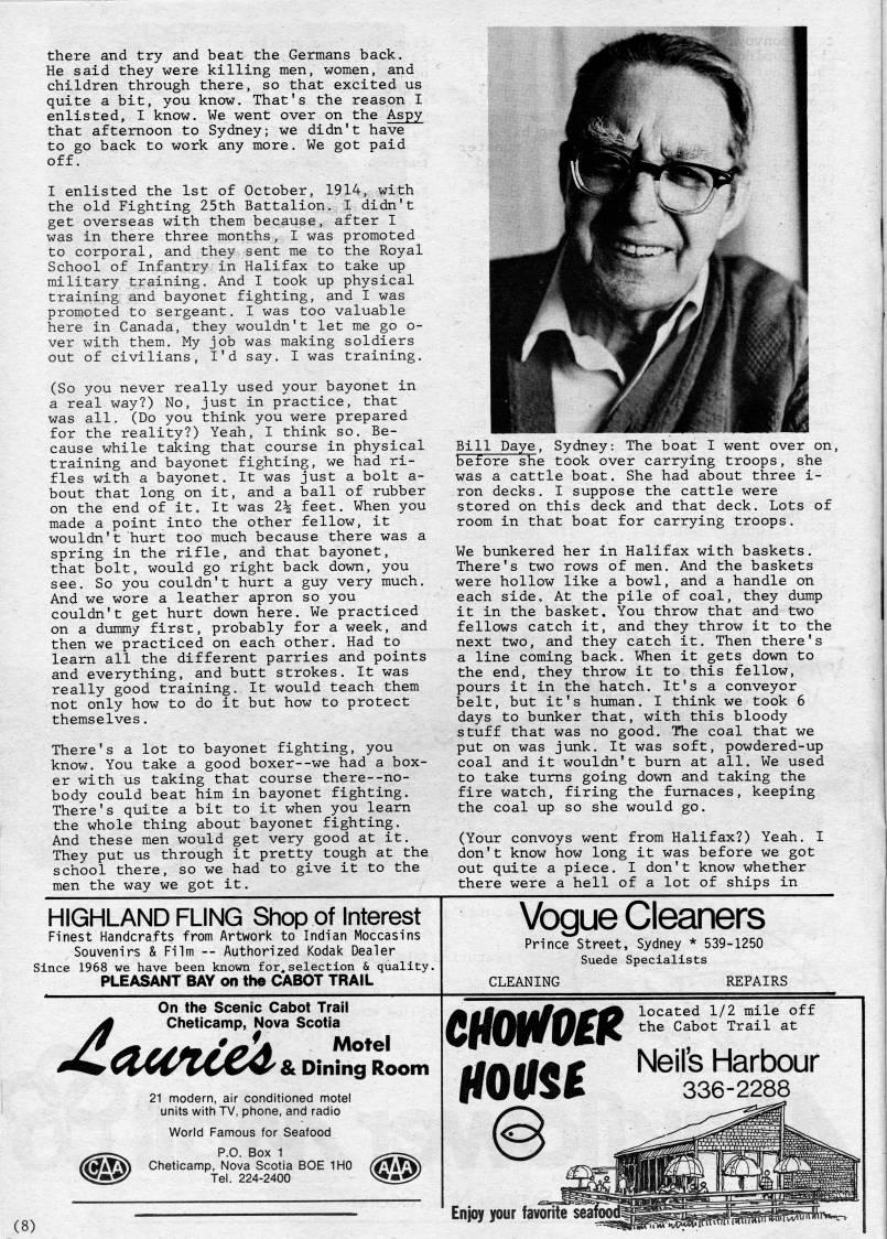 Published by Ronald Caplan on 1983/6/1 (492 reads)there and try and beat the Germans back. He said they were killing men, women, and children through there, so that excited us quite a bit, you know. That's the reason I enlisted, I know. We went over on the Aspy that afternoon to Sydney; we didn't have to go back to work any more. We got paid off. I enlisted the 1st of October, 1914, with the old Fighting 25th Battalion. I didn't get overseas with them because, after I was in there three months, I was promoted to corporal, and they sent me to the Royal School of Infantry in Halifax to take up military training. And I took up physical training and bayonet fighting, and I was promoted to sergeant, I was too valuable here in Canada, they wouldn't let me go o- ver with them. My job was making soldiers out of civilians, I'd say. I was training. (So you never really used your bayonet in a real way?) No, just in practice, that was all. (Do you think you were prepared for the reality?) Yeah, I think so. Be? cause while taking that course in physical training and bayonet fighting, we had ri? fles with a bayonet. It was just a bolt a- bout that long on it, and a ball of rubber on the end of it. It was 2% feet. When you made a point into the other fellow, it wouldn't hurt too much because there was a spring in the rifle, and that bayonet, that bolt, would go right back down, you see. So you couldn't hurt a guy very much. And we wore a leather apron so you couldn't get hurt down here. We practiced on a dummy first, probably for a week, and then we practiced on each other. Had to learn all the different parries and points and everything, and butt strokes. It was really good training. It would teach them not only how to do it but how to protect themselves. There's a lot to bayonet fighting, you know. You take a good boxer--we had a box? er with us taking that course there--no? body could beat him in bayonet fighting. There's quite a bit to it when you learn the whole thing about bayonet fighting. And these men would get very good at it. They put us through it pretty tough at the school there, so we had to give it to the men the way we got it. Bill Daye, Sydney: The boat I went over on, before she took over carrying troops, she was a cattle boat. She had about three i- ron decks. I suppose the cattle were stored on this deck and that deck. Lots of room in that boat for carrying troops. We bunkered her in Halifax with baskets. There's two rows of men. And the baskets were hollow like a bowl, and a handle on each side. At the pile of coal, they dump it in the basket. You throw that and two fellows catch it, and they throw it to the next two, and they catch it. Then there's a line coming back. When it gets down to the end, they throw it to this fellow, pours it in the hatch. It's a conveyor belt, but it's human. I think we took 6 days to bunker that, with this bloody stuff that was no good. The coal that we put on was junk. It was soft, powdered-up coal and it wouldn't bum at all. We used to take turns going down and taking the fire watch, firing the furnaces, keeping the coal up so she would go. (Your convoys went from Halifax?) Yeah. I don't know how long it was before we got out quite a piece. I don't know whether there were a hell of a lot of ships in HIGHLAND FLING Shop of Interest Finest Handcrafts from Artwork to Indian Moccasins Souvenirs & Film -- Authorized Kodak Dealer since 1968 we have been known for,selection & quality. PLEASANT BAY on the CABOT TRAIL Vogue Cleaners Prince Street, Sydney * 539-1250 Suede Specialists CLEANING REPAIRS On the Scenic Cabot Trail jf Cheticamp, Nova Scotia '' 'Xl('lt??' & Dining Room 21 modern, air conditioned motel units with TV, phone, and radio World Famous for Seafood ';''' P.O. Box 1 ' (AfiTA' Cheticamp, Nova Scotia BOE IHO '#'A?' 'iS' Tel. 224-2400 "''wMf emfom HOIfU located 1/2 mile off the Cabot Trail at Neil's Harbour 336-2288 (8) Enjoy jour favorite