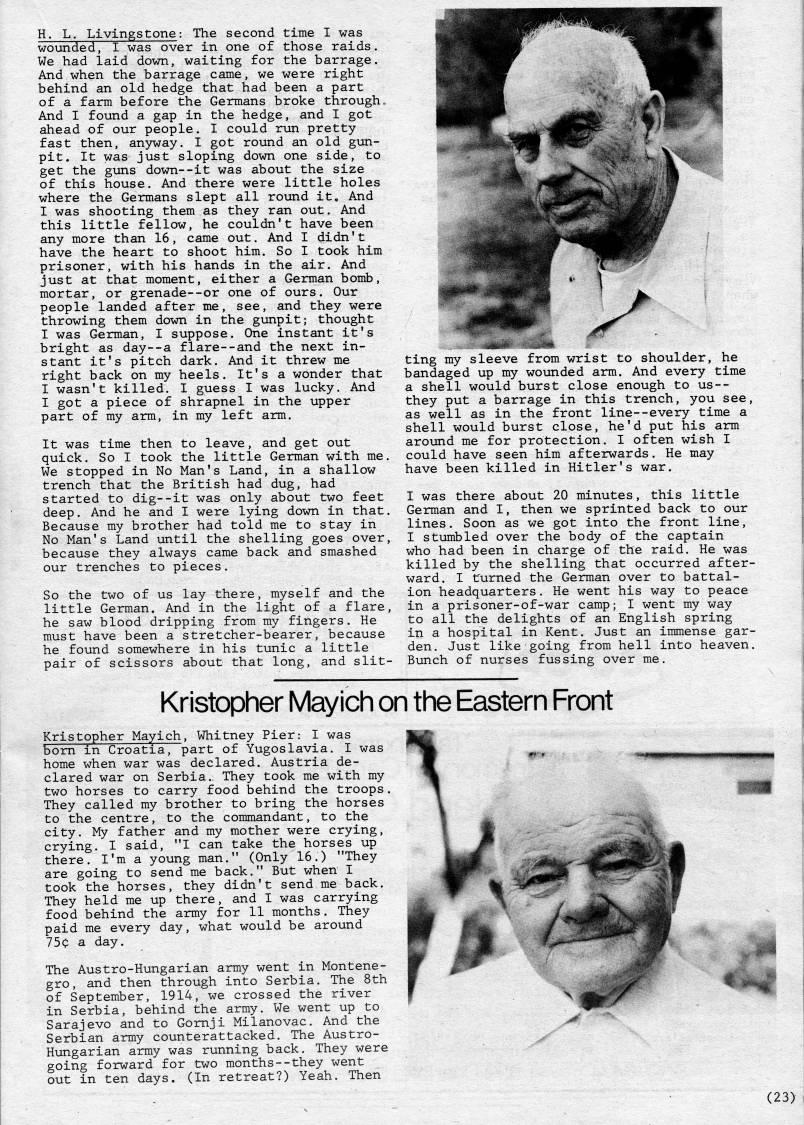 Published by Ronald Caplan on 1983/6/1 (453 reads)H. L. Livingstone: The second time I was wounded, I was over in one of those raids. We had laid down, waiting for the barrage. And when the barrage came, we were right behind an old hedge that had been a part of a farm before the Germans broke through. And I found a gap in the hedge, and I got ahead of our people. I could run pretty fast then, anyway. I got round an old gun- pit. It was just sloping down one side, to get the guns down--it was about the size of this house. And there were little holes where the Germans slept all round it. And I was shooting them as they ran out. And this little fellow, he couldn't have been any more than 16, came out. And I didn't have the heart to shoot him. So I took him prisoner, with his hands in the air. And just at that moment, either a German bomb, mortar, or grenade--or one of ours. Our people landed after me, see, and they were throwing them dovm in the gunpit; thought I was German, I suppose. One instant it's bright as day--a flare--and the next in? stant it's pitch dark. And it threw me right back on my heels. It's a wonder that I wasn't killed. I guess I was lucky. And I got a piece of shrapnel in the upper part of my arm, in my left arm. It was time then to leave, and get out quick. So I took the little German with me. We stopped in No Man's Land, in a shallow trench that the British had dug, had started to dig--it was only about two feet deep. And he and I were lying down in that. Because my brother had told me to stay in No Man's Land until the shelling goes over, because they always came back and smashed our trenches to pieces. So the two of us lay there, myself and the little German. And in the light of a flare, he saw blood dripping from my fingers. He must have been a stretcher-bearer, because he found somewhere in his tunic a little pair of scissors about that long, and slit? ting my sleeve from wrist to shoulder, he bandaged up my wounded arm. And every time a shell would burst close enough to us-- they put a barrage in this trench, you see, as well as in the front line--every time a shell would burst close, he'd put his arm around me for protection. I often wish I could have seen him afterwards. He may have been killed in Hitler's war. I was there about 20 minutes, this little German and I, then we sprinted back to our lines. Soon as we got into the front line, I stumbled over the body of the captain who had been in charge of the raid. He was killed by the shelling that occurred after? ward. I turned the German over to battal? ion headquarters. He went his way to peace in a prisoner-of-war camp; I went my way to all the delights of an English spring in a hospital in Kent. Just an immense gar? den. Just like going from hell into heaven. Bunch of nurses fussing over me. Kristopher Mayich on the Eastern Front Kristopher Mayich, Whitney Pier: I was bom in Croatia, part of Yugoslavia. I was home when war was declared. Austria de? clared war on Serbia., They took me with my two horses to carry food behind the troops. They called my brother to bring the horses to the centre, to the commandant, to the city. My father and my mother were crying, crying. I said, "I can take the horses up there. I'm a young man." (Only 16.) "They are going to send me back." But when I took the horses, they didn't send me back. They held me up there, and I was carrying food behind the army for 11 months. They paid me every day, what would be around 75c a day. The Austro-Hungarian army went in Montene? gro, and then through into Serbia. The 8th of September, 1914, we crossed the river in Serbia, behind the army. We went up to Sarajevo and to Gomji Milanovac. And the Serbian army counterattacked. The Austro- Hungarian army was running back. They were going forward for two months--they went out in ten days. (In retreat?) Yeah. Then (23)
