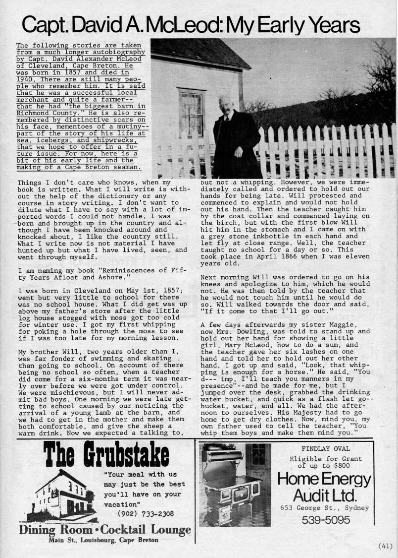Published by Ronald Caplan on 1983/6/1 (300 reads)Capt. David A. McLeod: My Early Years The following stories are taken from a much longer autobiography by Capt. David Alexander McLeod of Cleveland, Cape Breton. He was born in 1857 and died in 1940. There are still many peo? ple who remember him. It is said that he was a successful local merchant and quite a farmer-- that he had "the biggest barn in Richmond County." He is also re? membered by distinctive scars on his face, mementoes of a mutiny-- part of the story of his life at sea, icebergs, and shipwrecks, that we hope to offer in a fu? ture issue. For now, here is a bit of his early life and the making of a Cape Breton seaman. P Things I don't care who knows, when my book is written. What I will write is with? out the help of the dictionary or any course in story writing. I don't want to dilute what I have to say with a lot of im? ported words I could not handle. I was bom and brought up in the country and al? though I have been knocked around and knocked about, I like the country still. What I write now is not material I have hunted up but what I have lived, seen, and went through myself. I am naming my book "Reminiscences of Fif? ty Years Afloat and Ashore." I was born in Cleveland on May 1st, 1857; went but very little to school for there was no school house. What I did get was up above my father's store after the little log house stogged with moss got too cold for winter use. I got m.y first whipping for poking a hole through the moss to see if I was too late for my morning lesson. My brother Will, two years older than I, was far fonder of swimming and skating . than going to school. On account of there being no school so often, when a teacher did come for a six-months term it was near? ly over before we were got under control. We were mischievous, but I will never ad? mit bad boys. One morning we were late get? ting to school caused by our noticing the arrival of a young lamb at the bam, and we had to get in the mother and make them both comfortable, and give the sheep a warm drink. Now we expected a talking to. but not a whipping. However, we were imme? diately called and ordered to hold out our hands for being late. Will protested and commenced to explain and would not hold out his hand. Then the teacher caught him by the coat collar and commenced laying on the birch, but with the first blow Will hit him in the stomach and I came on with a grey stone inkbottle in each hand and let fly at close range. Well, the teacher taught no school for a day or so. This took place in April 1866 when I was eleven years old. Next morning Will was ordered to go on his knees and apologize to him, which he would not. He was then told by the teacher that he would not touch him until he would do so. Will walked towards the door and said, "If it come to that I'll go out." A few days afterwards my sister Maggie, now Mrs. Bowling, was told to stand up and hold out her hand for showing a little girl, Mary McLeod, how to do a sum, and the teacher gave her six lashes on one hand and told her to hold out her other hand. I got up and said, "Look, that whip? ping is enough for a horse." He said, "You d imp, I'll teach you manners in my presence"--and he made for me, but I jumped over the desk, grabbed the drinking water bucket, and quick as a flash let go-- bucket, water, and all. We had the after? noon to ourselves. His Majesty had to go home to get dry clothes. Now, mind you, my own father used to tell the teacher, "You whip them boys and make them mind you." Tbe Grubstake "Your meal with us may just be the best you'll have on your vacation" (902) 733-2308 Dining Room • Cocktail Lounge Main St., Louisbourg, Cape Breton FINDLAY OVAL Eligible for Grant of up to $800 Home Energy Audit Ltd. 653 George St., Sydney 539-5095