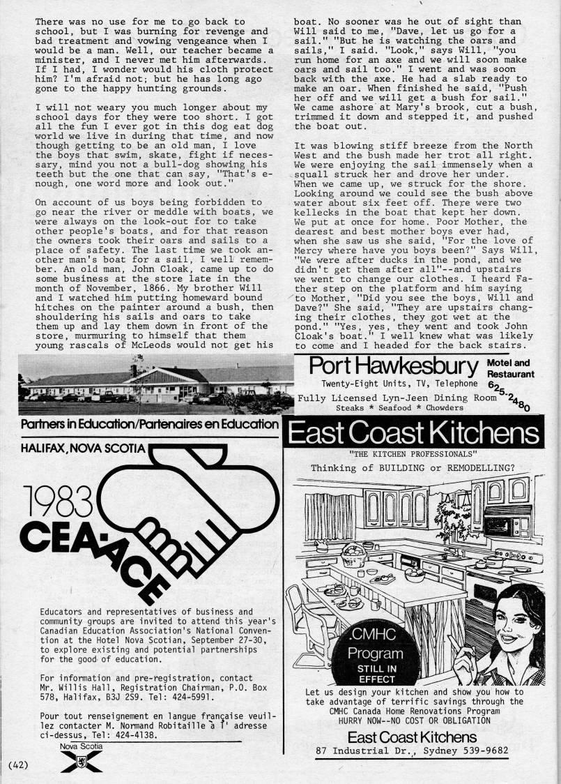 Published by Ronald Caplan on 1983/6/1 (286 reads)There was no use for me to go back to school, but I was burning for revenge and bad treatment and vowing vengeance when I would be a man. Well, our teacher became a minister, and I never met him afterwards. If I had, I wonder would his cloth protect him? I'm afraid not; but he has long ago gone to the happy hunting grounds. I will not weary you much longer about my school days for they were too short. I got all the fun I ever got in this dog eat dog world we live in during that time, and now though getting to be an old man, I love the boys that swim, skate, fight if neces? sary, mind you not a bull-dog showing his teeth but the one that can say, "That's e- nough, one word more and look out." On account of us boys being forbidden to go near the river or meddle with boats, we were always on the look-out for to take other people's boats, and for that reason the owners took their oars and sails to a place of safety. The last time we took an? other man's boat for a sail, I well remem? ber. An old man, John Cloak, came up to do some business at the store late in the month of November, 1866. My brother Will and I watched him putting homeward bound hitches on the painter around a bush, then shouldering his sails and oars to take them up and lay them down in front of the store, murmuring to himself that them young rascals of McLeods would not get his i'MiPw Partners In Education/Partenalres en Educatic HALIFAX,NOVA SCOTIA I boat. No sooner was he out of sight than Will said to me, "Dave, let us go for a sail." "But he is watching the oars and sails," I said. "Look," says Will, "you run home for an axe and we will soon make oars and sail too." I went and was soon back with the axe. He had a slab ready to make an oar. When finished he said, "Push her off and we will get a bush for sail." We came ashore'at Mary's brook, cut a bush, trimmed it down and stepped it, and pushed the boat out. It was blowing stiff breeze from the North West and the bush made her trot all right. We were enjoying the sail immensely when a squall struck her and drove her under. When we came up, we struck for the shore. Looking around we could see the bush above water about six feet off. There were two kellecks in the boat that kept her down. We put at once for home. Poor Mother, the dearest and best mother boys ever had, when she saw us she said, "For the love of Mercy where have you boys been?" Says Will, "We were after ducks in the pond, and we didn't get them after all"--and upstairs we went to change our clothes. I heard Fa? ther step on the platform and him saying to Mother, "Did you see the boys. Will and Dave?" She said, "They are upstairs chang? ing their clothes, they got wet at the pond." "Yes, yes, they went and took John Cloak's boat." I well knew what was likely to come and I headed for the back stairs. Port Hawkesbury Motel and Restaurant Twenty-Eight Units, TV, Telephone 60 I Fully Licensed Lyn-Jeen Dining Room "2' Steaks * Seafood * Chowders ?o /A SCOTIA '"''' Educators and representatives of business and community groups are invited to attend this year's Canadian Education Association's National Conven? tion at the Hotel Nova Scotian, September 27-30, to explore existing and potential partnerships for the good of education. For information and pre-registration, contact Mr. Willis Hall, Registration Chairman, P.O. Box 578, Halifax, B3J 2S9. Tel: 424-5991. Pour tout renseignement en langue frxincaise veuil- lez contacter M. Normand Robitaille"a f' adresse ci-dessus, Tel: 424-4138. (42) Nova Scotia East Coast Kitchens "THE KITCHEN PROFESSIONALS" Thinking of BUILDING or REMODELLING? Let us design your kitchen and show you how to take advantage of terrific savings through the CMHC Canada Home Renovations Program HURRY NOW-NO COST OR OBLIGATION East Coast Kitchens 87 Industrial Dr., Sydney 539-9682