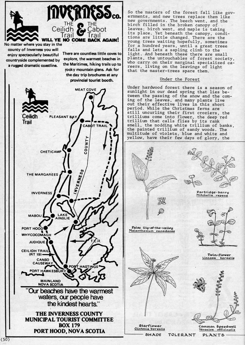 Published by Ronald Caplan on 1983/6/1 (303 reads)THE A THE Ceilidh XL Cabot Trail ''Trail WILL YE NO COME BACK AGAIN*. No nnatter where you stay in the county of Inverness you will enjoy spectacularly beautiful There are countless little coves to countryside complemented by e'P'ore, the warmest beaches in a rugged dramatic coastline, ''e Maritimes, hiking trails up to focky mountain glens. Ask for the day trip brochures at any provincial tourist booth. "Our beaches have the v'rmest waters, our people have the kindest hearts." THE INVERNESS COUNTY MUNICIPAL TOURIST COMMITTEE BOX 179 PORT HOOD, NOVA SCOTIA So the masters of the forest fall like gov? ernments, and new trees replace them like new governments. The beech went, and the birch filled in the broken canopy of leaves; birch went, and maple is taking its place. Yet beneath the canopy, condi? tions are little changed • There are the young trees waiting hopefully, sometimes for a hundred years, until a great treee falls and lets a sapling climb to the light. And beneath these there are small plants, the untouchables of forest society, who carry on their marginal specialized ca? reers , living on the leavings of light that the master-trees spare them. Under the Forest Under hardwood forest there is a season of sunlight in our dead spring that lies be? tween the passing of the snow and the com? ing of the leaves, and many plants live out their effective lives in this short period. While the Christmas ferns are still uncurling their first croziers, the trilliioms come into flower, the deep red trillium that calls flies by its rank smell, the nodding white trillium of banks, the painted trillium of sandy woods. The multitude of violets, blue and white and yellow, have their few days of glory, the Starf lower CUntontg boreatls Common Speedwell Verorttca officinalis SHADE TOLERANT PLANTS-