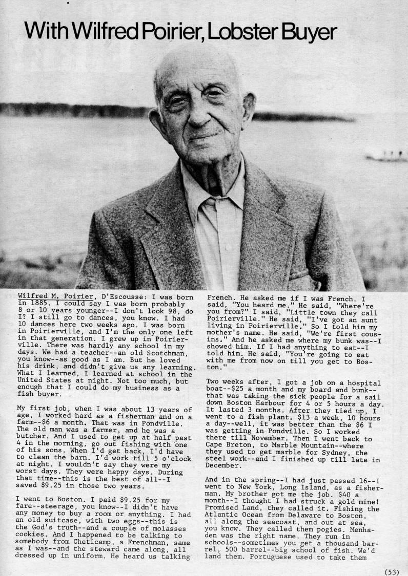 Published by Ronald Caplan on 1983/6/1 (624 reads)With Wilfred Pbirier, Lobster Buyer "'J*', . 3'- ?? - >''1 V - - " -'"''' *1 '' m ' ??' • ?-i-'i -.*''*; ' ' ??'' -, '_ i |j[W*- A'''' 'fe> ??pr'-. 'K' 'K?' 'R'' Wilfred M. Poirier, D'Escousse: I was born in 1885. I could say I was bom probably 8 or 10 years younger--! don't look 98, do I? I still go to dances, you know. I had 10 dances here two weeks ago. I was bom in Poirierville, and I'm the only one left in that generation. I grew up in Poirier? ville. There was hardly any school in my days. We had a teacher--an old Scotchman, you know--as good as I am. But he loved his drink, and didn't give us any learning. What I learned, I learned at school in the United States at night. Not too much, but enough that I could do my business as a fish buyer. My first job, when I was about 13 years of age, I worked hard as a fisherman and on a farm--$6 a month. That was in Pondville. The old man was a farmer, and he was a butcher. And I used to get up at half past 4 in the morning, go out fishing with one of his sons. When I'd get back, I'd have to clean the barn. I'd work till 5 o'clock at night. I wouldn't say they were my worst days. They were happy days. During that time--this is the best of all--I saved $9.25 in those two years. I went to Boston. I paid $9.25 for my fare--steerage, you know--I didn't have any money to buy a room or anything. I had an old suitcase, with two eggs--this is the God's truth--and a couple of molasses cookies. And I happened to be talking to somebody from Cheticamp, a Frenchman, same as I was--and the steward came along, all dressed up in uniform. He heard us talking French. He asked me if I was French. I said, "You heard me." He said, "Where're you from?" I said, "Little town they call Poirierville." He said, "I've got an aunt living in Poirierville." So I told him my mother's name. He said, "We're first cous? ins." And he asked me where my bunk was--I showed him. If I had anything to eat--I told him. He said, "You're going to eat with me from now on till you get to Bos? ton." Two weeks after, I got a job on a hospital boat--$25 a month and my board and bunk-- that was taking the sick people for a sail down Boston Harbour for 4 or 5 hours a day. It lasted 3 months. After they tied up, I went to a fish plant. $13 a week, 10 hours a day--well, it was better than the $6 I was getting in Pondville. So I worked there till November. Then I went back to Cape Breton, to Marble Mountain--where they used to get marble for Sydney, the steel work--and I finished up till late in December. And in the spring--! had just passed 16--I went to New York, Long Island, as a fisher? man. My brother got me the job. $40 a month--I thought I had struck a gold mine! Promised Land, they called it. Fishing the Atlantic Ocean from Delaware to Boston, all along the seacoast, and out at sea, you know. They called them pogies. Menha? den was the right name. They run in schools--sometimes you get a thousand bar? rel, 500 barrel--big school of fish. We'd land them. Portuguese used to take them (53)
