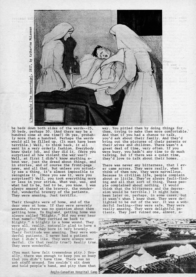 be beds down both sides of the wards--25, 30 beds, perhaps 50. (And there may be a hundred come at one time?) Oh yes, probab? ly more than a hundred. Perhaps the wards would all be filled up. (It must have been terrible.) Well, to think back, it all went in a very orderly fashion. Everybody knew tjieir job, and they did it. (Were you surprised at how violent the war was?) Well, at first I didn't know anything a- bout war, just the dread about things, and in stories, and of course the front-page news, and all that. But unless you actual? ly see a thing, it's almost impossible to recognize it. (Once you saw it, were you surprised?) Well, you took everything more or less in your stride. What was, was, and what had to be, had td be, you know. I was always amazed at the bravery, the wonder? ful, wonderful bravery of the patients. They were amazing. Just terrific. Their thoughts were of home, and of the dear ones at home. If they were severely wounded, there was no question about them getting home. To England, getting home was always called "Blighty." Did you ever hear that name?--"They carried me back to Blighty." A blighty is a home wound. They were all, really, naturally glad to have a blighty. And they bore it very bravely. Their fortitude was amazing. They were won? derful patients. I never had a patient that I didn't like. They were always won? derful. (Is that really true?) Really true. They were wonderful. (You must have felt tremendous pity.) Usu? ally, there was enough to keep you so busy that you didn't have time. There was no sob stuff around. You couldn't sit down and hold people's hand, and pity them that Anglo-Canadian Hospital Camp way. You pitied them by doing things for them, trying to make them more comfortable.' And then if you had a chance to talk, you'd ask about their family. And they'd bring out the pictures of their parents or their wives and children. There wasn't a great deal of time, very often. If you were busy, you hadn't any time to do much talking. But if there was a quiet time, they'd love to talk about their homes. There was never any bitterness, that I ev? er came across. They were really, when I think of them now, they were marvellous. Because in civilian life, people complain about so little. They're always fault-find? ing and all that sort of thing. These peo? ple complained about nothing. (I would think that the bitterness and the depres? sion would be terrible.) It might have been later on, perhaps, in some cases, but it wasn't when I knew them. They were de? lighted to be out of the war. It was a won? derful feeling--they were safe. They were really amazing. They were delightful pa? tients. They just ruined one, almost, a-