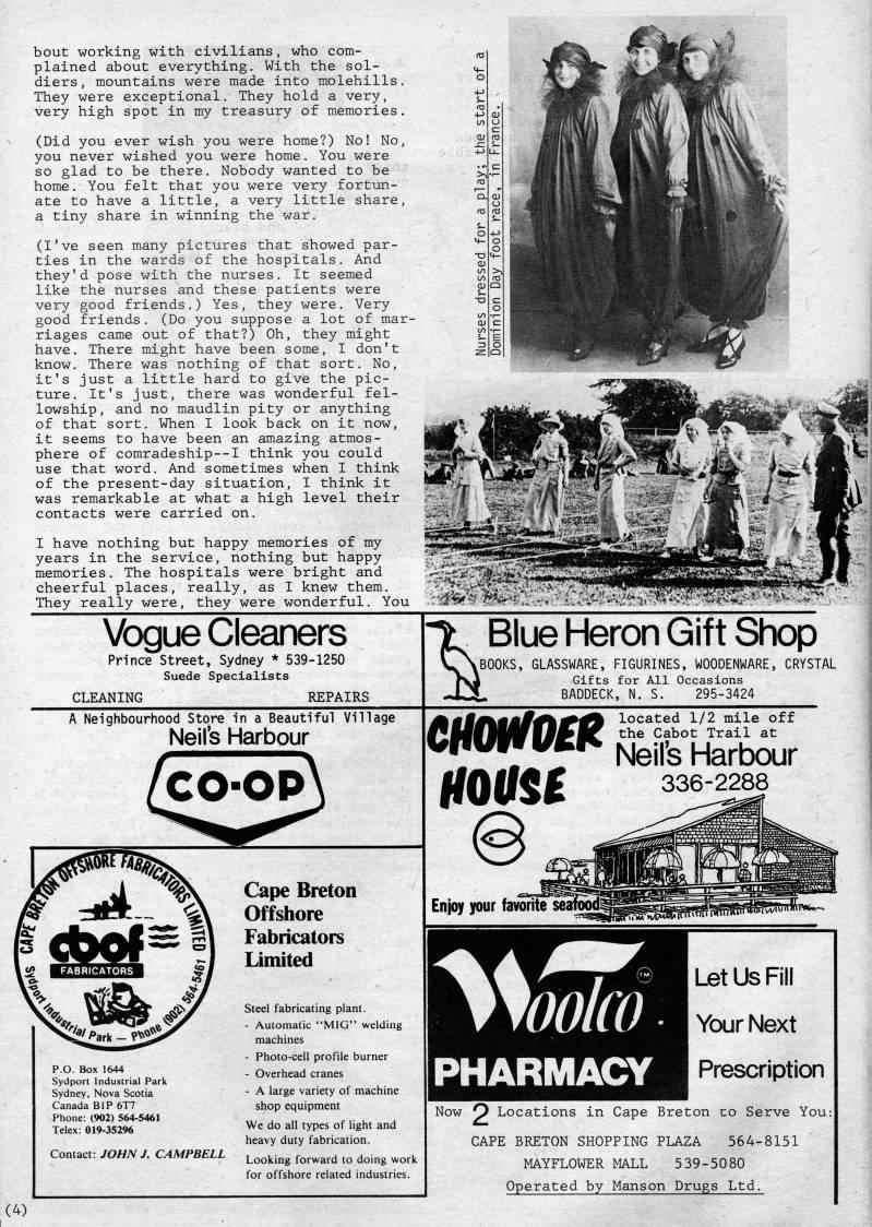 bout working with civilians, who com? plained about everything. With the sol? diers, mountains were made into molehills. They were exceptional. They hold a very, very high spot in my treasury of memories. (Did you ever wish you were home?) No! No, you never wished you were home. You were so glad to be there. Nobody wanted to be home. You felt that you were very fortun? ate to have a little, a very little share, a tiny share in winning the war. (I've seen many pictures that showed par? ties in the wards of the hospitals. And they'd pose with the nurses. It seemed like the nurses and these patients were very good friends.) Yes, they were. Very good friends. (Do you suppose a lot of mar? riages came out of that?) Oh, they might have. There might have been some, I don't know. There was nothing of that sort. No, it's just a little hard to give the pic? ture. It's just, there was wonderful fel? lowship, and no maudlin pity or anything of that sort. When I look back on it now, it seems to have been an amazing atmos? phere of comradeship--I think you could use that word. And sometimes when I think of the present-day situation, I think it was remarkable at what a high level their contacts were carried on. I have nothing but happy memories of my years in the service, nothing but happy memories. The hospitals were bright and cheerful places, really, as I knew them. They really were, they were wonderful. You Vogue Cleaners Prince Street, Sydney * 539-1250 Suede Specialists A Neighbourhood Store in a Beautiful Village Neil's Harbour CO-OP P.O. Box 1644 Sydport Industrial Park Sydney, Nova Scotia Canada BIP 6T7 Phone: (902) 564-5461 Telex: 019-35296 Contact: JOHN J. CAMPBELL Cape Breton Offshore Fabricators Limited Steel fabricating plant. - Automatic "MIG" welding machines - Photo-cell profile burner - Overhead cranes - A large variety of machine shop equipment We do all types of light and heavy duty fabrication. Looking forward to doing work for offshore related industries. nt Blue Heron Gift Shcp 0BOOKS, GLASSWARE, FIGURINES, WOOOENWARE, CRYSTAL Gifts for All Occasions BADDECK, N. S. 295-3424 mmofst ma located 1/2 mile off the Cabot Trail at Neil's Harbour 336-2288 Enjoy your favorite Let Us Fill Ycxjr Next Prescription Now O Locations in Cape Breton no Serve You: CAPE BRETON SHOPPING PLAZA 564-8151 MAYFLOWER MALL 539-5080 Operated by Manson Drugs Ltd. (4)