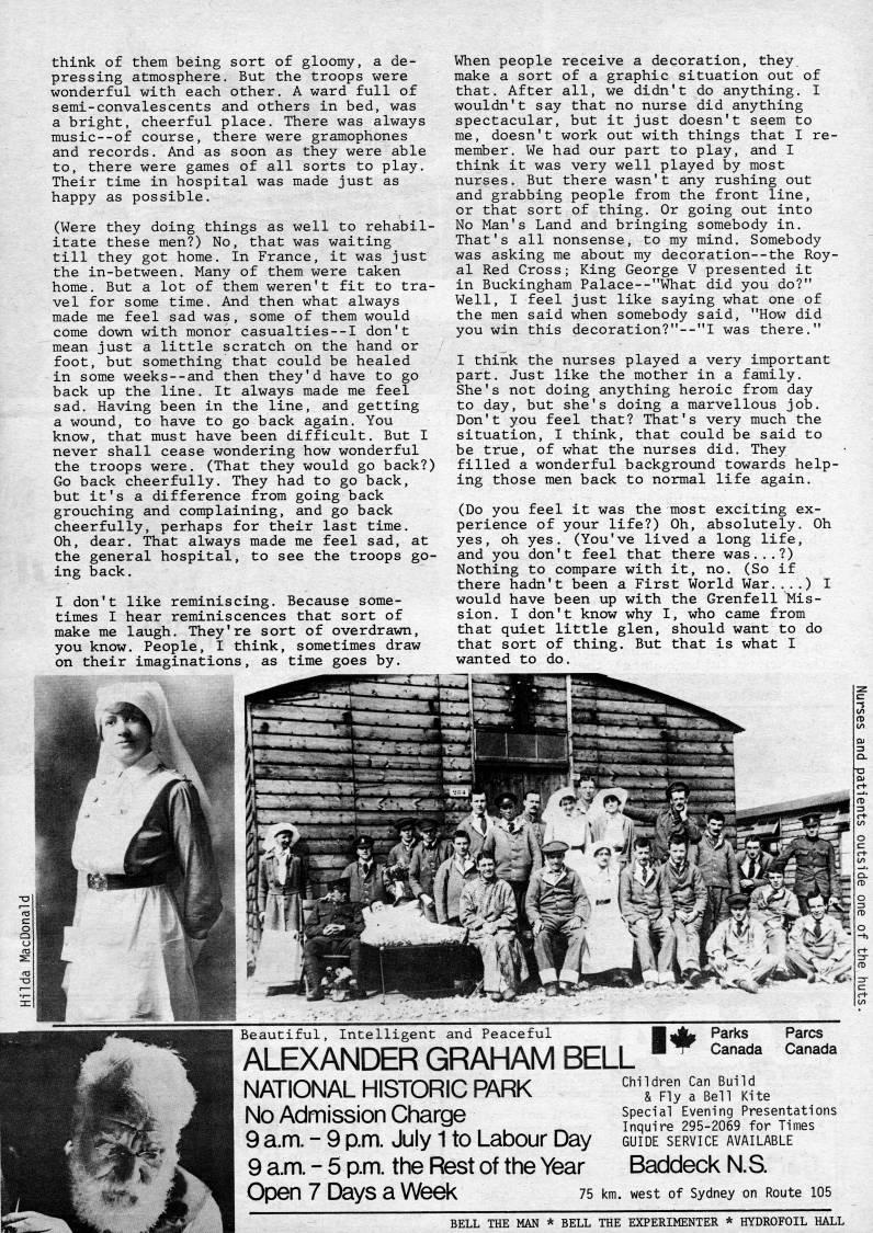 think of them being sort of gloomy, a de? pressing atmosphere. But the troops were wonderful with each other. A ward full of semi-convalescents and others in bed, was a bright, cheerful place. There was always music--of course, there were gramophones and records. And as soon as they were able to, there were games of all sorts to play. Their time in hospital was made just as happy as possible. (Were they doing things as well to rehabil? itate these men?) No, that was waiting till they got home. In France, it was just the in-between. Many of them were taken home. But a lot of them weren't fit to tra? vel for some time. And then what always made me feel sad was, some of them would come down with monor casualties--I don't mean just a little scratch on the hand or foot, but something that could be healed in some weeks--and then they'd have to go back up the line. It always made me feel sad. Having been in the line, and getting a wound, to have to go back again. You know, that must have been difficult. But I never shall cease wondering how wonderful the troops were. (That they would go back?) Go back cheerfully. They had to go back, but it's a difference from going back grouching and complaining, and go back cheerfully, perhaps for their last time. Oh, dear. That always made me feel sad, at the general hospital, to see the troops go? ing back. I don't like reminiscing. Because some? times I hear reminiscences that sort of make me laugh. They're sort of overdrawn, you know. People, I think, sometimes draw on their imaginations, as time goes by. When people receive a decoration, they make a sort of a graphic situation out of that. After all, we didn't do anything. I wouldn't say that no nurse did anything spectacular, but it just doesn't seem to me, doesn't work out with things that I re? member. We had our part to play, and I think it was very well played by most nurses. But there wasn't any rushing out and grabbing people from the front line, or that sort of thing. Or going out into No Man's Land and bringing somebody in. That's all nonsense, to my mind. Somebody was asking me about my decoration--the Roy? al Red Cross; King George V presented it in Buckingham Palace--"What did you do?" Well, I feel just like saying what one of the men said when somebody said, "How did you win this decoration?"--"I was there." I think the nurses played a very important part. Just like the mother in a family. She's not doing anything heroic from day to day, but she's doing a marvellous job. Don't you feel that? That's very much the situation, I think, that could be said to be true, of what the nurses did. They filled a wonderful background towards help? ing those men back to normal life again. (Do you feel it was the most exciting ex? perience of your life?) Oh, absolutely. Oh yes, oh yes. (You've lived a long life, and you don't feel that there was...?) Nothing to compare with it, no. (So if there hadn't been a First World War....) I would have been up with the Grenfell Mis? sion. I don't know why I, who came from that quiet little glen, should want to do that sort of thing. But that is what I wanted to do. Beautiful, Intelligent and Peaceful Idlb ALEXANDER GRAHAM BELL '' NATIONAL HISTORIC PARK No Admission Charge 9 a.m. - 9 p.m. July 1 to Labour Day 9 am. - 5 p.m. the Rest of the Year Parks Canada Pares Canada Children Can Build & Fly a Bell Kite Special Evening Presentations Inquire 295-2069 for Times GUIDE SERVICE AVAILABLE Baddeck N.S. Open 7 Days a Week 75 km. west of Sydney on Route 105 BELL THE MAN * BELL THE EXPERIMENTER * HYDROFOIL HALL