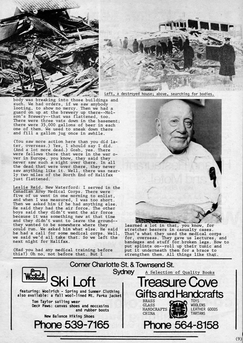 a destroyed house; above, searching for bodies. body was breaking into those buildings and such. We had orders, if we saw anybody- looting, to show no mercy. Then we had a guard on up at the brewery up there--Mol- son's Brewery--that was flattened, too. There were three vats down in the basement; there were 35,000 gallons of beer in each one of them. We used to sneak down there and fill a gallon jug once in awhile. (You saw more action here than you did la? ter, overseas.) Yes, I should say I did. (And a lot more dead.) Gosh, yes. There were fellows there that were in the war o- ver in Europe, you know, they said they never saw such a sight over there. In all the dead that were over there, they never saw anything like it. Well, there was near? ly two miles of the North End of Halifax just flattened. Leslie Reid, New Waterford: I served in the Canadian Army Medical Corps. There were five of us went in one morning to enlist, and when I was measured, I was too short. Then we asked him if he had anything else. He said they had the air force. The other boys said they didn't want the air force because it was something new at that time and they didn't want to leave the ground-- they wanted to be somewhere where they could run. We asked him what else. He said he had a call for some medical corps. Well, we said we'd all take that. So we left the next night for Halifax. (Had you had any medical training before this?) Oh no, not before that. But I . ..,> 'i learned a lot in that, you know, for stretcher bearers in casualty cases. That's what they used the medical corps for, overseas. They gave us lectures, and bandages and stuff for broken legs. How to put splints on--roll up their tunic and put it underneath them for a brace to strengthen them. All things like that. Corner Charlotte St. & Townsend St. Sydney a selection of Quality Books Ski Loft Treasure Cove featuring: Woolrich - Spring and Summer Clothing also available: a fall wool-lined Mt. Parka jacket Tom Taylor sailing wear Deck Paws: canvas shoes and moccasins and rubber boots New Balance Hiking Shoes Phone 539-7165 Gifts and Handcrafts TOYS WOOLENS LEATHER GOODS TARTANS Phone 564-8158