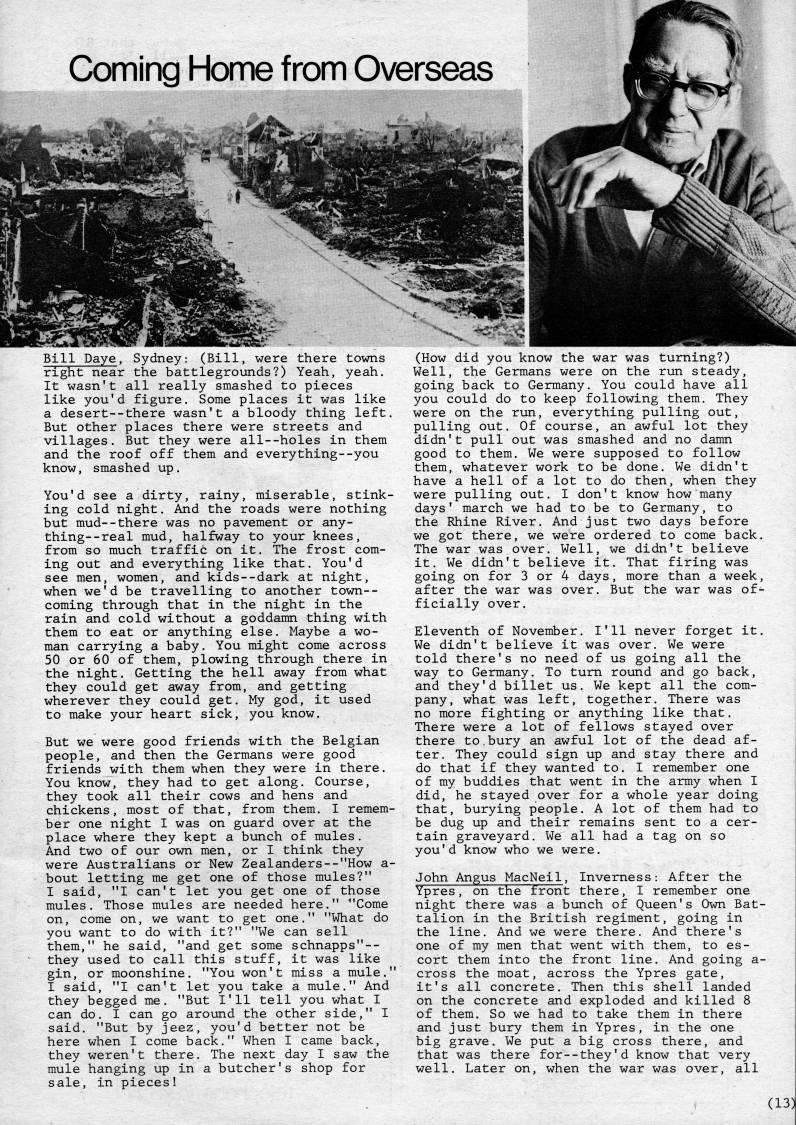 Published by Ronald Caplan on 1983/8/1 (285 reads)Coming Home from Overseas -.'' Bill Daye, Sydney: (Bill, were there towns right near the battlegrounds?) Yeah, yeah. It wasn't all really smashed to pieces like you'd figure. Some places it was like a desert--there wasn't a bloody thing left. But other places there were streets and villages. But they were all--holes in them and the roof off them and everything--you know, smashed up. You'd see a dirty, rainy, miserable, stink? ing cold night. And the roads were nothing but mud--there was no pavement or any- thing--real mud, halfway to your knees, from so much traffic on it. The frost com? ing out and everything like that. You'd see men, women, and kids--dark at night, when we'd be travelling to another town-- coming through that in the night in the rain and cold without a goddamn thing with them to eat or anything else. Maybe a wo? man carrying a baby. You might come across 50 or 60 of them, plowing through there in the night. Getting the hell away from what they could get away from, and getting wherever they could get. My god, it used to make your heart sick, you know. But we were good friends with the Belgian people, and then the Germans were good friends with them when they were in there. You know, they had to get along. Course, they took all their cows and hens and chickens, most of that, from them. I remem? ber one night I was on guard over at the place where they kept a bunch of mules. And two of our own men, or I think they were Australians or New Zealanders--"How a- bout letting me get one of those mules?" 1 said, "I can't let you get one of those mules. Those mules are needed here." "Come on, come on, we want to get one." "What do you want to do with it?" "We can sell them," he said, "and get some schnapps"-- they used to call this stuff, it was like gin, or moonshine. "You won't miss a mule." I said, "I can't let you take a mule." And they begged me. "But I'll tell you what 1 can do. I can go around the other side," I said. "But by jeez, you'd better not be here when I come back." When I came back, they weren't there. The next day I saw the mule hanging up in a butcher's shop for sale, in pieces! (How did you know the war was turning?) Well, the Germans were on the run steady, going back to Germany. You could have all you could do to keep following them. They were on the run, everything pulling out, pulling out. Of course, an awful lot they didn't pull out was smashed and no damn good to them. We were supposed to follow them, whatever work to be done. We didn't have a hell of a lot to do then, when they were pulling out. I don't know how many days' march we had to be to Germany, to the Rhine River. And just two days before we got there, we were ordered to come back. The war was over. Well, we didn't believe it. We didn't believe it. That firing was going on for 3 or 4 days, more than a week, after the war was over. But the war was of? ficially over. Eleventh of November. I'll never forget it. We didn't believe it was over. We were told there's no need of us going all the way to Germany. To turn round and go back, and they'd billet us. We kept all the com? pany, what was left, together. There was no more fighting or anything like that. There were a lot of fellows stayed over there to,bury an awful lot of the dead af? ter. They could sign up and stay there and do that if they wanted to. I remember one of my buddies that went in the army when I did, he stayed over for a whole year doing that, burying people. A lot of them had to be dug up and their remains sent to a cer? tain graveyard. We all had a tag on so you'd know who we were. John Angus MacNeil, Inverness: After the Ypres, on the front there, I remember one night there was a bunch of Queen's Own Bat? talion in the British regiment, going in the line. And we were there. And there's one of my men that went with them, to es? cort them into the front line. And going a- cross the moat, across the Ypres gate, it's all concrete. Then this shell landed on the concrete and exploded and killed 8 of them. So we had to take them in there and just bury them in Ypres, in the one big grave. We put a big cross there, and that was there for--they'd know that very well. Later on, when the war was over, all (13'
