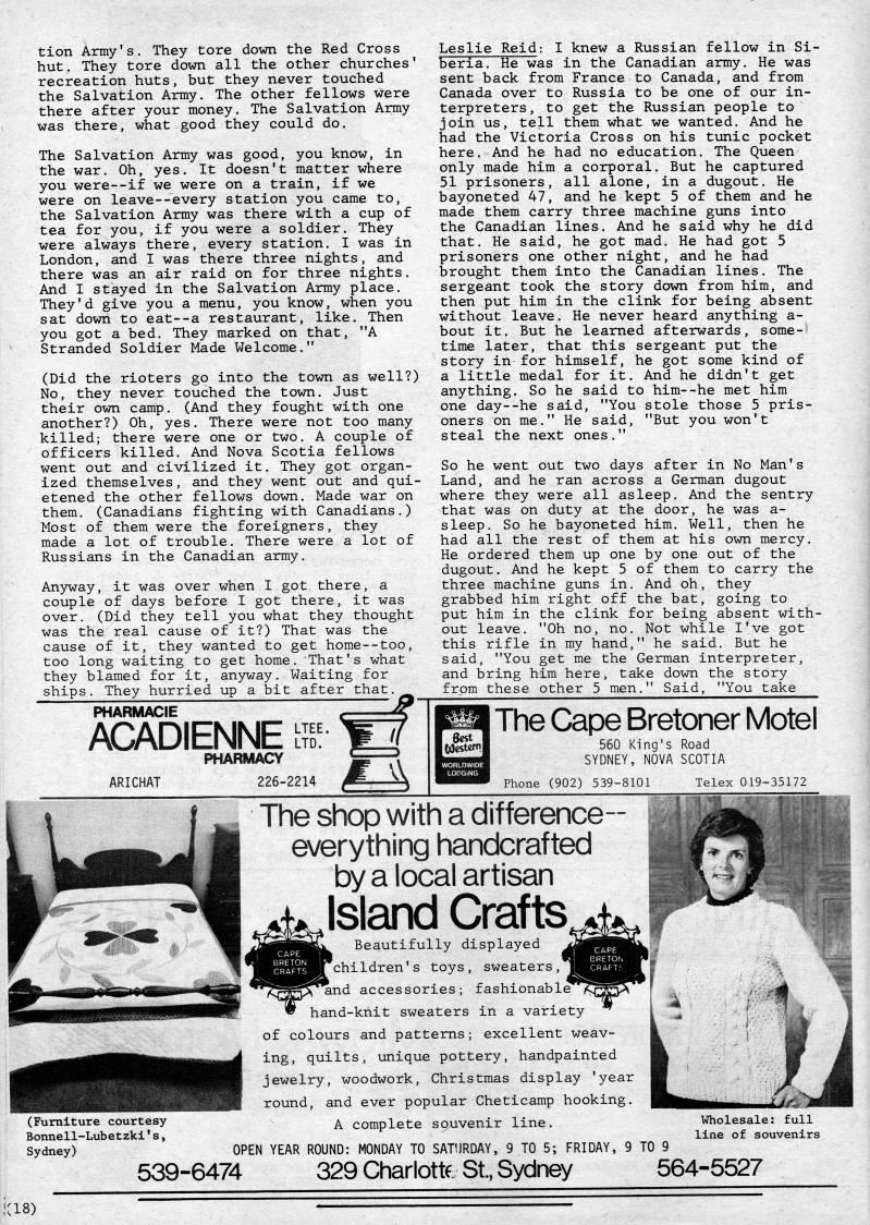 Published by Ronald Caplan on 1983/8/1 (287 reads)tion Army's. They tore down the Red Cross hut. They tore down all the other churches' recreation huts, but they never touched the Salvation Army. The other fellows were there after your money. The Salvation Army was there, what good they could do. The Salvation Army was good, you know, in the war. Oh, yes. It doesn't matter where you were--if we were on a train, if we were on leave--every station you came to, the Salvation Army was there with a cup of tea for you, if you were a soldier. They were always there, every station. I was in London, and I was there three nights, and there was an air raid on for three nights. And I stayed in the Salvation Army place. They'd give you a menu, you know, when you sat down to eat--a restaurant, like. Then you got a bed. They marked on that, "A Stranded Soldier Made Welcome." (Did the rioters go into the town as well?) No, they never touched the town. Just their own camp. (And they fought with one another?) Oh, yes. There were not too many killed; there were one or two. A couple of officers killed. And Nova Scotia fellows went out and civilized it. They got organ? ized themselves, and they went out and qui? etened the other fellows down. Made war on them. (Canadians fighting with Canadians.) Most of them were the foreigners, they made a lot of trouble. There were a lot of Russians in the Canadian army. An3A('ay, it was over when I got there, a couple of days before I got there, it was over. (Did they tell you what they thought was the real cause of it?) That was the cause of it, they wanted to get home--too, too long waiting to get home. That's what they blamed for it, anyway. Waiting for ships. They hurried up a bit after that. PHARMACIE ACADIENNE tl'' PHARMACY g 1 ARICHAT 226-2214 E=A Leslie Reid: I knew a Russian fellow in Si- beria. He was in the Canadian army. He was sent back from France to Canada, and from Canada over to Russia to be one of our in? terpreters, to get the Russian people to join us, tell them what we wanted. And he had the Victoria Cross on his tunic pocket here. And he had no education. The Queen only made him a corporal. But he captured 51 prisoners, all alone, in a dugout. He bayoneted 47, and he kept 5 of them and he made them carry three machine guns into the Canadian lines. And he said why he did that. He said, he got mad. He had got 5 prisoners one other night, and he had brought them into the Canadian lines. The sergeant took the story down from him, and then put him in the clink for being absent without leave. He never heard anything a- bout it. But he learned afterwards, some? time later, that this sergeant put the story in for himself, he got some kind of a little medal for it. And he didn't get anything. So he said to him--he met him one day--he said, "You stole those 5 pris? oners on me." He said, "But you won't steal the next ones," So he went out two days after in No Man's Land, and he ran across a German dugout where they were all asleep. And the sentry that was on duty at the door, he was a- sleep. So he bayoneted him. Well, then he had all the rest of them at his own mercy. He ordered them up one by one out of the dugout. And he kept 5 of them to carry the three machine guns in. And oh, they grabbed him right off the bat, going to put him in the clink for being absent with? out leave. "Oh no, no. Not while I've got this rifle in my hand," he said. But he said, "You get me the German interpreter, and bring him here, take down the story from these other 5 men." Said, "You take The Cape Bretoner Motel 560 King's Road SYDNEY, NOVA SCOTIA Phone (902) 539-8101 Telex 019-35172 The shop with a difference everything handcrafted by a local artisan Island Crafts (Furniture courtesy Bonnell-Lubetzki's, Sydney) Beautifully displayed children's toys, sweaters and accessories; fashionable hand-knit sweaters in a variety of colours and patterns; excellent weav? ing, quilts, unique pottery, handpainted jewelry, woodwork, Christmas display 'year round, and ever popular Cheticamp hooking. A complete souvenir line. OPEN YEAR ROUND: MONDAY TO SATURDAY, 9 TO 5; FRIDAY, 9 TO 9 Wholesale: full line of souvenirs 539-6474 329 Charlotte St., Sydney 564-5527 :;i8)