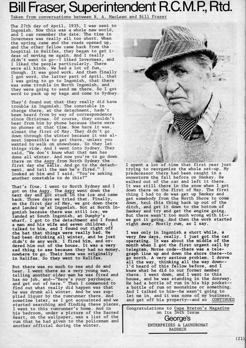 Published by Ronald Caplan on 1983/8/1 (1187 reads)Bill Fraser, Superintendent R.C.M.R, Rtd. Taken from conversations between R. A. MacLean and Bill Fraser The 27th day of April, 1935, I was sent to Ingonish. Now this was a whole new world, and I can remember the date. The time in Inverness was really all too short. When the spring came and the roads opened up, and the other fellow came back from the hospital in Halifax, they began to get i- deas of moving me again. And I really didn't want to go--I liked Inverness, and I liked the people particularly. There were all kinds. We had a lot of fun, though. It was good work. And then finally I got word, the latter part of April, that I was going to go to Ingonish, that there was some trouble in North Ingonish, and they were going to send me there. So I got word to pack up my bags and come to Sydney. They'd found out that they really did have trouble in Ingonish. The constable in charge there, at the detachment, hadn't been heard from by way of correspondence since Christmas. Of course, they couldn't hear from him by phone because there were no phones at that time. Now here it was, almost the first of May. They didn't go down through the winter because it was al? most impossible to get there, unless you wanted to walk on snowshoes. So they let things ride. And I went into Sydney. They said, "We don't know what that man has done all winter. And now you're to go down there on the Aspy from North Sydney the first day she sails. And go to the detach? ment, and tell the man he's fired." I looked at him and I said, "You're asking another constable to do this?" That's fine. I went to North Sydney and I got on the Aspy. The Aspy went down the next day and got stuck in the ice and came back. Three days we tried that. Finally, on the first day of May, we got down there and landed up*at Ingonish. Not at North In? gonish because there was still ice; we landed at South Ingonish, at Dunphy's wharf. I got to the detachment and I found a man and his wife and seven children. I talked to him, and I found out right off the bat that things were really bad. He had been drinking all winter, and he just didn't do any work. I fired him, and or? dered him out of the house. It was a very sad thing to see because they had no money, nowhere to go. Their home was originally in Halifax. So they went to Halifax. But there was so much to see and do and hear. I went there as a very young man, telling another older man he was fired and has no job, and • "Here's your paycheque, and get out of here." Then I commenced to find out what really did happen was that he was drunk all winter. And he was sup? plied liquor by the rumrunner there. And sometime later, as I got acquainted and we started searching and finding these places, I went to this rumrunner's home. And in his bedroom, under a picture of the Sacred Heart, on the wallpaper, was a list of the rum that he had given to the policeman and another official during the winter. I spent a lot of time that first year just trying to reorganize the whole set-up. My predecessor there had been caught in a snowstorm the fall before on Smokey. He walked out of the car and left it there. It was still there in the snow when I got down there on the first of May. The first thing I had to do was get up Smokey and get somebody from the North Shore to come down, haul this thing back up out of the ditch, and get it down to the bottom of Smokey and try and get the engine going. But there wasn't too much wrong with it-- we got it going. And then the work started right away. Mostly rum, as I say. I was only in Ingonish a short while, a very few days, really. I just got the car operating. It was about the middle of the month when I got the first urgent call by telegram, Morse code--there was a tele? graph line up and down the shore there--to go north. A very serious problem. I drove all the way, thinking all the way down-- I'd heard of this fellow before, and I knew what he did to our former member there • I went down, and I went to this house, and he was standing in the doorway. He had a bottle of rum in his hip pocket-- a bottle of rum or moonshine or something. And I talked to him--he wasn't going to let me in, and it was none of my business, and get off his property--and so CONTINUED Congratulations to Cape Breton's Magazine on Its 34th Issue George's ENTERPRISES & LAUNDROMAT BADDECK (21)