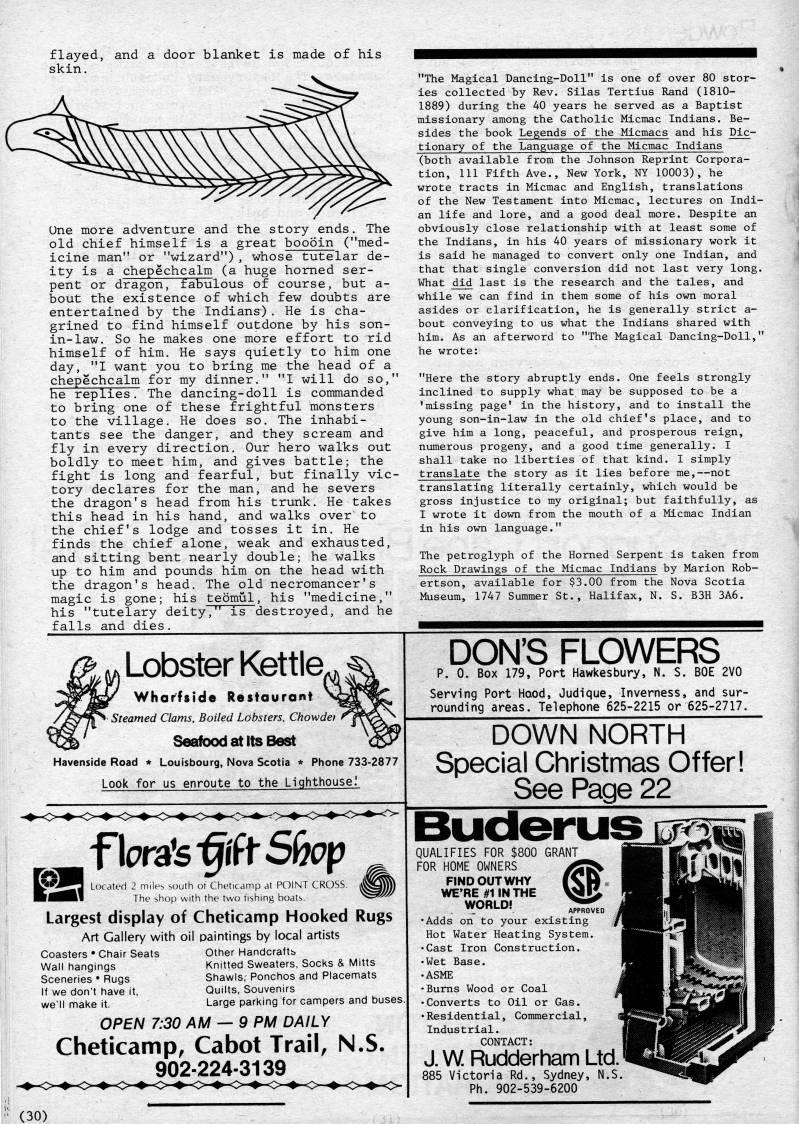 Published by Ronald Caplan on 1983/8/1 (383 reads)flayed, and a door blanket is made of his skin. One more adventure and the story ends. The old chief himself is a great boooin ("med? icine man" or "wizard"), whose tutelar de? ity is a chepechcalm (a huge horned ser? pent or dragon, fabulous of course, but a- bout the existence of which few doubts are entertained by the Indians). He is cha? grined to find himself outdone by his son- in-law. So he makes one more effort to rid himself of him. He says quietly to him one day, "I want you to bring me the head of a chepechcalm for my dinner." "I will do so," he replies. The dancing-doll is commanded to bring one of these frightful monsters to the village. He does so. The inhabi? tants see the danger, and they scream and fly in every direction. Our hero walks out boldly to meet him, and gives battle; the fight is long and fearful, but finally vic? tory declares for the man, and he severs the dragon's head from his trunk. He takes this head in his hand, and walks over to the chief's lodge and tosses it in. He finds the chief alone, weak and exhausted, and sitting bent nearly double; he walks up to him and pounds him on the head with the dragon's head. The old necromancer's magic is gone; his teomul, his "medicine," his "tutelary deity," is destroyed, and he falls and dies. "The Magical Dancing-Doll" is one of over 80 stor? ies collected by Rev. Silas Tertius Rand (1810- 1889) during the 40 years he served as a Baptist missionary among the Catholic Micmac Indians. Be? sides the book Legends of the Micmacs and his Dic? tionary of the Language of the Micmac Indians (both available from the Johnson Reprint Corpora? tion, Ul Fifth Ave., New York, NY 10003), he wrote tracts in Micmac and English, translations of the New Testament into Micmac, lectures on Indi? an life and lore, and a good deal more. Despite an obviously close relationship with at least some of the Indians, in his 40 years of missionary work it is said he managed to convert only one Indian, and that that single conversion did not last very long. What did last is the research and the tales, and while we can find in them some of his own moral asides or clarification, he is generally strict a- bout conveying to us what the Indians shared with him. As an afterword to "The Magical Dancing-Doll," he wrote: "Here the story abruptly ends. One feels strongly inclined to supply what may be supposed to be a 'missing page' in the history, and to install the young son-in-law in the old chief's place, and to give him a long, peaceful, and prosperous reign, numerous progeny, and a good time generally. I shall take no liberties of that kind. I simply translate the story as it lies before me, • not translating literally certainly, which would be gross injustice to my original; but faithfully, as I wrote it down from the mouth of a Micmac Indian in his own language." The petroglyph of the Horned Serpent is taken from Rock Drawings of the Micmac Indians by Marion Rob? ertson, available for $3.00 from the Nova Scotia Museum, 1747 Summer St., Halifax, N. S. B3H 3A6. Lobster Kettle, Whar'fside Restaurant > Steamed Clams, Boiled Lobsters. Chowdei Seafood at Its Best Havenside Road * Louisbourg, Nova Scotia * Phone 733-2877 Look for us enroute to the Lighthouse! fbra's''ift Shop Loccited 2 miles south ot Cheticamp at POINT CROSS. |'')))) The shop with the two fishing boats. s'fiv Largest display of Cheticamp Hooked Rugs Art Gallery with oil paintings by local artists Coasters • Chair Seats Other Handcraftb Wall hangings Knitted Sweaters, Socks & Mitts Sceneries • Rugs Shaw/Is,' Ponchos and Placemats If we don't have it, Quilts, Souvenirs we'll make it. Large parking for campers and buses OP??N 7:30 AM • 9 PM DAILY Cheticamp, Cabot Trail, N.S. 902-224-3139 DON'S FLOWERS p. 0. Box 179, Port Hawkesbury, N. S. BOE 2V0 Serving Port Haod, Judique, Inverness, and sur? rounding areas. Telephone 625-2215 or 625-2717. DOWN NORTH Special Christmas Offer! See Page 22 GRANT QUALIFIES FOR $800 FOR HOME OWNERS FIND OUT WHY WE'RE #1 IN THE WORLD! ', • • • ' • • Adds on to your existing Hot Water Heating System. • Cast Iron Construction. • Wet Base. • ASME • Bums Wood or Coal • Converts to Oil or Gas. • Residential, Coiranercial, Industrial. CONTACT: J.W.RudderhamLtd 885 Victoria Rd., Sydney, N.S Ph. 902-539-6200 (30)
