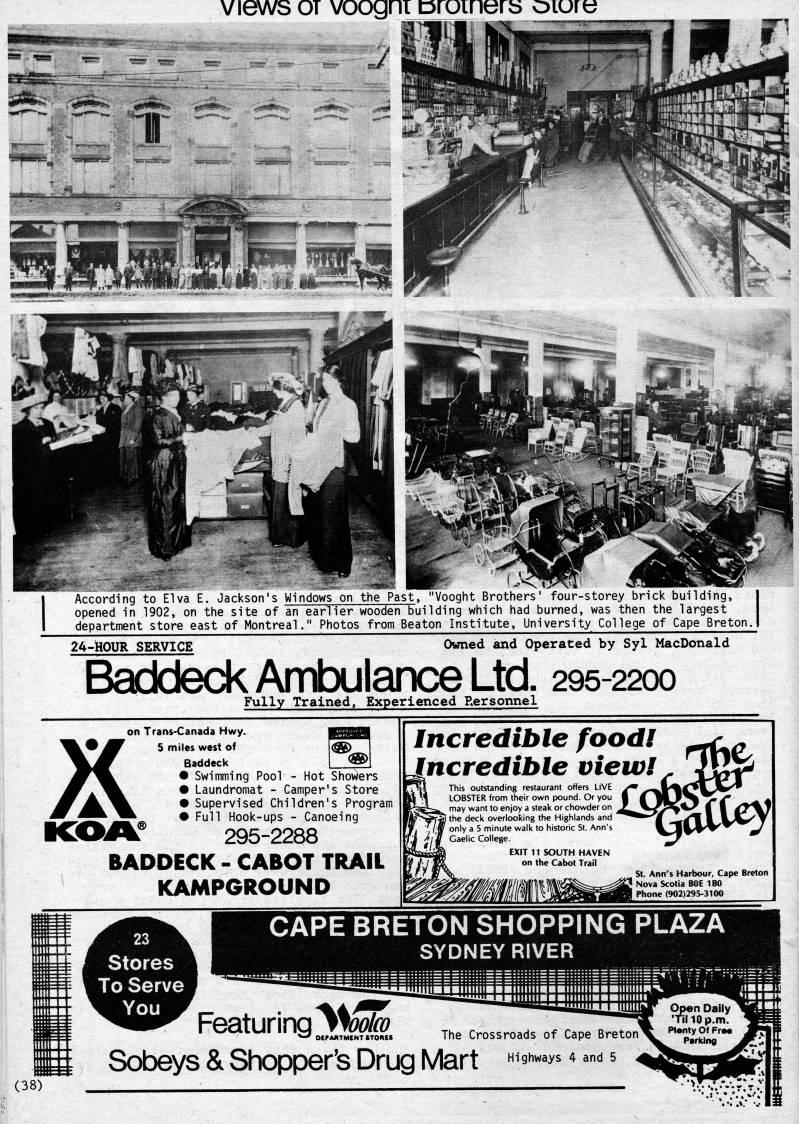 Published by Ronald Caplan on 1983/8/1 (428 reads)views OT voognijDToinerb oiurt? According to Elva E. Jackson's Windows on the Past. "Vooght Brothers' four-storey brick building, opened in 1902, on the site of an earlier wooden building which had burned, was then the largest department store east of Montreal." Photos from Beaton Institute, University College of Cape Breton. 24-HOUR SERVICE Owned and Operated by Syl MacDonald Baddeck Ambulance Ltd. 295-2200 Fully Trained, Experienced P.ersonnel ' on Trans-Canada Hwy. 5 miles west of Baddeck • Swimming Pool Hot Showers • Laundromat - Camper's Store • Supervised Children's Program • Full Hook-ups - Canoeing 295-2288 BADDECK - CABOT TRAIL ??CAMPGROUND Incredible food! Incredible view! yA This outstanding restaurant offers LiVE I " LOBSTER from their own pound. Or you St. Ann's Harbour, Cape Breton I Nova Scotia BOE IBO Phone (902)295-3100 Stores To Serve You CAPE BRETON SHOPPING PLAZA SYDNEY RIVER (38) '"' Featuring _'JFfg(??''' The crossroads of cape Breton' Sobeys & Shopper's Drug Mart '''hways 4 and 5