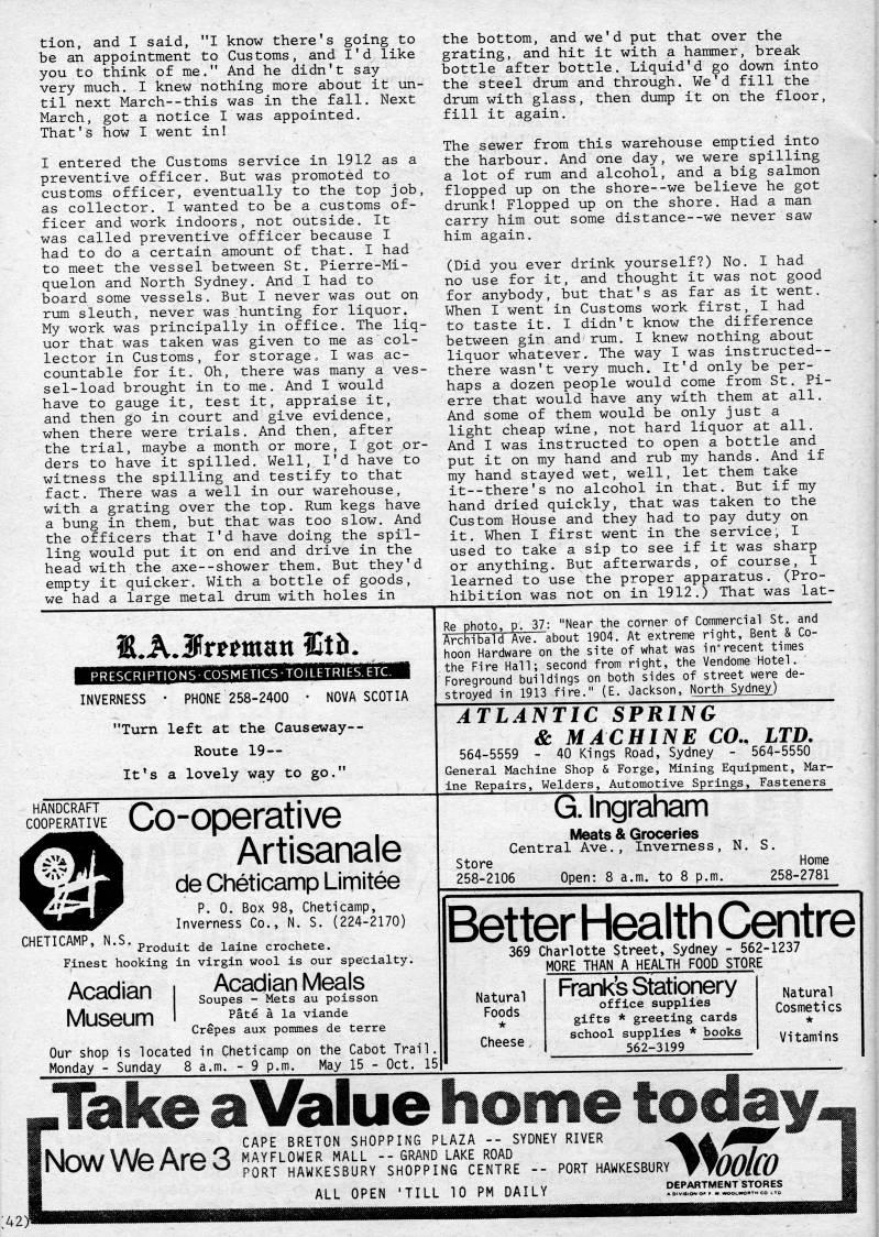 Published by Ronald Caplan on 1983/8/1 (288 reads)tion, and I said, "I know there's going to be an appointment to Customs, and I'd like you to think of me," And he didn't say very much, I knew nothing more about it un? til next March--this was in the fall. Next March, got a notice I was appointed. That's how I went in! I entered the Customs service in 1912 as a preventive officer. But was promoted to customs officer, eventually to the top job, as collector, I wanted to be a customs of? ficer and work indoors, not outside. It was called preventive officer because I had to do a certain amount of that, I had to meet the vessel between St. Pierre-Mi- quelon and North Sydney. And I had to board some vessels. But I never was out on rum sleuth, never was hunting for liquor. My work was principally in office. The liq? uor that was taken was given to me as col? lector in Customs, for storage, I was ac? countable for it. Oh, there was many a ves? sel-load brought in to me. And I would have to gauge it, test it, appraise it, and then go in court and give evidence, when there were trials. And then, after the trial, maybe a month or more, I got or? ders to have it spilled. Well, I'd have to witness the spilling and testify to that fact. There was a well in our warehouse, with a grating over the top. Rum kegs have a bung in them, but that was too slow. And the officers that I'd have doing the spil? ling would put it on end and drive in the head with the axe--shower them. But they'd empty it quicker. With a bottle of goods, we had a large metal drum with holes in the bottom, and we'd put that over the grating, and hit it with a hammer, break bottle after bottle. Liquid'd go down into the steel drum and through. We'd fill the drum with glass, then dump it on the floor, fill it again. The sewer from this warehouse emptied into the harbour. And one day, we were spilling a lot of rum and alcohol, and a big salmon flopped up on the shore--we believe he got drunk! Flopped up on the shore. Had a man carry him out some distance--we never saw him again. (Did you ever drink yourself?) No. I had no use for it, and thought it was not good for anybody, but that's as far as it went. When I went in Customs work first, I had to taste it, I didn't know the difference between gin and rum. I knew nothing about liquor whatever. The way I was instructed-- there wasn't very much. It'd only be per? haps a dozen people would come from St. Pi? erre that would have any with them at all. And some of them would be only just a light cheap wine, not hard liquor at all. And I was instructed to open a bottle and put it on my hand and rub my hands. And if my hand stayed wet, well, let them take it--there's no alcohol in that. But if my hand dried quickly, that was taken to the Custom House and they had to pay duty on it. When I first went in the service, I used to take a sip to see if it was sharp or anything. But afterwards, of course, I learned to use the proper apparatus. (Pro? hibition was not on in 1912.) That was lat- ',K.3fmmun Ctft. PRESCRIPTIONS-COSMETICSTOILETRIfcb. ETC. INVERNESS PHONE 258-2400 NOVA SCOTIA "Turn left at the Causeway • Route 19 • It's a lovely way to go." Re photo, p. 37: "Near the corner of Commercial St, and Archibald Ave, about 1904, At extreme right. Bent & Co- hoon Hardware on the site of what was in*recent times the Fire Hall; second from right, the Vendome Hotel. Foreground buildings on both sides of street were de? stroyed in 1913 fire," (E, Jackson, North Sydney) ATLANTIC SPRING & MACHINE CO.. LTD. 564-5559 - 40 Kings Road, Sydney - 564-5550 General Machine Shop & Forge, Mining Equipment, Mar- ine Repairs, Welders, Automotive Springs, Fasteners G, Ingraham CHETICAMP, N.S.. Co-operative Artisanale de Cheticamp Limitee p. 0. Box 98, Cheticamp, Inverness Co., N. S. (224-2170) Meats & Groceries Central Ave., Inverness, N. S. Store 258-2106 Open: 8 a.m. to 8 p.m. Home 258-2781 Produit de laine crochete. Finest hooking in virgin wool is our specialty. Acadian Meals Soupes - Mets au poisson Pate a la viande Crepes aux pommes de terre Our shop is located in Cheticamp on the Cabot Trail. Monday - Sunday 8 a.m. - 9 p.m. May 15 - Oct. 15 Acadian Museum Better Health Centre 369 Charlotte Street, Sydney - 562-1237 MORE THAN A HEALTH FOOD STORE Natural Foods Cheese Frank' Stationery office supplies gifts * greeting cards school supplies * books 562-3199 Natural Cosmetics Vitamins :42)lai Take a Value . , ,., - ?? CAPE BRETON SHOPPING Now WP ArP r? MAYFLOWER MALL --GRAND i'K'MM vvv'/Aiv'w pQ'j HAWKESBURY SHOPPI ALL OPEN 'TILL 10 PM DAILY home todawi LAZA -- SYDNEY RIVER LAKE ROAD NG CENTRE -- PORT HAWKESBURY DEPARTMENT STORES