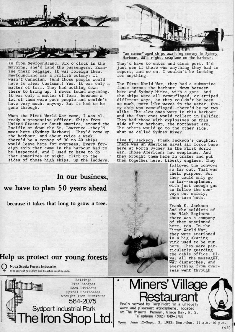 Published by Ronald Caplan on 1983/8/1 (298 reads)in from Newfoundland. Six o'clock in the morning, she'd land the passengers. Exam? ine their baggage. It was foreign then, Newfoundland was a British colony; it wasn't Canadian, (And those people would have to clear Customs,) Yes, It was only a matter of form. They had nothing down there to bring up. I never found anything. It was only a matter of form, because a lot of them were poor people and wouldn't have very much, anyway.. But it had to be gone through. When the First World War came, I was al? ready a preventive officer. Ships from United States or South America, around the Pacific or down the St. Lawrence--they'd meet here (Sydney Harbour). They'd come up the harbour, and about twice a week, there'd be a convoy of 30 to 40 ships would leave here for overseas. Every for? eign ship that came in the harbour had to be inspected. And I used to have to do that sometimes at night, climb up the sides of those high ships, up the ladders. In our business, we have to plan 50 years ahead because it takes that long to grow a tree. Help us protect our young forests Nova Scotia Forest Industries Producers of newsprint and bleached sulphite pulp yfe''s' Two camouflaged ships awaiting convoy in Sydney Harbour, WWl; right, seaplane on the harbour. They'd have to enter and clear port. I'd just see if there was anything they had to report, and so on. I wouldn't be looking for anything. The First World War, they had a submarine fence across the harbour, down between here and Sydney Mines, with a gate. And the ships were all camouflaged, or striped different ways, so they couldn't be seen so much, more like waves in the water. Eve? ry ship was camouflaged--there'd be no two alike. The slow ones were in this harbour and the fast ones would collect in Halifax. They had those with explosives on this side of the harbour, the northwest arm. The others would go to the other side, what we called Sydney River. Elva E. Jackson,. Frank Jackson's daughter: There was an American naval air force base here at North Sydney in the First World War. Those Americans had seaplanes. And they brought them here in crates and put them together here. Liberty engines. They followed the convoys so far out. That was f their purpose. But J, they could only go "' so far-- seaplanes , with just enough gas to follow the con? voys out safely, then turn back. Frank E. Jackson: And the soldiers of the 94th Regiment-- there was a company of them stationed here, too. In the First World War, they were stationed in a big skating rink used to be out here. They were par? ticularly guarding the cable office. El- [va: All the messages, war dispatches, and everything from over? seas went through J' Railings Fire Escapes Room Dividers Spiral Staircases Wrought Iron Furniture 564-2075 Sydport Industrial Park The Iron Shop Ltd. Miners'Village Restaurant Meals served by lamplight in a uniquely warm and pleasant atmosphere, located at The Miners' Museum, Glace Bay, N. S. Telephone (902) 849-1788 Open; June 12-Sept. 3, 1983; Mon.-Sun. 11 a.m.-10 p