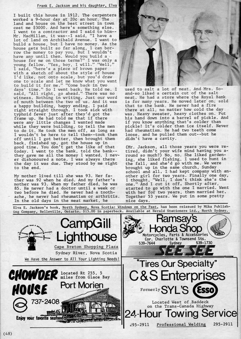 Published by Ronald Caplan on 1983/8/1 (356 reads)Frank E. Jackson and his daughter, Elva I built this house in 1912. The carpenters worked a 9-hour day at 20c an hour. The land and house on the best street in town cost me $3000. And here's something else. I went to a contractor and I said to him-- Mr. MacMillan, it was--I said, "I have a lot of land on Archibald Avenue. I want to build a house, but I have no money. As the house gets built so far along, I can bor? row the money to pay you. But I wouldn't have any until then. Would you build a - house for me on those terms?" I was only a young fellow. "Yes, boy, I will." "Well," I said, "here's a piece of brown paper with a sketch of about the style of house I'd like, not onto scale, but you'd draw one to scale and let me know what you want to build it for me." "Come back in two days' time." So I went back. He told me. I said, "All right, go ahead." There was no witness. Nothing in writing. Just our word of mouth between the two of us. And it was a happy building, happy ending. I paid right straight through. I took sick with typhoid fever just after they'd got the frame up, He had told me that if there were any little changes I wanted made while they were building, to tell the men to do it. He took the men off, as long as I wouldn't be here to tell them--took them off until I got better, then brought them back, finished up, got the house up in good time. You don't get the like of that today. I went to the bank, told the bank-- they gave me all the money I wanted. I nev? er dishonoured a note. I was always there the day it was due. They stood by me right to the end. My mother lived till she was 93. Her fa? ther was 92 when he died. And my father's mother was 93. When my father died, he was 85. He never had a doctor until a week or two before he died. He never had a tooth? ache, he never had rheumatism or arthritis. In the old days in the meat market, he t"'*''#' f ''??'-%* I used to salt a lot of meat. And Mrs. So- and-so liked a certain cut of the salt meat. He had a store where the Royal Bank is for many years. He moved later on; sold that to the bank • He never had a fire there at all, no matter how cold the day was. Heavy sweater, heavy clothes on. Put his hand down into a barrel of pickle. And if you know anything that's colder than pickle! It's colder than ice itself. Never had rheumatism. He had two teeth come loose, and he pulled them out--but he didn't have a cavity. (Mr. Jackson, all those years you were re? tired, didn't your wife mind having you a- round so much?) No, no. She liked garden? ing, she liked fishing. I used to hunt in the fall, and she'd go with me. We were brought up in the same church, Sunday school and all. I had kept company with an? other girl for two years. Finally one day, I thought, "Well, I don't think she's the one." And I cut it off. Shortly after, started to go with the one I married. Went with her for two years, then married her. Together 53 years. We put in some pretty nice days. Elva E. Jackson's book. North Sydney, Nova Scotia: Windows on the Past, has been reissued by Mika Publish? ing Company, Belleville, Ontario. $15.00 in paperback. Available at Herald Stationers Ltd., North Sydney. .. .._ CampGill ri~ Lighthouse Cape Breton Shopping Plaza Sydney River, Nova Scotia We Have the Answer to All Your Lighting Needs! mmioat ffOtfSC 737-2408 I Enjoy vour favorite ;; (48) located Rt 255, 5 miles from Glace Bay PortMorlen Ramsay's Honda Shop Motorcycles, I'arts & Accessories Cor. Charlotte & Townsend Sts. 539-7644 Sydney 539-1730 Tires Our Specialty" C&S; Enterprises Formerly Located West of Baddeck on the Trans-Canada Highway 24-Hour Towing Service| Z95-2911 Professional Welding 295-2911