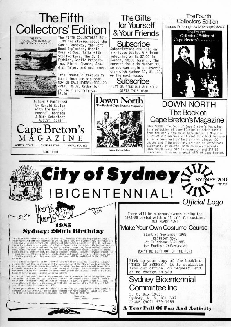 The Fifth Collectors' Edition THE FIFTH COLLECTORS' EDITION cy Caj')e Breton's The FIFTH COLLECTORS' EDI? TION has stories about the Canso Causeway, the Port Hood Explosion, Wishie Rose at Sea, Talks with Steelworkers, The C. B. Fiddler, Gaelic Precent- ing, Micmac Chants, Aca? dian Tales, and much more. _ It's Issues 25 through 29 ' bound into one big book. ;..> NOW ON SALE EVERYWHERE, OR '" " WRITE TO US. Order for yourself and friends. $6.50 Edited & Published by Ronald Caplan with the help of Bonnie Thompson & Ruth Schneider AUGUST 1983 Cape Breton's MAGAZINE WRECK COVE • CAPE BRETON • NOVA SCOTIA The Gifts for Yourself & Your Friends Subscribe Subscriptions are sold on a 4-issue basis. A 4-issue subscription is $7.00 in Canada, $8.00 foreign. The current issue is Number 33, so you can begin a subscrip? tion with Number 30, 31, 32, or the next issue. Subscribe LET US SEND OUT ALL YOUR GIFTS THIS YEAR! Down North The Book of Cape Breton's Magazine The Fourth Collectors' Edition Issues 19 through 24 (292 pages) $6.00 DOWN NORTH The Book of Cape Breton's Magazine DOWN NORTH: The Book of Cape Breton's Magazine selection of over 50 stories taken mostly from the early issues of Cape Breton's Magazine. A lot of our readers will want this book because it is a permanent collection with almost 400 photos and illustrations, printed on white book paper and, of course, with no advertisements. DOWN NORTH costs $12.95 paperback and $19.95 hardcover. It makes a great gift of Cape Breton. A'r>. SYC Cf f y of Sydney' Official Logo '-'2'' IBICENTENNIAL! Sydney 1985 sooth Birthday "GET INVOLVED." There will be numerous events during the 1984-85 period which will call for costume. GET READY NOW! Make Your Own Costume' Course starting September 1983 Register Now, or Telephone 539-1985 for Further Information DON'T BE LEFT OUT OF THE FUN! Pick up your copy of the booklet, "THIS IS SYDNEY." It is available from our office, on request, and at no charge to you. Sydney Bicentennial Committee Inc. p. 0. Box 1985, Sydney, N. S. BlP 6H7 PHONE (902) 539-1985 A Year Full Of Fun And Activity