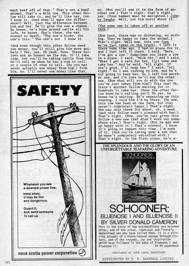 Published by Ronald Caplan on 1984/6/1 (291 reads)much beef off of that." That's not a beef animal, that's a milk cow. This other fel? low will take it, and he'll like her, too. I know it. (And what'11 make the differ? ence?) Well, just the difference between him and her. He'll give the cow a chance. He knows, he's been around cattle all his life, he knows. She's there, she was scared to death. "The cow's kicky, the cow's this." The cow's not, I know it, (And even though this other fellow owed you money, you'll still give him more ani? mals.) Yes, yes. Oh yeah. Sure. These fel? lows are as honest as the sun. It'll take time, but you'll be taking cattle from him. He'll call up when he has a cow to sell, or a couple of cows to sell. (So you may never actually see money from him.) From him, no. I'll never see money like that, SAFETY keep away, it may be live and dangerous. Guard it, and send someone to call us. nova scotia power corporation (6) no. (But you'll see it in the form of an? other cow.) That's right, that's right, yes. (Your banker must be delighted.) John? ny laughs: Well, let him worry about it. (The same cow is taken off at another farm.) (Now here, there was no dickering, no noth? ing. They're happy to take the animal.) That's right. Well now, this cow (one we've just taken on the truck), I left it there some time ago. I had no place for it, and I just left it there. I said, "Here, I've got a cow." Sometimes you leave a cow in a place. I said, "Milk her." And I said, "When I get a sale for her, I',11 come and take her." And he said, "All right. If she's good, I'll keep her." I said, "All right." So I was talking to him, and he's not going to keep her. So I left him anoth? er one, and I'm sure he'll buy the other one. (Now what will you do with the cow you've just taken from him?) This one? Oh, there's another fellow waiting for it. Somebody'11 take her. (Does the other fel? low know he's waiting yet?) Oh yes, he knows he's waiting. He's expecting me this evening. I told him I'd be there. (So now, this cow has been at one farm, but they weren't completely happy.) That's right. She was only there for about, oh, a week. (And this fellow wasn't pleased with her.) That's right. (Now, you've just given this fellow a new cow that didn't work out some? where else.) That's right. (But he may end up happy with it.) That's correct. I know it's going to happen this time. I'm sure of it. (And you're taking away a cow that he wasn't completely satisfied with.) That's ri-ght. In the first place, he's a- THE SPLENDOUR AND THE GLORY OF AN UNFOJ'GETTABLE SEAFARING ADVENTURE SCHOONER: BLUENOSE I AND BLUENOSE II BY SILVER DONALD CAMERON This is the story of two extraordinary and beloved ships, and of the proud, impetuous and fiercely determined men who have sailed them. It is a stir? ring account of a storm-tossed voyage through his? tory, and of the tragedy, joy and inspiration which have followed in the wake of Bluenose I and Bluenose II. $4.95 paperback AVAILABLE AT YOUR LOCAL NEWSSTAND DISTRIBUTED BY H. H. MARSHALL LIMITED