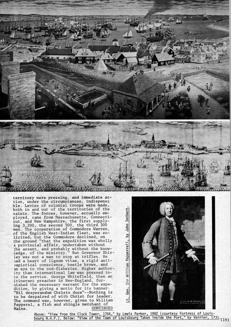 Published by Ronald Caplan on 1984/6/1 (336 reads)territory were pressing, and immediate ac? tion, under the circumstances, indispensa ble. Levies of colonial troops were made, both in and out of the territories of the saints. The forces, however, actually em? ployed, came from Massachusetts, Connecti? cut, and New Hampshire; the first supply? ing 3,200, the second 500, the third 300 men. The cooperation of Commodore Warren, of the English West-Indian fleet, was so? licited; but the Commodore declined, on the ground "that the expedition was wholly a provincial affair, undertaken without the assent, and probably without the know- Ledge, of the ministry." But Governor Shir- Ley was not a man to stop at trifles. He lad a heart of lignum vitae, a rigid anti- Dapistical conscience, beetle brows, and an eye to the cod-fisheries. Higher author? ity than international law was pressed in? to the service. George Whitefield, then an itinerant preacher in New-England, fur- aished the necessary warrant for the expe? dition, by giving a motto for its banner: "Nil desperandum Christo duce"--Nothing is to be despaired of with Christ for leader. The command was, however, given to William Pepperel, a fish and shingle merchant of Maine. CONTINUED Above: "View from the Clock Tower. 1744," by Lewis Parker. 1982 (courtesy Fortress of Louis? bourg N.H.P.). Below: "View of the Town of Louisbourg Taken inside the Port," by Verrier, 1731....