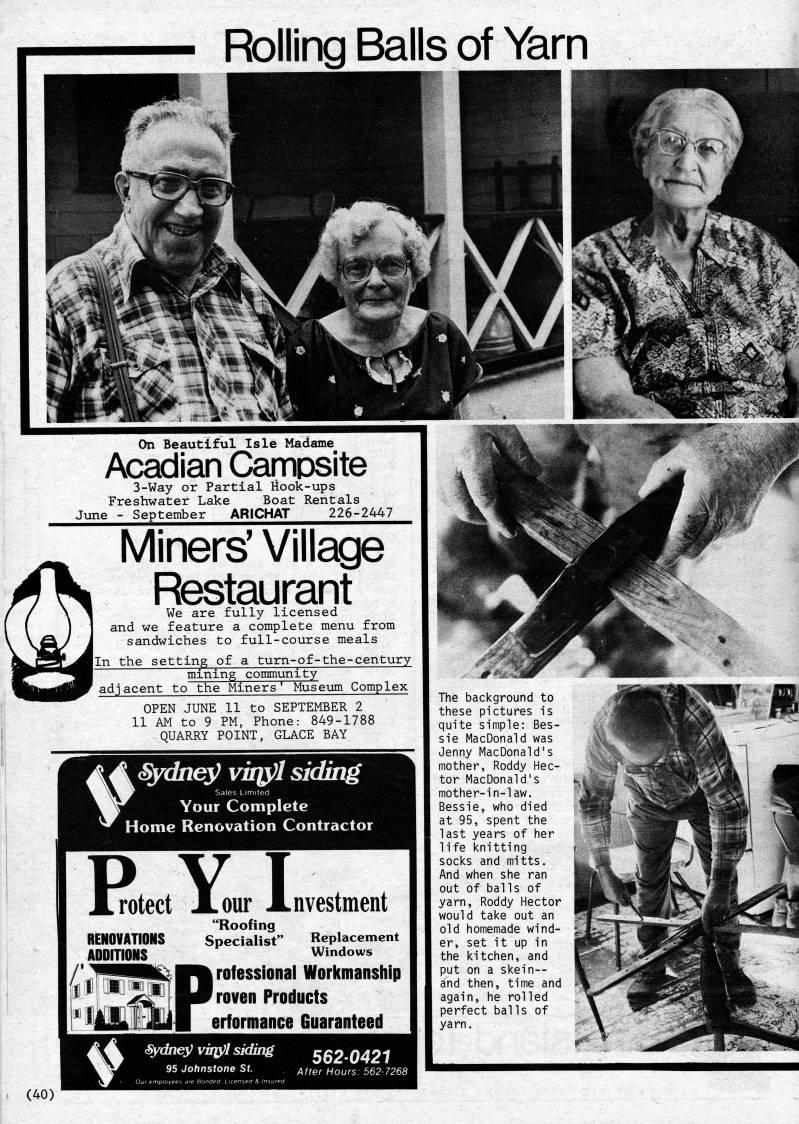 Published by Ronald Caplan on 1984/6/1 (587 reads)Rolling Balls of Yarn On Beautiful Isle Madame Acadian CarriDsite 3-Way or Partial Hook-ups Freshwater Lake Boat Rentals June - September ARICHAT 226-2447 Miners' Village Restaurant We are fully licensed and we feature a complete menu from sandwiches to full-course meals In the setting of a turn-of-the-century mining community adjacent to the Miners' Museum Complex OPEN JUNE 11 to SEPTEMBER 2 11 AM to 9 PM, Phone: 849-1788 QUARRY POINT, GLACE BAY Sydney! vit'l siding ' Sales Limited Your Complete Home Renovation Contractor P Y T Xrotect Xour X RENOVATIONS ADDITIONS "Roofing Specialist" nvestraent Replacement Windows rofessional Workmanship roven Products erformance Guaranteed (Sidney vHjyy siding 5620421 The background to these pictures is quite simple: Bes? sie MacDonald was Jenny MacDonald's mother, Roddy Hec? tor MacDonald's mother-in-law. Bessie, who died at 95, spent the last years of her life knitting socks and mitts. And when she ran out of balls of yarn, Roddy Hector would take out an old homemade wind? er, set it up in the kitchen, and put on a skein-- and then, time and again, he rolled perfect balls of yarn. (40)'