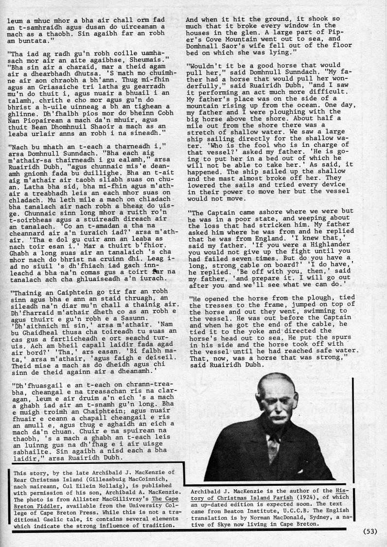 Published by Ronald Caplan on 1984/6/1 (237 reads)leim a mhuc mhor a bha air chall orm fad an t-samhraidh agus dusan do uirceanan a mach as a thaobh. Sin agaibh far an robh am buntata." "Tha iad ag radh gu'n robh coille uamha- sach mor air an aite agaibhse, Sheiimais." "Bha sin air a charaid, mar a theid agam air a dhearbhadh dhutsa. 'Smath mo chuimh- ne air aon chraobh a bh'ann. Thug mi-fhin agus an Griasaiche tri latha gu gearradh mu'n do thuit i, agus nuair a bhuail i an talamh, chrith e cho mor agus gu'n do bhrist a h-uile uinneag a bh an tighean a ghlinne. Dh'fhalbh pios mor do bheinn Cobh Nan Piopairean a mach da'n mhuir, agus thuit Bean Dhomhnuil Shaoir a mach as an leaba urlair anns an robh i na sineadh." "Nach bu mhath an t-each a thameadh i," arsa Domhnull Sunndach. "Bha each aig m'athair-sa thaimeadh i gu ealamh," arsa Ruairidh Dubh, "agus chunnaic mis'e dean- amh gniomh fada bu duillighe. Bha an t-ait aig m'athair air taobh sliabh suas on chu- an. Latha bha sid, bha mi-fhin agus m'ath? air a treabhadh leis an each mhor suas on chladach, Mu leth mile a mach on chladach bha tanalach air nach robh a bheag do uis- ge. Chunnaic sinn long mhor a ruith ro'n t-soirbheas agus a stuireadh direach air an tanalach. 'Co an t-amadan a tha na cheannard air a'n iuraich iad?' arsa m'ath? air. 'Tha e dol gu cuir ann an leaba as nach toir esan i.' Mar a thuirt b'fhior. Ghabh a long suas air an tanalaich 's cha mhor nach do bhrist na cruinn dhi. Leag i- ad no siuil 's dh'fhiach iad gach inn- leachd a bha na'n comas gus a toirt :fer na tanalach ach cha ghluaiseadh a'n iurach. "Thainig an Caiphtein go tir far an robh sinn agus bha e ann an staid thruagh, an sileadh na'n diar mu'n chall a thainig air. Dh'fharraid m'athair dheth co as an robh e agus thuirt e gu'n robh e a Sasunn. 'Dh'aithnich mi sin,' arsa m'athair. 'Nam bu Ghaidheal thusa cha toireadh tu suas an cas gus a fartlicheadh e ort seachd tur- uis. Ach am bheil capall laidir fada agad air bord?' 'Tha,' ars easan. 'Bi falbh ma- ta,' arsa m'athair, 'agus faigh e deiseil. Theid mise a mach as do dheidh agus chi sinn de theid againn air a dheanamh.' "Dh'fhuasgail e an t-each on chrann-trea- bha, cheangal e na treasachan ris na clar- agan, leum e air druim a'n eich 's a mach a ghabh iad air an t-snamh gu'n long. Bha e muigh troimh an Chaiphtein; agus nuair fhuair e ceann a chapall cheangail e ris an amull e, agus thug e aghaidh an eich a mach da'n chuan. Chuir e na spuirean na thaobh, 's a mach a ghabh an t-each leis an luinng gus na dh'fhag e i air uisge sabhailte. Sin agaibh a nisd each a bha laidir," arsa Ruairidh Dubh. This story, by the late Archibald J. MacKenzie of Rear Christmas Island (Gilleasbuig MacCoinnich, nach maireann, Cul Eilein Nollaig), is published with permission of his son, Archibald A. MacKenzie. The photo is from Allister MacGillivray's The Cape Breton Fiddler, available from the University Col? lege of Cape Breton Press. While this is not a tra? ditional Gaelic tale, it contains several elements which indicate the strong influence of tradition. And when it hit the ground, it shook so much that it broke every window in the houses in the glen. A large part of Pip? er's Cove Mountain went out to sea, and Domhnall Saor's wife fell out of the floor bed on which she was lying." "Wouldn't it be a good horse that would pull her," said Domhnull Sunndach. "My fa? ther had a horse that would pull her won? derfully," said Ruairidh Dubh, "and I saw it performing an act much more difficult. My father's place was on the side of a mountain rising up from the ocean. One day, my father and I were ploughing with the big horse above the shore. About half a mile out from the shore there was a stretch of shallow water. We saw a large ship sailing directly for the shallow wa? ter. 'Who is the fool who is in charge of that vessel?' asked my father. 'He is go? ing to put her in a bed out of which he will not be able to take her.' As said, it happened. The ship sailed up the shallow and the mast almost broke off her. They lowered the sails and tried every device in their power to move her but the vessel would not move. "The Captain came ashore where we were but he was in a poor state, and weeping about the loss that had stricken him. My father asked him where he was from and he replied that he was from England. 'I knew that,' said my father. 'If you were a Highlander you would not give up the fight until you had failed seven times. But do you have a long, strong cable on board?' 'I do have,' he replied. 'Be off with you, then,' said my father, 'and prepare it. I will go out after you and we'll see what we can do.' "He opened the horse from the plough, tied the tresses to the frame, jumped on top of the horse and out they went, swimming to the vessel. He was out before the Captain and when he got the end of the cable, he tied it to the yoke and directed the horse's head out to sea. He put the spurs in his side and the horse took off with the vessel until he had reached safe water. That, now, was a horse that was strong," said Ruairidh Dubh. Archibald J. MacKenzie is the author of the His? tory of Christmas Island Parish (1924), of which an up-dated edition is expected soon. The text came from Beaton Institute, U.C.C.B. The English translation is by Norman MacDonald, Sydney, a na? tive of Skye now living in Cape Breton. (53)