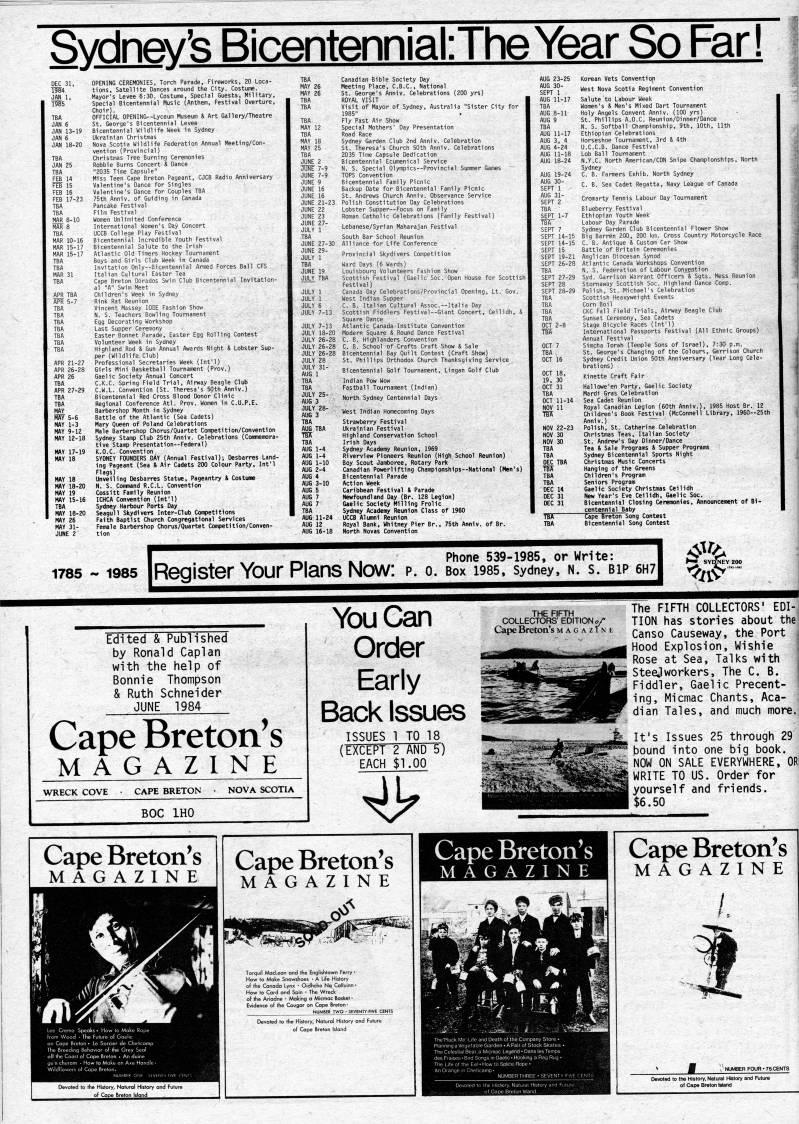 Published by Ronald Caplan on 1984/6/1 (181 reads)Sydney's BicentenniakTheYear So Far! OPENING CEREMONIES, ' Robbie Burn val Overture, lery/Theatre rm 15 FEB 16 FEB 17-23 Pancake Festiva Only-Bicentennia Armed Forces Ball APR 21-27 APR 26-28 APR 26 RW5-6 MY 1-3 HAY 9-12 MAY 12-18 Airway Beagle Club esa's 50th Anniv.) d Donor Clinic ,Y 18-20 ,Y 19 Y 15-16 per (Wildlife Club) Girls Mini Basketball Tour Gaelic Society Annual Cone Bicentennial Red Cross Bio Regional Conference Atl. P Battle of the Atlantic (Se Mary Queen of Poland Celeb Unveiling Desbarres Statue, Pageantry & Costume N. 5. Comnand R.C.L. Convention Cossitt Family Reunion ICHCA Convention (Int'l) Sydney Harbour Ports Day Seagull Skydivers Inter-Club Competitions Faith Baptist Church Congregational Services Female Barbershop Chorus/Quartet Competition/Conv( Sydney Garden C JUNE 22 JUNE 23 JUNE 27- JULY 26-28 I JULY 28 : JULY 31- . School of Crafts i Highland Conservation AUG 1-10 Boy S( AUG 3-10 Action estival & Parade Newfoundland Day (Br. 128 Legion) Gaelic Society Hilling Frolic Sydney Academy Reunion Class of 1960 UCCB Alumni Reunion Royal Bank, Whitney Pier Br., 75th Anniv. of Br. North Novas Convention • ;'/'- Cromarty Tennis Labou, TBA Blueberry Festival SEPT 1-7 Ethiopian Youth Week TBA Labour Day Parade SEPT 7 Sydney Garden Club Bii SEPT 14-15 Big Barren 200, 200 kr SEPT 14-15 C. B. Antique & Custor SEPT 15 Battle of Britain Zen SEPT 19-21 Anglican Diocesan Syni SEPT 26-28 Atlantic Canada Worksl SEPT 27-29 Syd.'Garrison Warrant' SEPT 28 Stornaway Scottish Soi SEPT 28-29 Polish, St. Michael's Mardi Gras Celebratioi Polish, St St. Andrew Day Dinner/Dance >aie urograms & Supper Programs Bicentennial Sports Night Children's Program Gaelic Society Christmas Ceilidh New Year's Eve Ceilidh, Gaelic See. Bicentennial Closing Ceremonies, Announcement of BI- 1785 - 1985 Register Your Plans Now: p. 0, Phone 539- Box 1985, 1985, or Write: Sydney, N. S. BIP 6H >- • SYlJ'EY200 Edited & Published by Ronald Caplan with the help of Bonnie Thompson & Ruth Schneider JUNE 1984 Cape Breton's MAGAZINE WRECK COVE CAPE BRETON • NOVA SCOTIA BOC IHO You Can Order Early Back Issues ISSUES 1 TO 18 (EXCEPT 2 AND 5) EACH $1.00 Cape Breton's OHc/- All Si ' The FIFTH COLLECTORS' EDI-. TION has stories about the- Canso Causeway, the Port Hood Explosion, Wishie Rose at Sea, Talks with Steelworkers, The C. B. Fiddler, Gaelic Precent- ing, Micmac Chants, Aca? dian Tales, and much more.! It's Issues 25 through 29l bound into one big book. NOW ON SALE EVERYWHERE, 0R| WRITE TO US. Order for yourself and friends. $6.50 1 Cape Breton's MAGAZINE Cape Breton's MAGAZINE Cape Breton's MAGAZINE CapeBreton's MAGAZINE