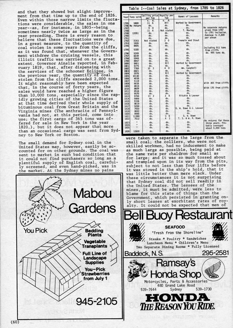 Published by Ronald Caplan on 1984/6/1 (143 reads)and that they showed but slight improve? ment from that time up to the end of 1826. Even within those narrow limits the flucta- tions were considerable, the sales in one year--as, for instance, in 1805--being sometimes nearly twice as large as in the year preceding. There is every reason to believe that these fluctuations were due, in a great measure, to the quantity of coal stolen in some years from the cliffs, as it was found that, whenever the Govern? ment withdrew the cruising vessels, this illicit traffic was carried on to a great extent. Governor Ainslie reported, in Feb? ruary 1819, that, after dispensing with the services of the schooner Eclipse, in the previous year, the quantity of coal stolen from the cliffs exceeded 2,000 tons. It might reasonably have been expected that, in the course of forty years, the sales would have reached a higher figure than 10,000 tons, especially since the rap? idly growing cities of the United States at that time derived their whole supply of bituminous coal from Great Britain and the Virginia mines (The anthracite of Pennsyl? vania had not, at this period, come into use; the first cargo of 365 tons was of? fered for sale in New York in the year 1820.), but it does not appear that more than an occasional cargo was sent from Syd? ney to New York or Boston. The small demand for Sydney coal in the United States may, however, easily be ac? counted for on other grounds. The coal was sent to market in such bad condition that it could not find purchasers so long as a plentiful supply of English coal, careful? ly screened, and even hand-picked, was in the market. At the Sydney mines no pains Table I • Coal Sales at Sydney, from 1785 to 1826 1 1 Year 1 1785 1 1786 1 1787 1 1788 1 1789 1 1790 1 1791 1 1792 1 1793 1 1794 1 1795 1 1796 1 1797 1 1798 1 1799 1 1800 1 1801 1 1802 1 1803 1 1804 1 1805 1 1806 1 1807 1 1808 1 1809 1 1810 1 1811 1 1812 1 1813 1 1814 1 1815 1 1816 1 1817 1 1818 1 1819 1 1820 1 1821 1 1822 1 1823 1 1824 1 1825 1 1826 Tons sold 1668 No return 13351 2143 1926 4405 5320 5249 6039 5948 8947 8401 5775 7769 6601 5976 10130 4938 5119 6616 8919 8609 8516 9570 9744 9856 9336 8619 9284 7920 8692 9980 11388 7512 12600 Selling price s. d. 11 6 do. 9 8 11 6 do. do. do. Not stated do. do. do. do. do. do. do. do. do. 10 3 do. do. do. do. do. do. do. do. do. do. 13 2 do. do. do. do. do. do. do. do. do. do. do. do. do. Royalty per s. d. Nil do. do. Not stated do. do. do. 3 0 do. do. do. do. do. do. do. Nil do. 4 0 do. Nil do. do. do. do. do. do. do. do. 3 8 do. do. do. do. do. do. do. 3 6 4 3 do. do. do. do. Names of Lessees Worked by Government do. do. T. Moxley do. do. do. Tremain and Stout do. do. do. do. do. do. do. Worked by Government do. Wm. Campbell do. Worked by Government do. do. do. do. do. do. do. do. Ritchie & Leaver do. do. do. do. G. W. Bown & J. Leaver do. do. G. W. Bown T. S. & W. R. Bown do. do. do. do. Remarks 1 No separate return 1 given from 1787 1 to 1791 inclusive 1 Average is 2,600 1 per annum 1 Including 911 tons 1 from cliffs 1 do. 995 tons do. I With 365 from clif 1 With 170 from clif 1 No returns for the e 1 three years. Pro- 1 bably averaged 1 about 9,000 tons 1 Mabou Gardens 945-2105 (60) were taken to separate the large from the small coal; the colliers, who were not skilled workmen, had no inducement to make as much large as possible, being paid at the same rate per chaldron for small as for large; and it was so much tossed about and trampled upon in its way from the pits, subject to not less than four lifts before it was stowed in the ship's hold, that it was little better than mere slack. Under these circimistances it is not surprising that Sydney coal did not sell readily in the United States. The lessees of the mines, it must be admitted, were less to blame for this state of things than the Government, which persisted in granting on? ly short leases at exorbitant rates of roy? alty. It could not be expected that men of Bell Buoy Restaurant SEAFOOD "Fresh from the Shoreline" ??' Steaks * Poultry * Sandwiches '71'ff'/> Luncheon Menu * Children's Menu Two Separate Dining Rooms * Fully Licensed Baddeck, N.S. 295-2581 Ramsay's '' Honda Shop Motorcycles, Parts & Accessories' 480 Grand Lake Road 539-7644 Sydney 539-1730 THeReasonYouRue.