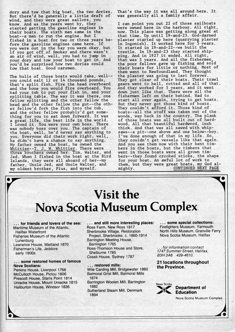 dory and tow that big boat, the two dories. But there'd be generally a little draft of wind, and they were great sailors, you know. And as the years went by, they started getting the gasoline engines in their boats. The sixth man came in the boat--a man to run the engine. But I fished in a boat for two or three years be? fore the gasoline engines came here. If you were out in the bay you were okay, but if you got off'of Smokey and there wasn't an air of wind, well, you had to jump in your dory and tow your boat to get in. And you'd be surprised how two dories could tow that boat. Good oarsmen. The hulls of those boats would take, well-- you could salt 12 or 14 thousand pounds, that's split fish. Fire the head overboard and the bone you would fire overboard. You had your tub to put your fish in, and your splitting table. The way it was there, one fellow splitting and the other fellow the head and the other fellow the gut--the oth? er fellow'd fork the fish into the tub, and the other fellow probably'd get some? thing for you to eat down forward. It was a great life, the best life in the world. I loved it. You were your own boss. There was nobody boss over you. The captain of the boat, well, he'd never say anything to you. Everyone did their work right; well, he didn't have a chance to say anything. My father owned the boat, he owned the Whittier--T. J. W. Whittier. There were three brothers owned her: Tim, Walter, and Jed. When I fished in the boat at the Bird Islands, they were all aboard of her--my father. Uncle Jed, and Uncle Walter, and my oldest brother, Pius, and myself. That's the way it was all around here. It was generally all a family affair. I can point you out 22 of those sailboats were owned here in the harbour. All right, now. This place was getting along great at that time. Up until 19-and-23. God-darned plaster started up here (quarrying plaster in Ingonish). It worked here for 5 years. It started in 19-and-22--we built the trestle. In 19-and-23 they started ship? ping. And in 1927 it ended. All right, that was 5 years. And all the fishermen, the poor fellows gave up fishing and sold their boats for little or nothing. Most of them went to Newfoundland. They thought the plaster was going to last forever. They got clear of their boats. Their trawl gears went to hell, rotted and all of that. And they worked for 5 years, and it went down just like that. There were all the fishermen left on their behind. Had to start all over again, trying to get boats. But they never got those kind of boats. They couldn't afford it. Those kind of boats--all the stuff was taken out of the woods, way back in the country. The plank of those boats was all built out of hard? wood. All that beautiful hardwood, inch thick. And that was all sawed with whip- saws--a pit--one above and one below--boy. I've done enough of that in my life. So, they couldn't get vessels like that again. And you see them now with their bent tim? bers in the boats, but the timbers that went in those boats were all grown tim- bers--they found crooked sticks, the shape for your boat. An awful lot of work to them, but they were great b.oats, my God al? mighty . CONTINUED NEXT PAGE r Visit the A' Nova Scotia Museum Complex ... for friends and lovers of the sea: Maritime Museum of the Atlantic, Halifax Waterfront Fisheries Museum of the Atlantic Lunenburg Lawrence House, Maitland 1870 Fisherman's Life, Jeddore early 1900s ... some restored liomes of famous Nova Scotians: Perkins House, Liverpool 1766 McCulloch House, Pictou 1806 Prescott House, Starrs Point 1814 Uniacke House, Mount Uniacke 1815 Haliburton House, Windsor 1836 L ... and still more interesting places Ross Farm, New Ross 1817 Sherbrooke Village, Restoration Project, Sherbrooke, c. 1860-1914 Barrington Meeting House, Barrington 1765 Ross-Thomson House and Store, Shelburne 1785 Cossit House, Sydney 1787 ... restored mills: Wile Carding Mill, Bridgewater 1860 Balmoral Grist Mill, Balmoral Mills 1874 Barhngton Woolen Mill, Barrington 1882 Sutherland Steam Mill, Denmark 1894 ... some special collections: Firefighters Museum, Yarmouth North Hills Museum, Granville Ferry Nova Scotia Museum, Halifax ... for information contact 1747 Summer Street, l-lalifax, B3H3A6 429-4610. 21 locations throughout the Province. . '[?1' Department of ''K' Education Nova Scotia Museum Complex J