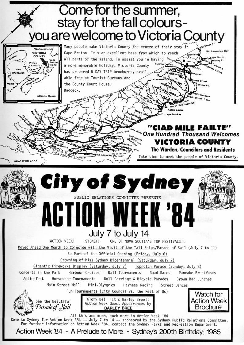 Published by Ronald Caplan on 1984/6/1 (155 reads)Come for the summer, stay for the fall colours- you are welcome to Victoria County Many people make Victoria County the centre of their stay in Cape Breton. It's an excellent base from which to reach all parts of the island. To assist you in having a more memorable holiday, Victoria County has prepared 5 DAY TRIP brochures, avail-' able free at Tourist Bureaus and the County Court House, Baddeck. St. Lawr?nco Bay f ape North Monav Pt. ' • t Brook ' Whit* Pt. '""??' Cov, , mao""*' Keltic Lod0? ''CIAD MILE FAILTE'' One Hundred Thousand Wefcomes VICTORIA COUNTY The Warden, Councilors and Residents Take time to meet the people of Victoria County. City o# Sydney PUBLIC RELATIONS COMMITTEE PRESENTS ACTION WEEK '84 July 7 to July 14 ACTION WEEK! SYDNEY! ONE OF NOVA SCOTIA'S TOP FESTIVALS!! Moved Ahead One Month to Coincide with the Visit of the Tall Ships/Parade of Sail (July 7 to 11) Be Part of the Official Opening (Friday, July 6) Crowning of Miss Sydney Bicentennial (Saturday, July 7) Gigantic Fireworks Display (Saturday, July 7) Topnotch Parade (Sunday, July 8) Concerts in the Park Harbour Cruises Ball Tournaments Road Races Pancake Breakfasts Actionfest Horseshoe Tournaments Doll Carriage & Bicycle Parades Brown Bag Lunches Main Street Mall Mini-Olympics Harness Racing Street Dances Fun Tournaments (City Council vs. the Rest of Us) See the Beautiful T'arade of'ail Glory Be! It's Barley Bree!! Action Week Guest Appearances by BARLEY BREE Watch for Action Week Brochure All this and much, much more in Action Week '84 Come to Sydney for Action Week '84 -- July 7 to 14 -- sponsored by the Sydney Public Relations Committee. For further information on Action Week '84, contact the Sydney Parks and Recreation Department. Action Week '84 ~ A Prelude to More ~ Sydney's 200th Birthday: 1985