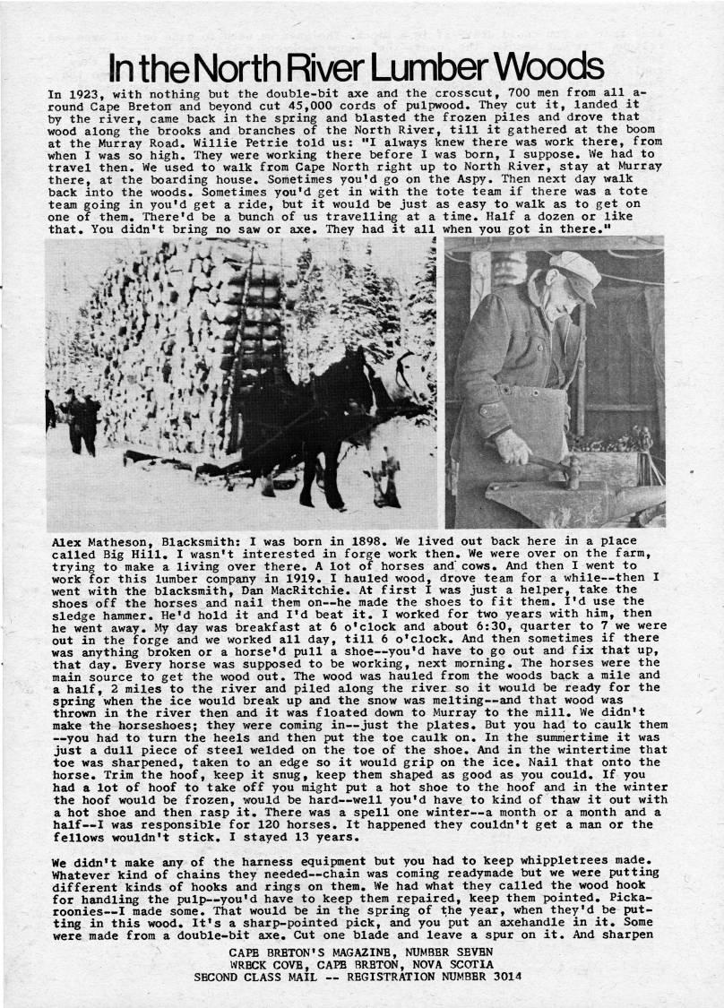 Published by Ronald Caplan on 1974/3/1 (5313 reads)In the North River Lumber Woods In 1923, with nothing but the double-bit axe and the crosscut, 700 men from all a- round Cape Breton and beyond cut 45,000 cords of pulpwood. They cut it, landed it by the river, came back in the spring and blasted the frozen piles and drove that wood along the brooks and branches of the North River, till it gathered at the boom at the Murray Road. Willie Petrie told us: "I always knew there was work there, from when I was so high. They were working there before I was born, I suppose. We had to travel then. We used to walk from Cape North right up to North River, stay at Murray there, at the boarding house. Sometimes you'd go on the Aspy. Then next day walk back into the woods. Sometimes you'd get in with the tote team if there was a tote team going in you'd get a ride, but it would be just as easy to walk as to get on one of them, There'd be a bunch of us travelling at a time. Half a dozen or like that. You didn't bring no saw or axe. They had it all when you got in there." 'a?-'::';-?' Alex Matheson, Blacksmith: I was born in 1898. We lived out back here in a place called Big Hill, I wasn't interested in forge work then. We were over on the farm, trying to make a living over there. A lot of horses and' cows. And then I went to work for this lumber company in 1919. I hauled wood, drove team for a while • then I went with the blacksmith, Dan MacRitchie. At first I was just a helper, take the shoes off the horses and nail them on • he made the shoes to fit them. I'd use the sledge hammer. He'd hold it and I'd beat it. I worked for two years with him, then he went away. My day was breakfast at 6 o'clock and about 6:30, quarter to 7 we were out in the forge and we worked all day, till 6 o'clock. And then sometimes if there was anything broken or a horse'd pull a shoe • you'd have to go out and fix that up, that day. Every horse was supposed to be working, next morning. The horses were the main source to get the wood out. The wood was hauled from the woods back a mile and a half, 2 miles to the river and piled along the river so it would be ready for the spring when the ice would break up and the snow was melting • and that wood was thrown in the river then and it was floated down to Murray to the mill. We didn't make the horseshoes; they were coming in • just the plates. But you had to caulk them • you had to turn the heels and then put the toe caulk on. In the summertime it was just a dull piece of steel welded on the toe of the shoe. And in the wintertime that toe was sharpened, taken to an edge so it would grip on the ice. Nail that onto the horse. Trim the hoof, keep it snug, keep them shaped as good as you could. If you had a lot of hoof to take off you might put a hot shoe to the hoof and in the winter the hoof would be frozen, would be hard • well you'd have to kind of thaw it out with a hot shoe and then rasp it. There was a spell one winter • a month or a month and a half • I was responsible for 120 horses. It happened they couldn't get a man or the fellows wouldn't stick. I stayed 13 years. We didn't make any of the harness equipment but you had to keep Whippletrees made. Whatever kind of chains they needed • chain was coming readymade but we were putting different kinds of hooks and rings on them. We had what they called the wood hook for handling the pulp • you'd have to keep them repaired, keep them pointed, Picka- roonies • I made some. That would be in the spring of the year, when they'd be put? ting in this wood. It's a sharp-pointed pick, and you put an axehandle in it. Some were made from a double-bit axe. Cut one blade and leave a spur on it. And sharpen CAPE BRETON'S MAGAZINE, NUMBER SEVEN WRECK COVE, CAPB BRETON, NOVA SCOTIA SECOND CLASS MAIL • REGISTRATION NUMBER 3014